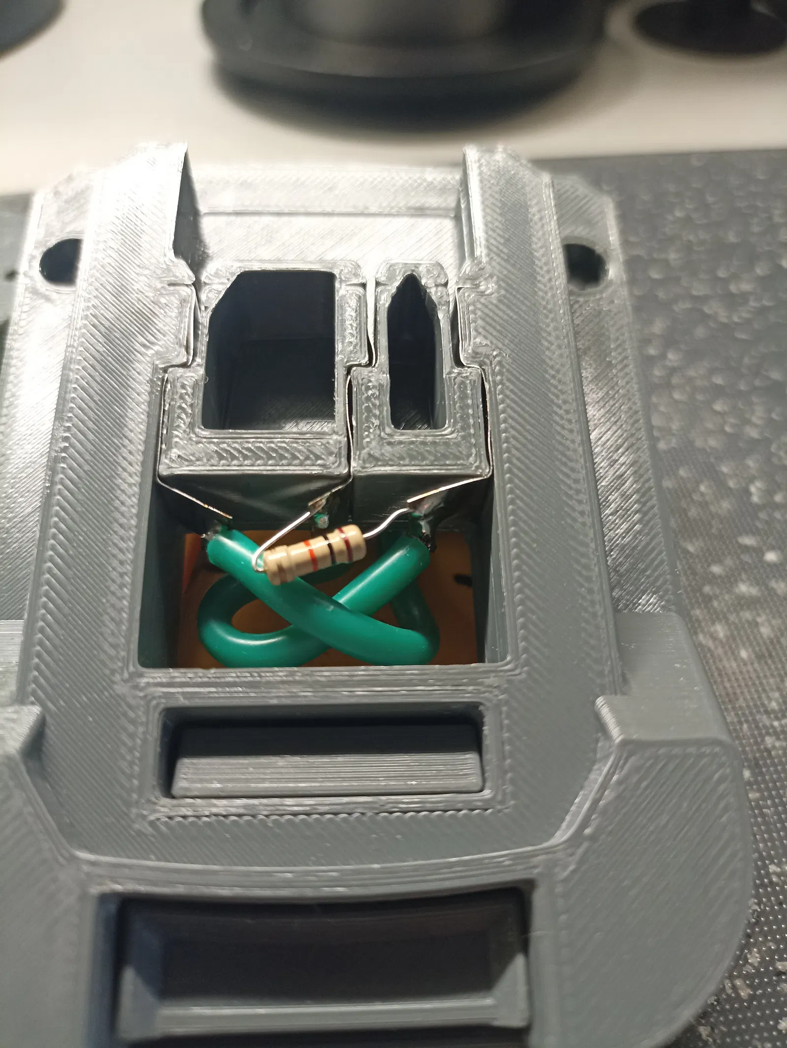 Nhìn vào hình ảnh là các bác có thể hiểu ngay cách lắp ráp. Về phần tiếp điểm, mình dùng băng niken dày 0.12mm, bọc cả hai mặt nhưng cũng không nhất thiết phải làm vậy. Lò xo đường kính khoảng 5.5mm/18mm, 4 ốc vít phi 4mm/9.5mm, 4 ốc vít phi 2.5mm/7mm. Ở phần đế cắm Parkside, các bác nhớ lắp thêm điện trở 10k vào giữa tiếp điểm T và -, đây là linh kiện thay thế cảm biến nhiệt nên các bác chú ý đừng để máy quá nóng nhé.