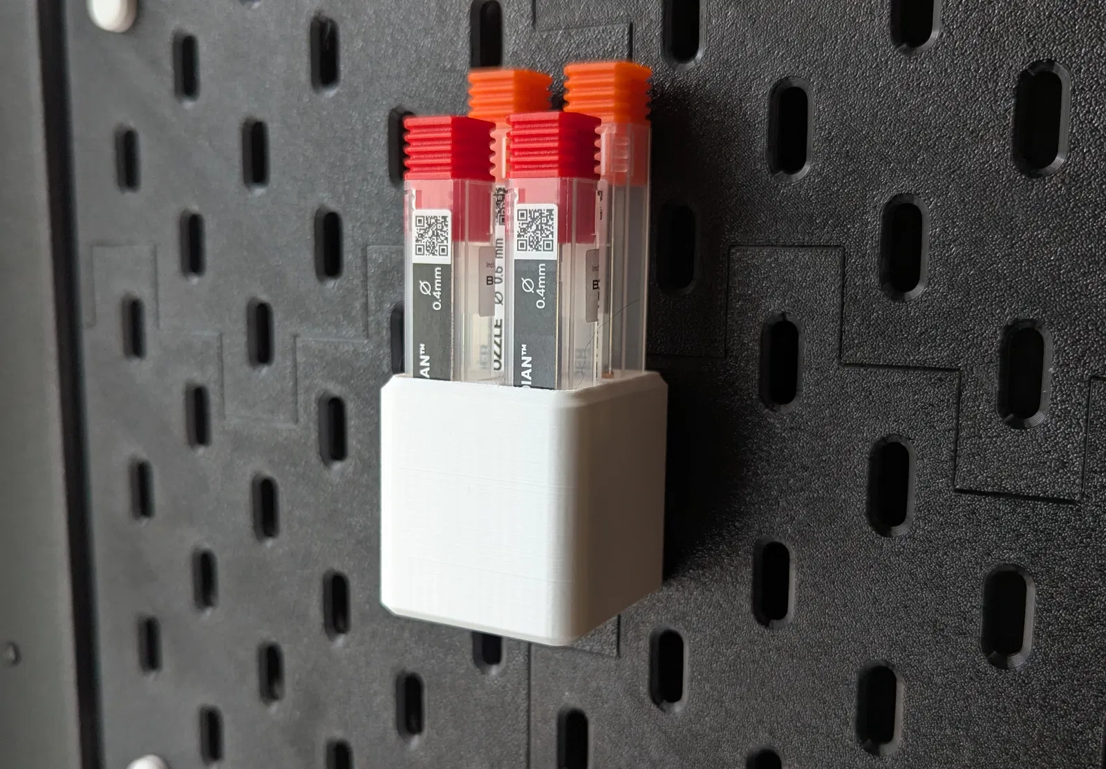 Giá đỡ đầu phun Nextruder dành cho bảng pegboard IKEA SKADIS. Phụ kiện này giúp bạn cất giữ tối đa 4 đầu phun cùng hộp đựng gốc một cách gọn gàng và ngăn nắp trên bảng công cụ của mình.