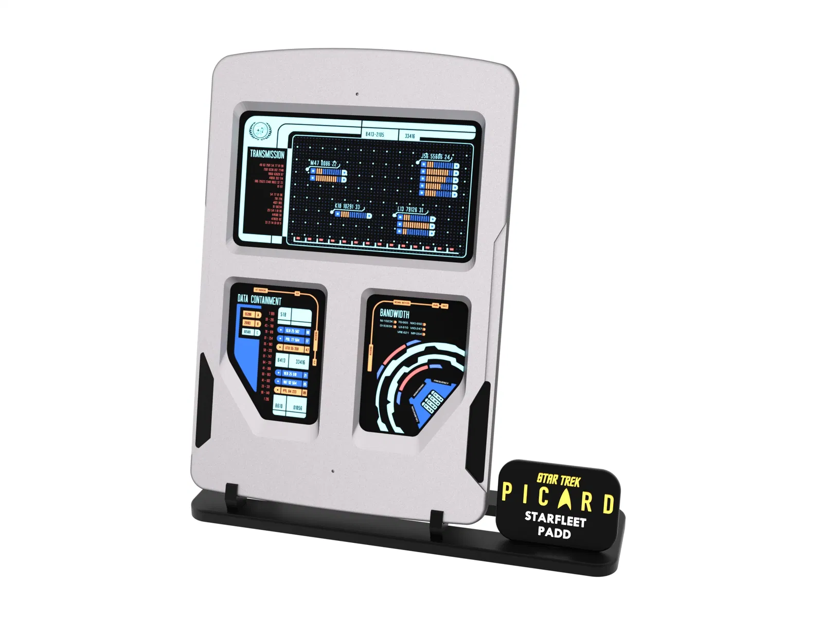 Đây là thiết bị PADD lớn xuất hiện trong các phân cảnh hồi tưởng của Picard và Raffi. Sản phẩm có phần màn hình hiển thị có thể thay đổi được. Các hình ảnh đồ họa được đính kèm dưới dạng tệp PDF. Bạn nên in ở kích thước gốc. Đế trưng bày cũng đã được bao gồm. Mua bản in của mẫu này: Ancient Stone Inspirations - https://ancientstoneinspirations.com/product/star-trek-picard-season-1-personal-access-display-device-padd-cosplay-fan-art-replica-prop/ max3dfactory (khu vực Đức) - https://www.ebay.de/usr/max3dfactory