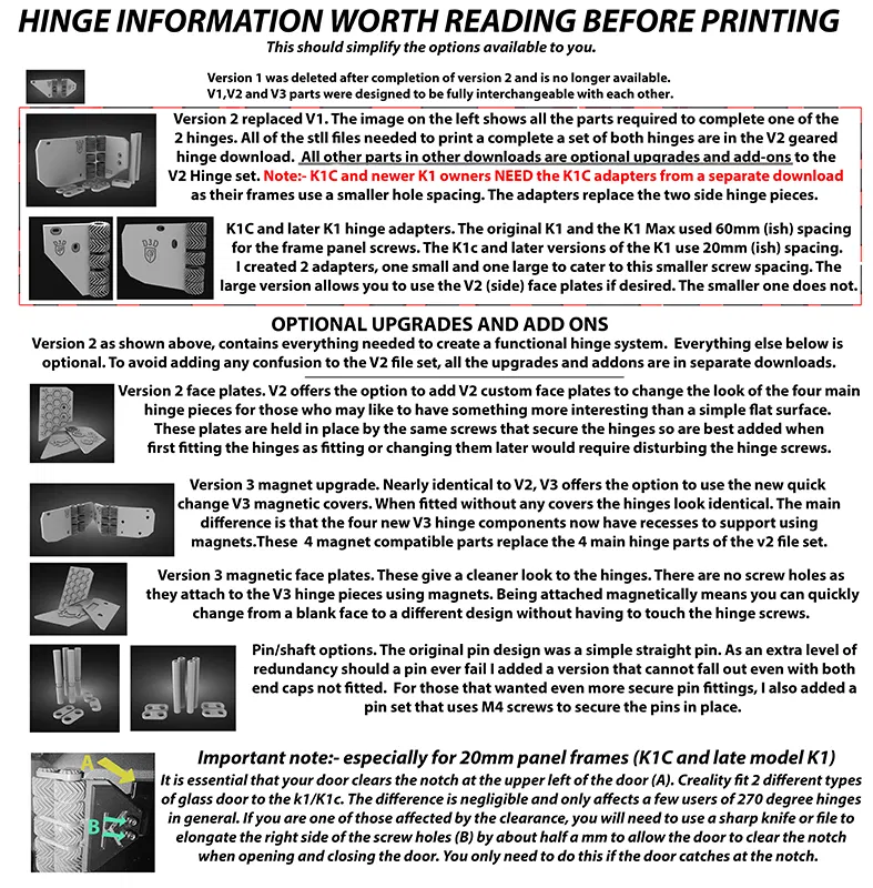 Vì các bản lề này được bảo vệ bản quyền, 'C3D Garage' đã hỏi liệu mình có thể chia sẻ bản làm lại của chi tiết bản lề bên dưới với tính năng để khay in trên K1C hay không. Đây là một tùy chọn hữu ích và tốt hơn phiên bản mình đang dùng trên con Max (phiên bản mình chưa phát hành chỉ dành cho kính dày cộng với một tấm flex và chỉ dành cho dòng Max). Thay vì mất công thiết kế lại, mình đã đồng ý cho bạn ấy remix lại cho K1 và K1C, anh em có thể xem ở đây