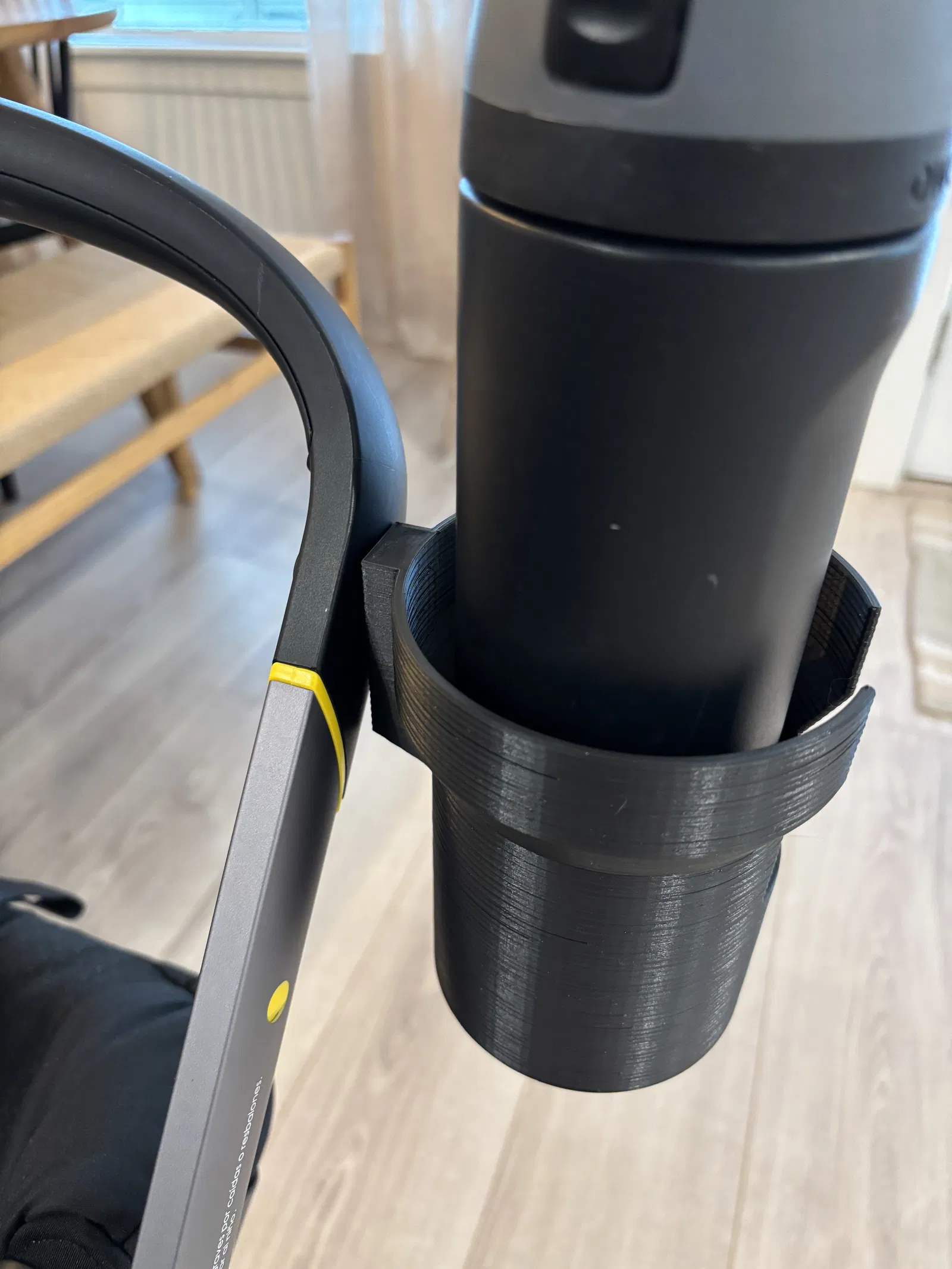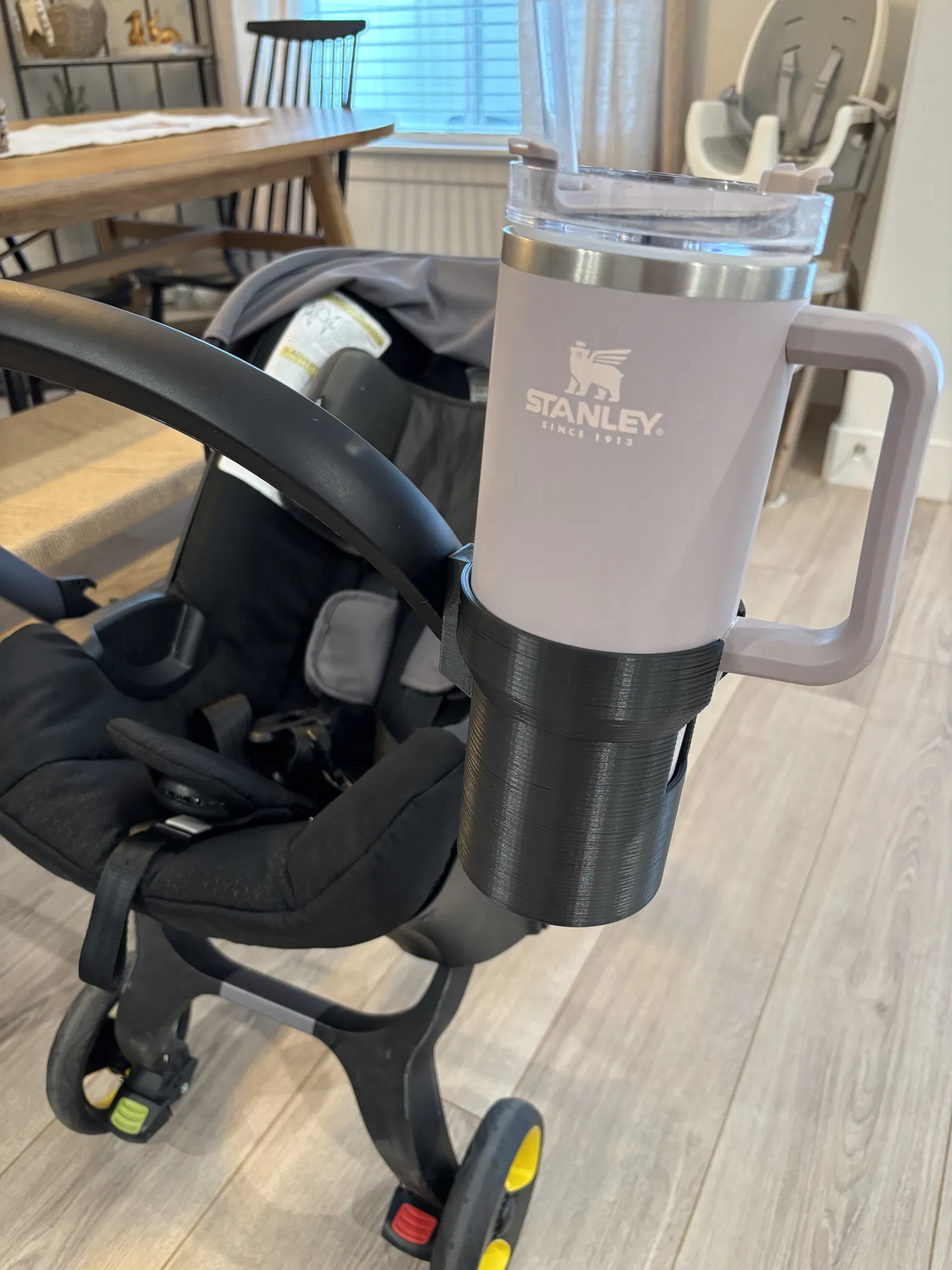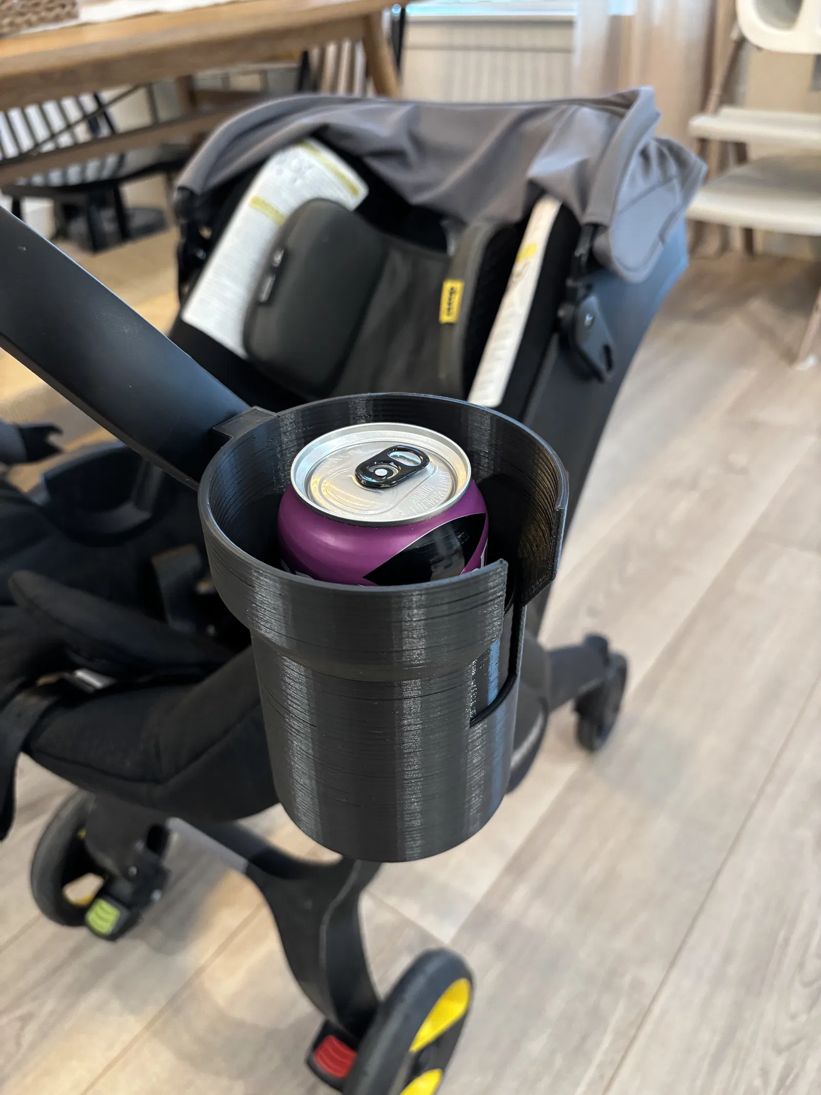 Giá đỡ cốc cho xe đẩy Doona. Thiết kế này có thể chứa được các loại bình nước lớn kiểu bình giữ nhiệt nhờ phần rãnh để quai cầm, hoặc cũng dùng được cho các loại chai/lon nhỏ hơn.