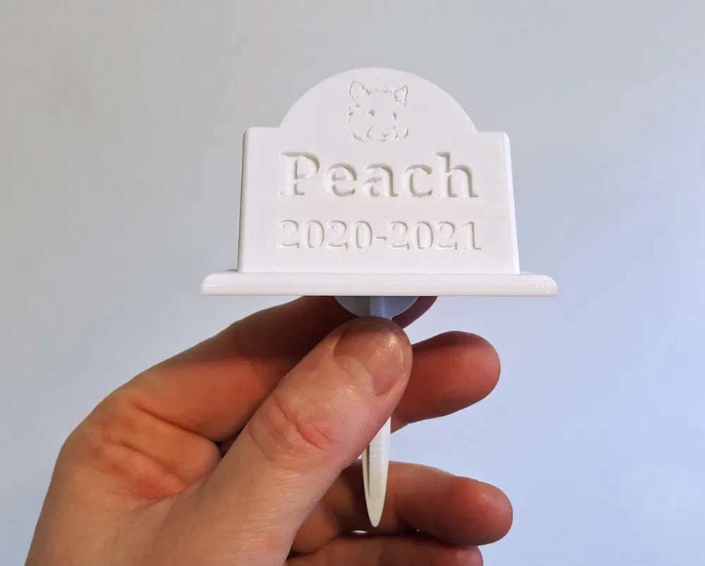 Mẫu bia mộ nhỏ gọn cho thú cưng như chuột hamster, đi kèm cọc cắm đất tiện lợi. File bao gồm cả bản tùy chỉnh và bản trống để bạn tự thêm tên, ngày tháng hoặc hình ảnh theo ý thích. Thiết kế dễ in, không cần hỗ trợ (supports).