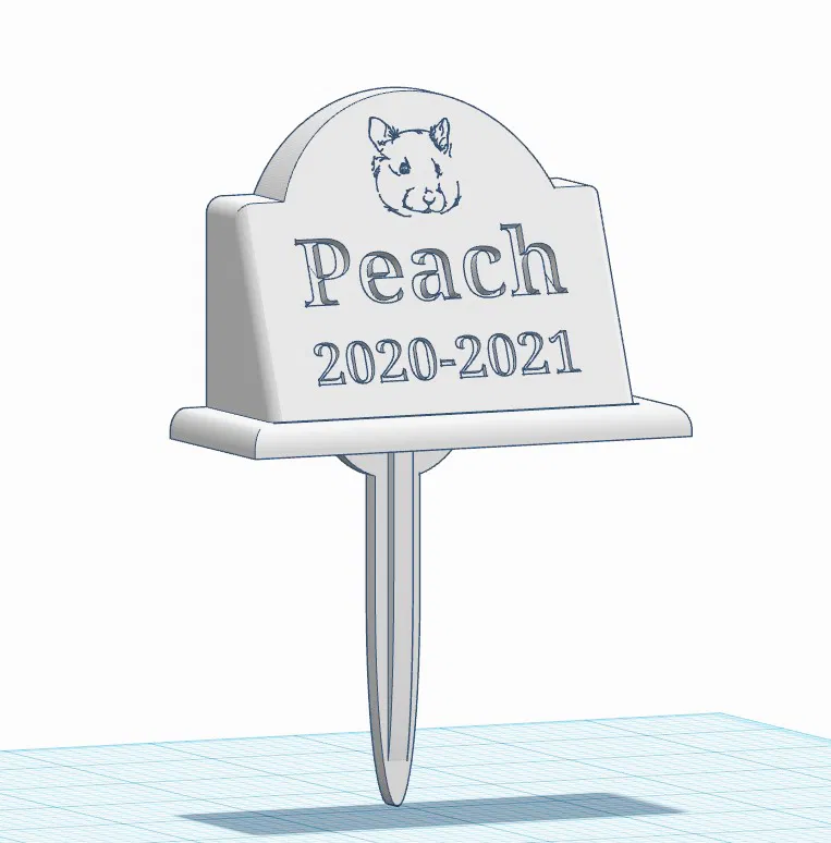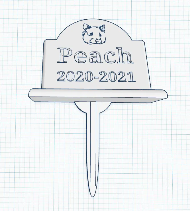 Đây là mẫu bia mộ đơn giản dành cho chuột hamster hoặc các thú cưng nhỏ khác. Thiết kế có kèm hình đầu chuột hamster (hoặc tùy chọn không hình) và một cọc cắm cỏ tích hợp để cố định xuống đất. Mình đã gửi kèm một phiên bản trống (không tên, không ngày tháng) chỉ có hình đầu hamster, và một phiên bản hoàn toàn trống (không chữ, không hình) để các bạn có thể tự thêm nội dung hoặc hình ảnh tùy ý nếu biết sử dụng phần mềm thiết kế. Bề mặt bia mộ được tạo góc nghiêng 22.5 độ. Bạn chỉ cần tạo chữ hoặc hình ảnh, chỉnh góc và chèn vào mặt bia mộ. Trong hầu hết các ứng dụng thiết kế, bạn có thể đặt mặt bia mộ làm mặt phẳng làm việc (workplane) để đặt chữ lên rất dễ dàng. Mặc dù mẫu minh họa đã được cá nhân hóa với hình ảnh, tên và ngày tháng, mình vẫn đăng lên để chia sẻ, biết đâu lại tạo cảm hứng cho bạn làm một mẫu tương tự cho thú cưng của mình.