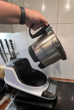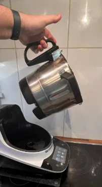 Những ai sở hữu nồi Bosch Cookit chắc hẳn đều biết cảm giác này: Khi bạn muốn lấy bột ra khỏi chiếc nồi nặng nề, bạn lại thiếu mất một bàn tay. Bạn chỉ có thể giữ nồi bằng hai quai. Sẽ thật tiện lợi nếu nồi có một cái tay cầm đối diện với miệng rót.