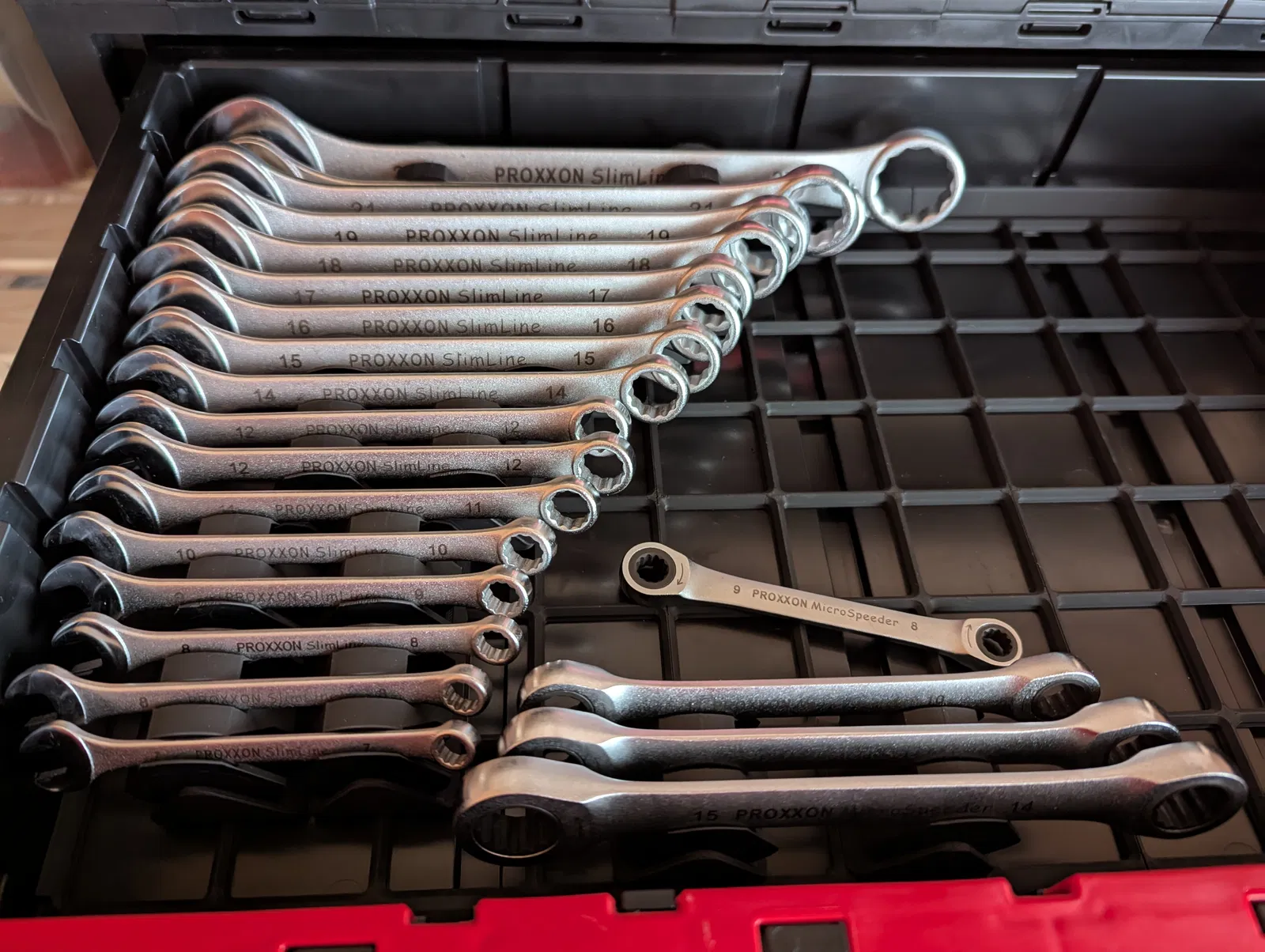 - Cỡ nhỏ nhất chứa 3 cờ-lê mỗi ô, phù hợp từ khoảng 6mm đến tầm 20mm.