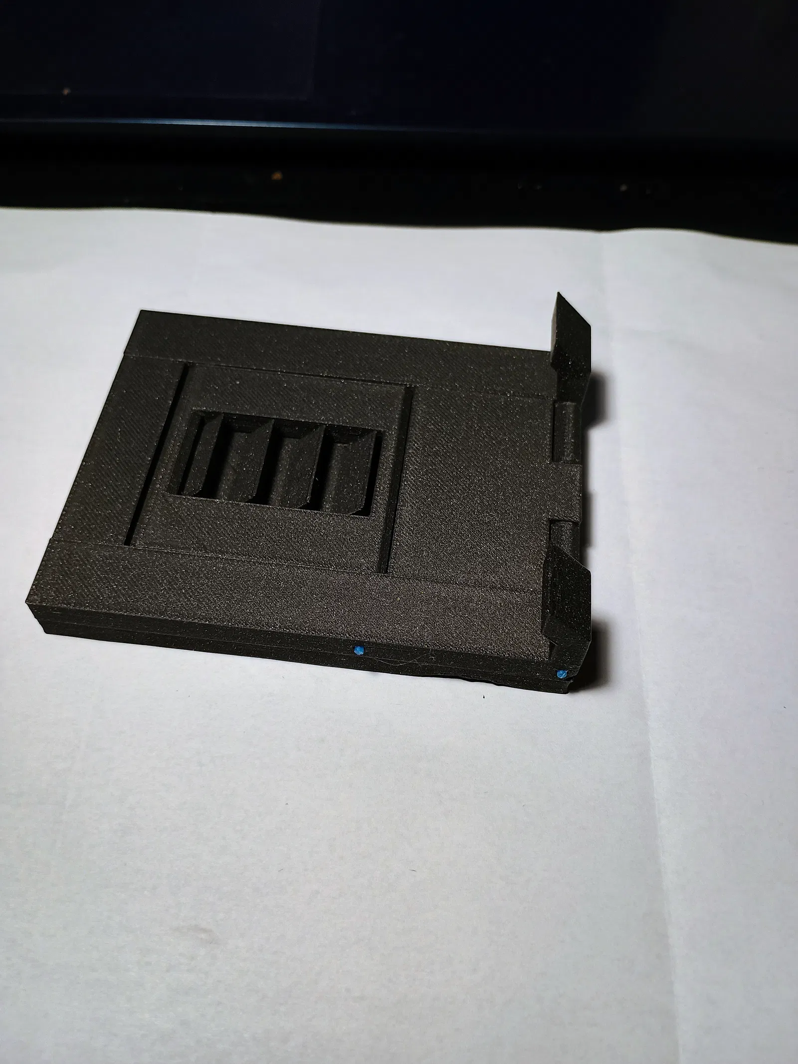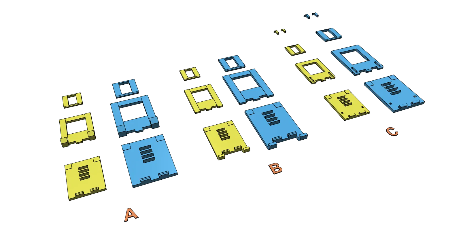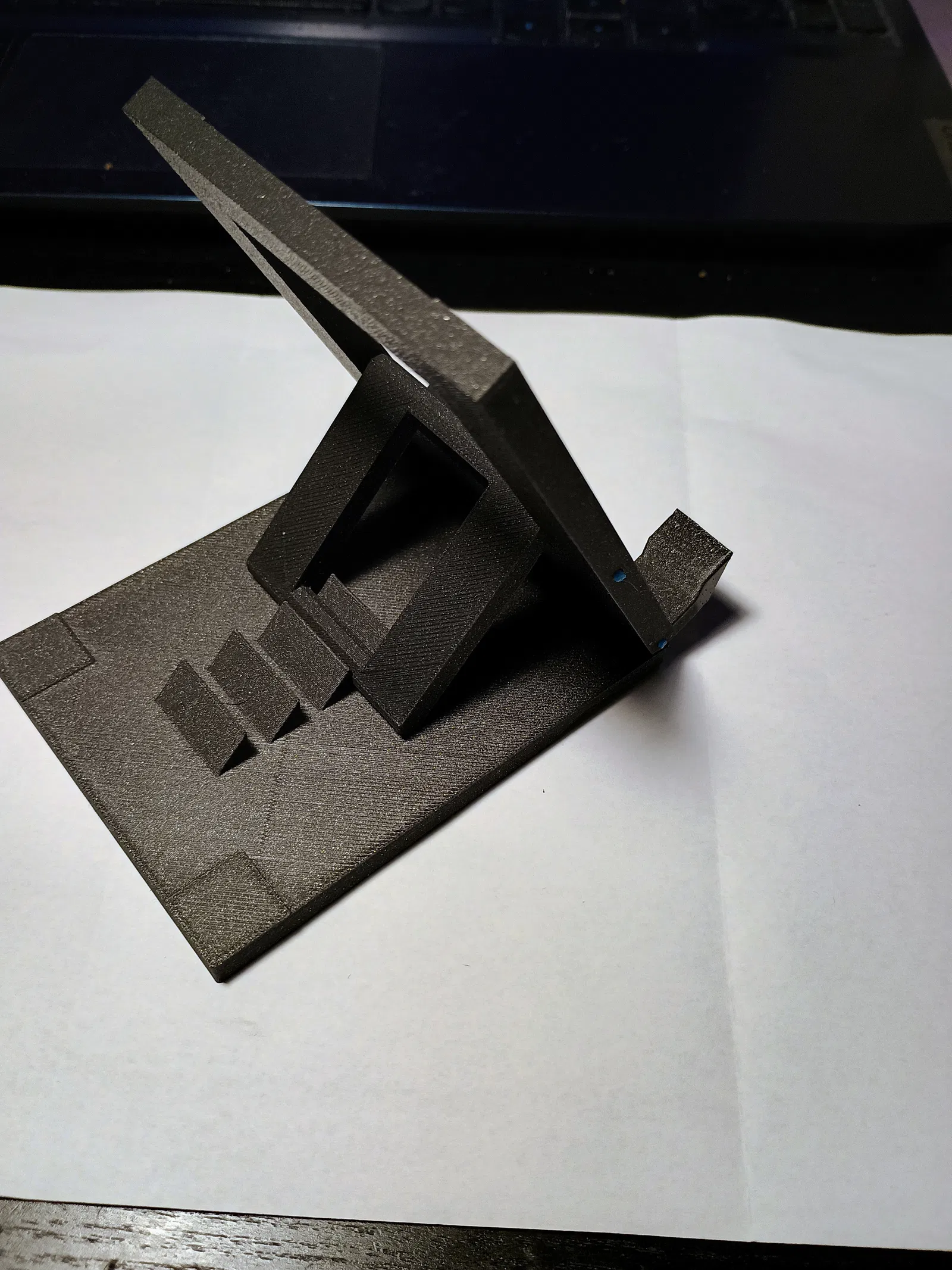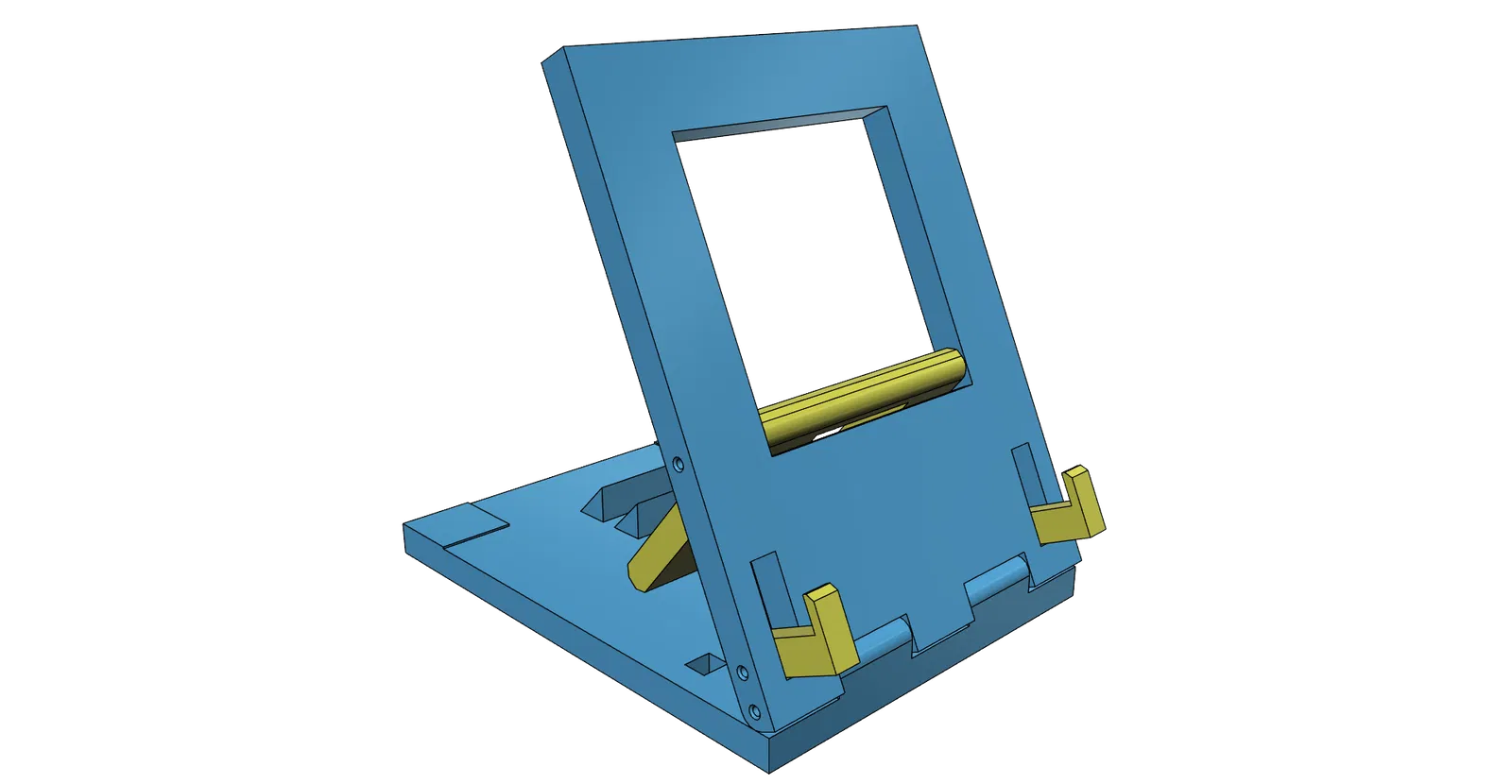 Kích thước độ sâu 104 (bản lớn 135) x chiều rộng 80 (bản lớn 104) x chiều cao 95 (bản lớn 110) mm. Đối với các trục, anh em hãy dùng chính đoạn sợi nhựa (filament) để làm chốt. Lỗ trục có đường kính 2.2mm. Độ dày tối đa cho máy tính bảng là 10mm. Lượng nhựa cần dùng khoảng 20m (bản lớn 33m). Đã kiểm nghiệm in bằng nhựa PLA với thông số layer 0.2mm, random seam. Nên sử dụng chiều cao lớp in thấp để đạt kết quả tốt nhất. Phiên bản đơn giản: Giá đỡ điện thoại: