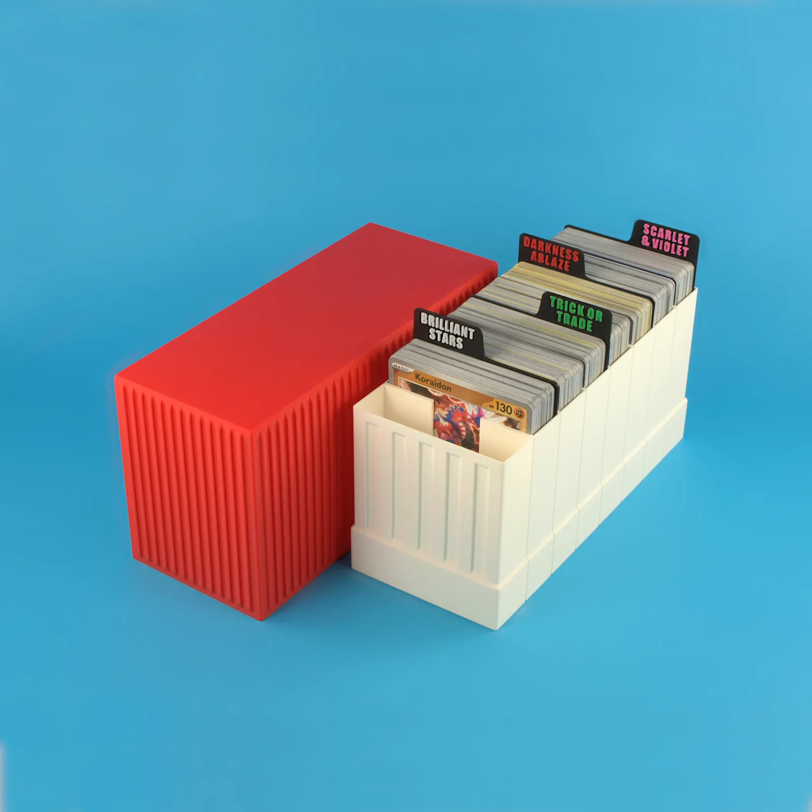 Giải pháp lưu trữ thẻ bài cực nhanh với 'vase mode', tiết kiệm nhựa. Hộp có 8 ngăn chứa tới 400 thẻ (Pokémon, MTG, v.v.), giúp thẻ đứng vững và phân loại dễ dàng. Đi kèm tùy chọn nhãn và nhiều kích cỡ.