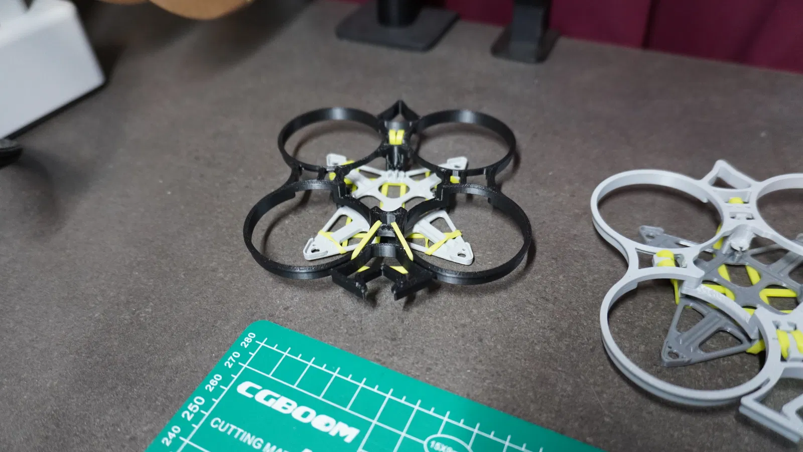 Phần bảo vệ cánh quạt (propeller guard) không được gắn vào khung dưới bằng ốc vít như thông thường mà được cố định bằng dây thun, như trong hình minh họa. Viên pin LiPo cũng được giữ cố định bằng dây thun.