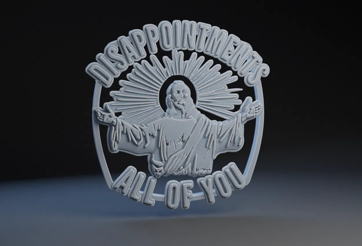Một mẫu in 3D hài hước với dòng chữ "Dissapoinments All of You". Tác phẩm này được tạo ra bằng kỹ thuật displacement với Depth Map trong phần mềm Blender, rất thích hợp để làm tranh treo tường hoặc sticker đầy tính châm biếm.