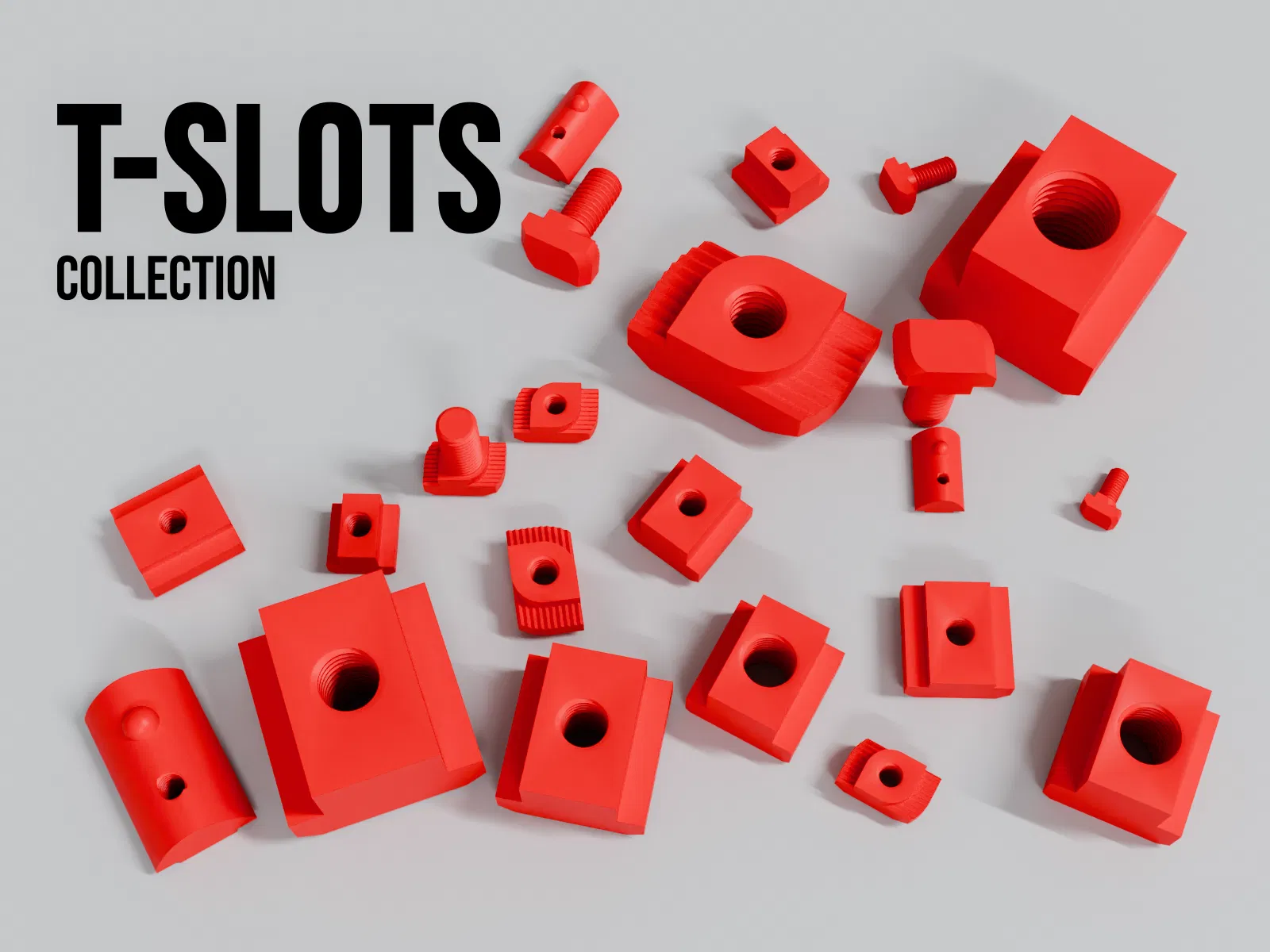 Bộ sưu tập các chi tiết T-Slots bao gồm đai ốc, bu lông và các khe kết nối. Hy vọng bộ tài liệu này hữu ích cho công việc của các bạn. Mình vẫn đang tiếp tục hoàn thiện, nếu có góp ý gì xin hãy cho mình biết nhé.