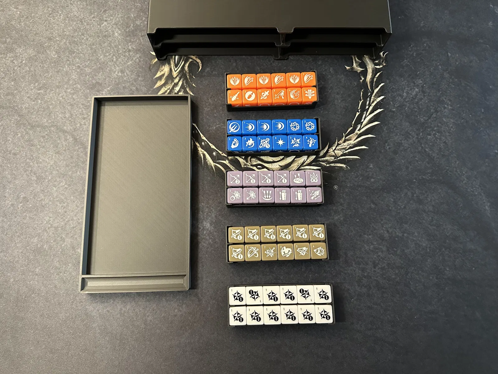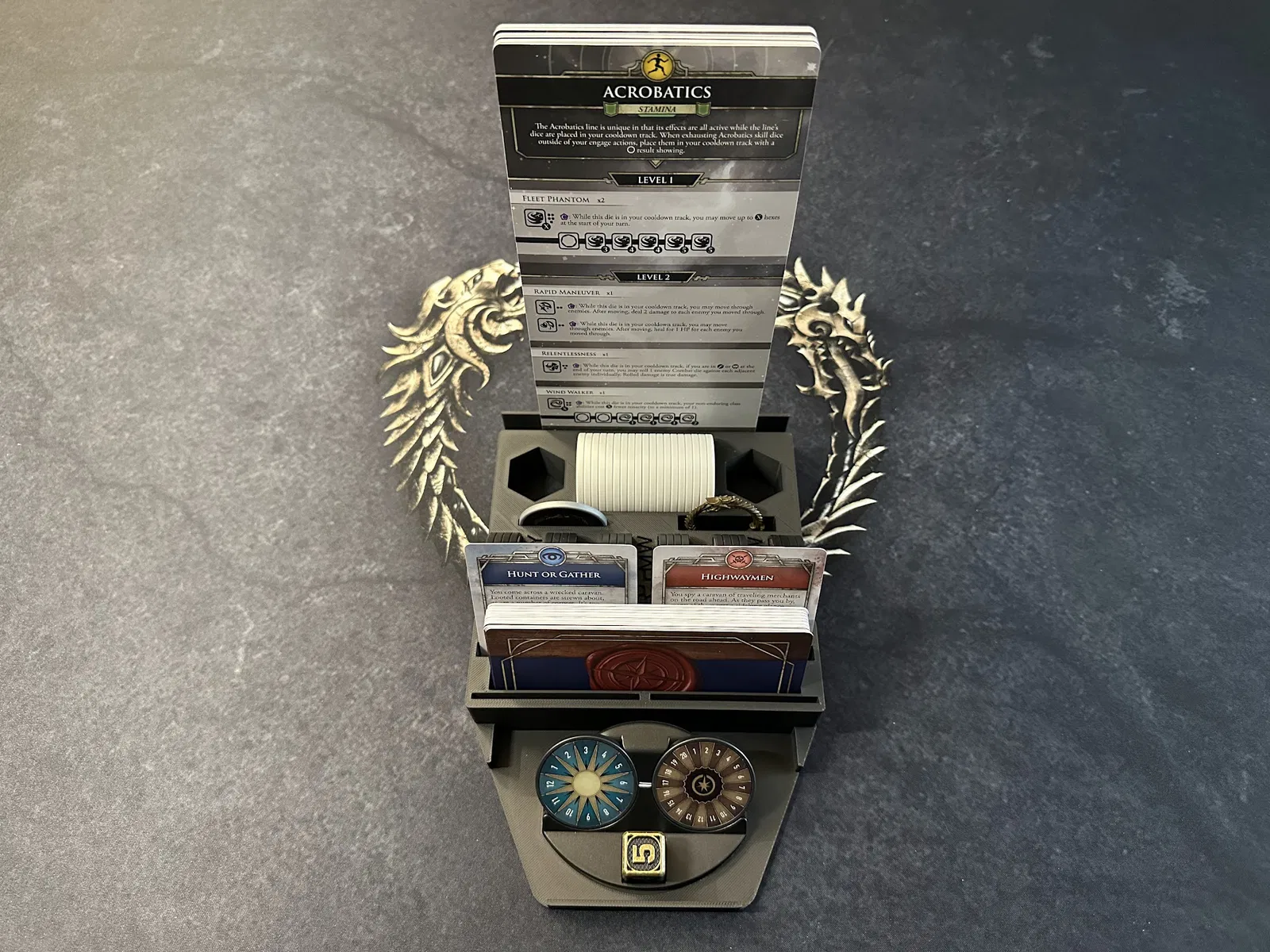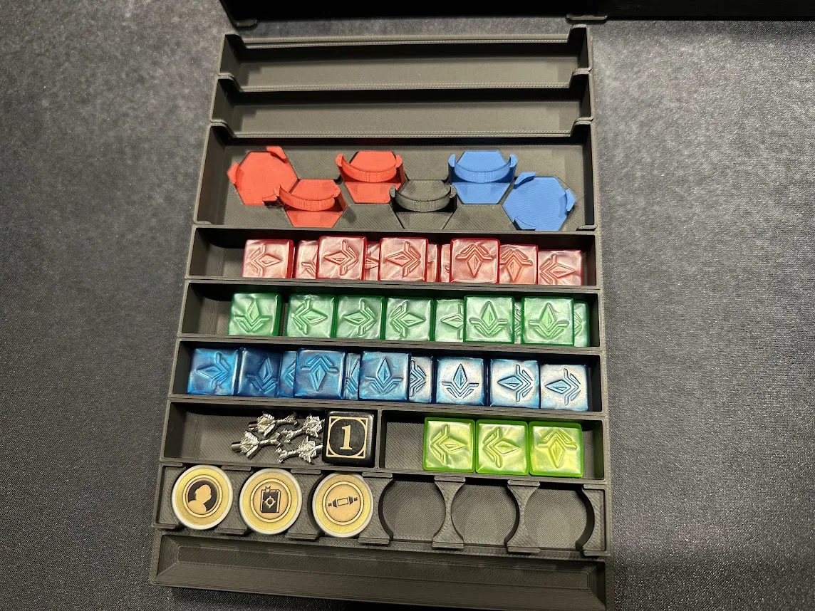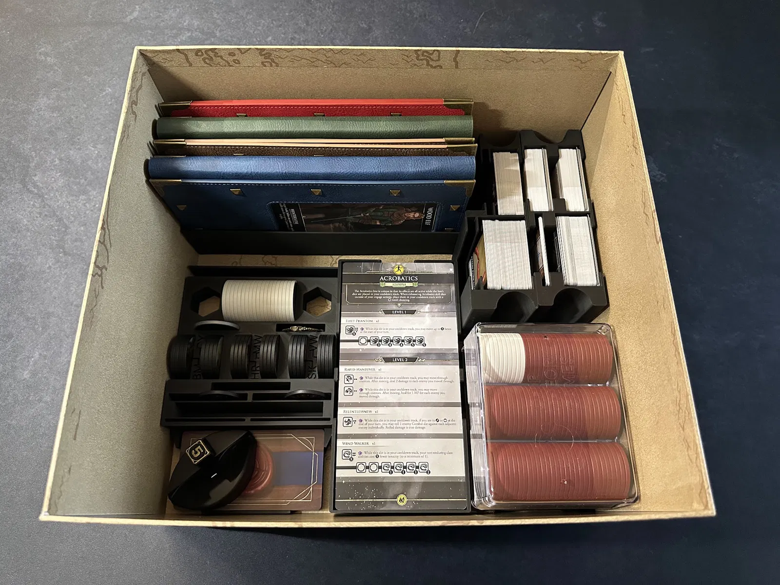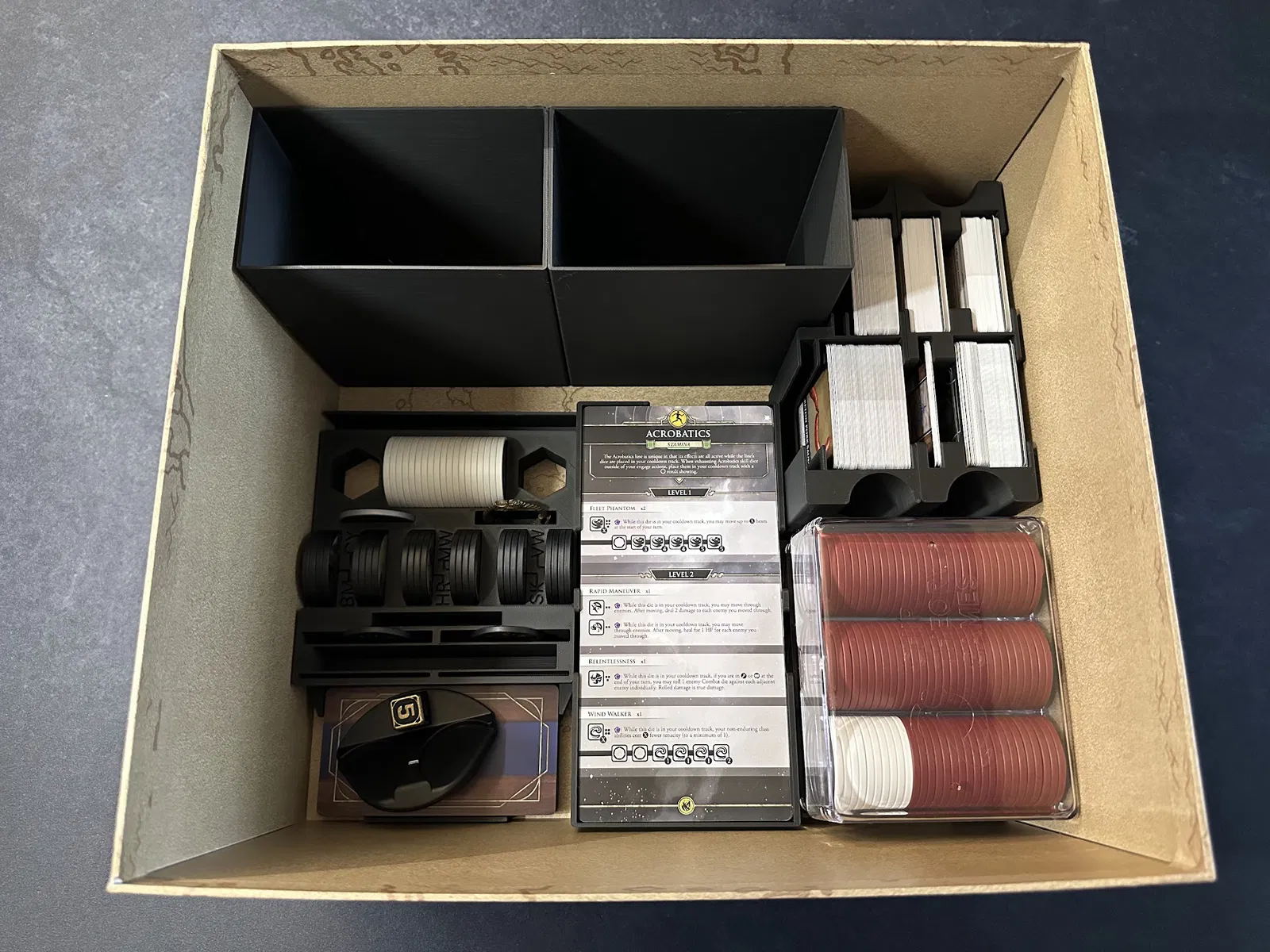 Điểm nhấn chính là tủ chứa xúc xắc (dice cabinet), nơi chứa toàn bộ xúc xắc, stat token, map token và các chốt (pegs) của player mat. Mỗi kỹ năng đều có khay riêng để bạn đưa cho người chơi khi cần nâng cấp. Các loại xúc xắc phổ biến được nhóm lại, bạn có thể lấy cả khay hoặc chỉ lấy số lượng cần dùng.