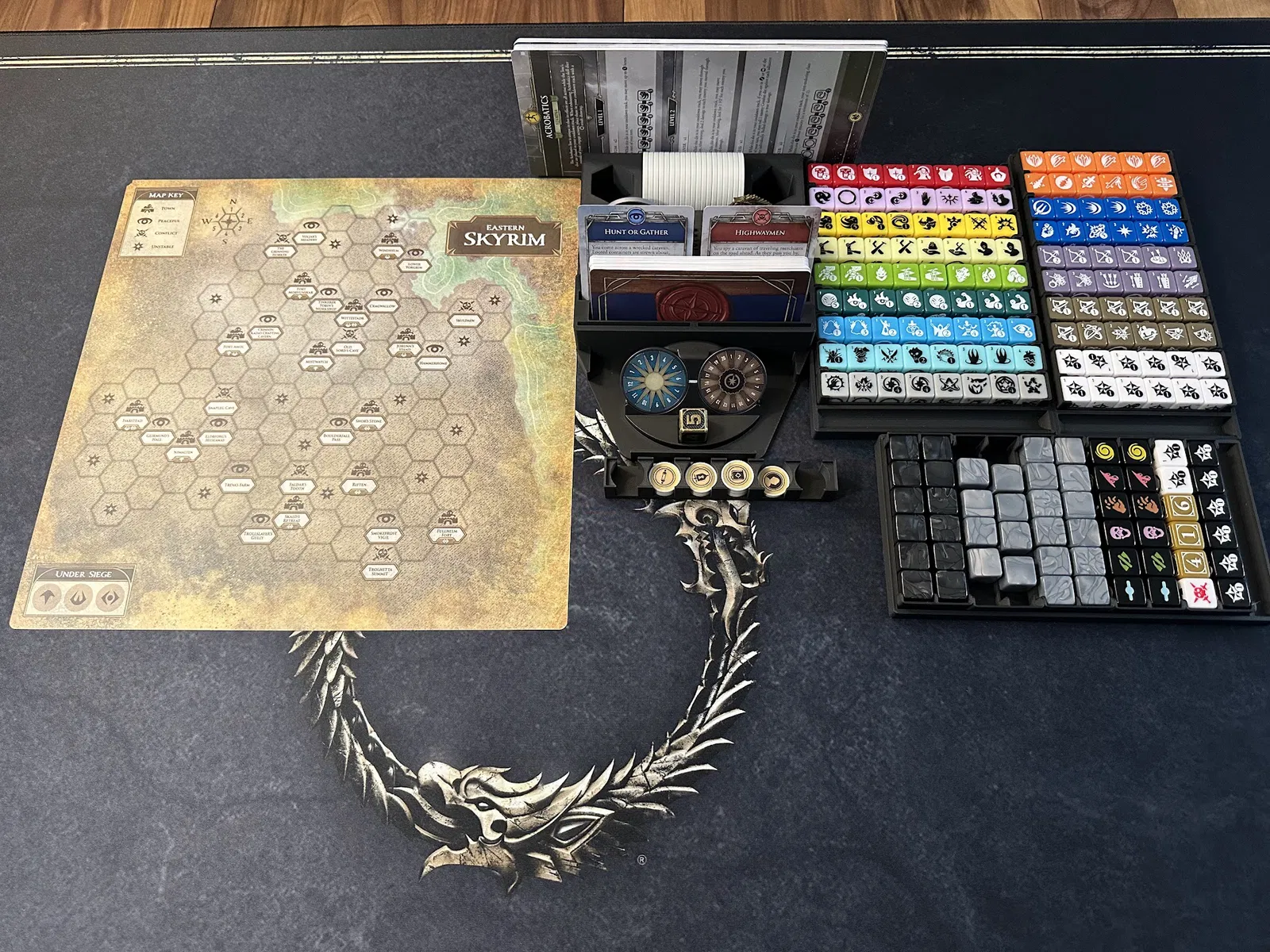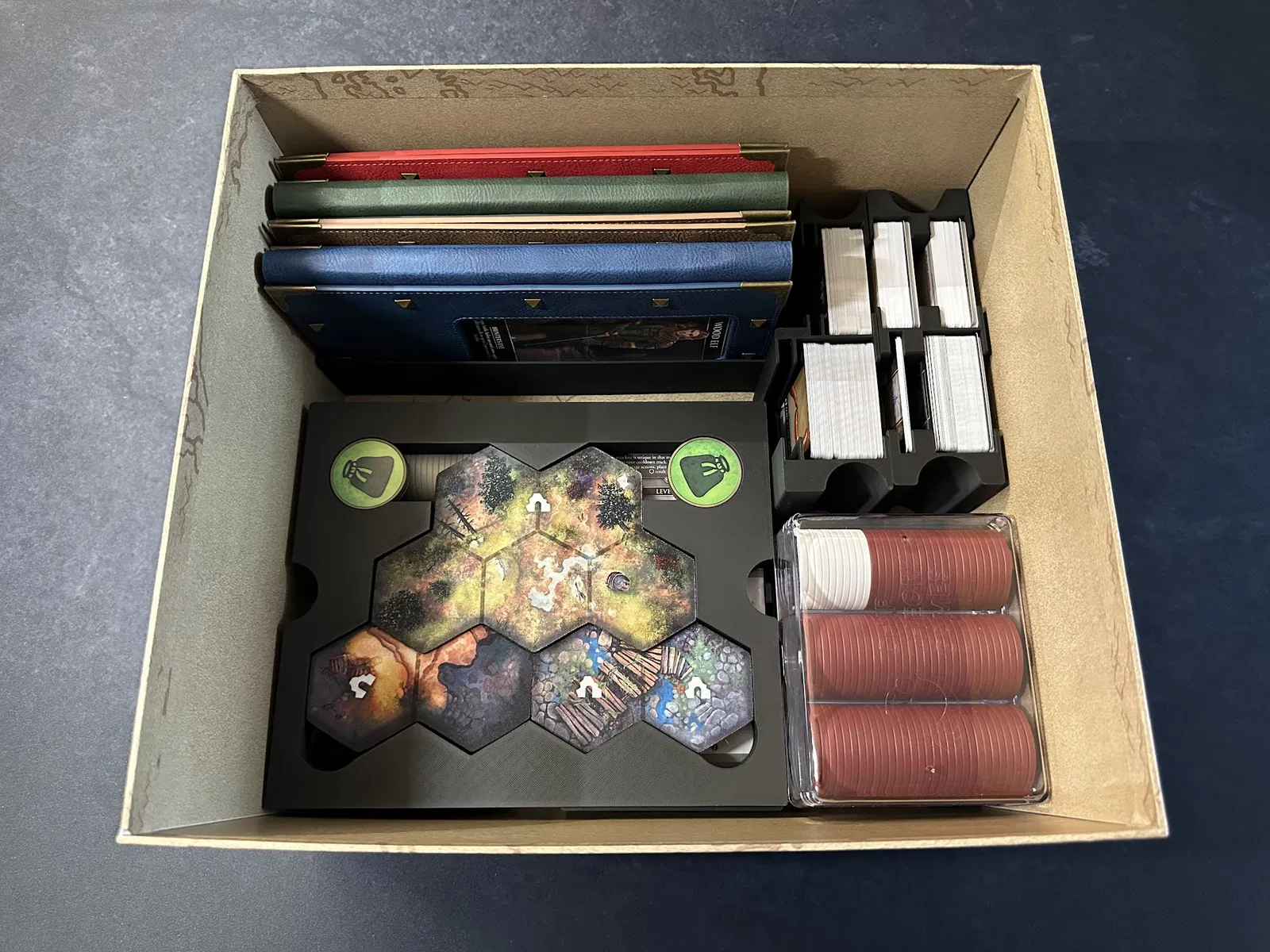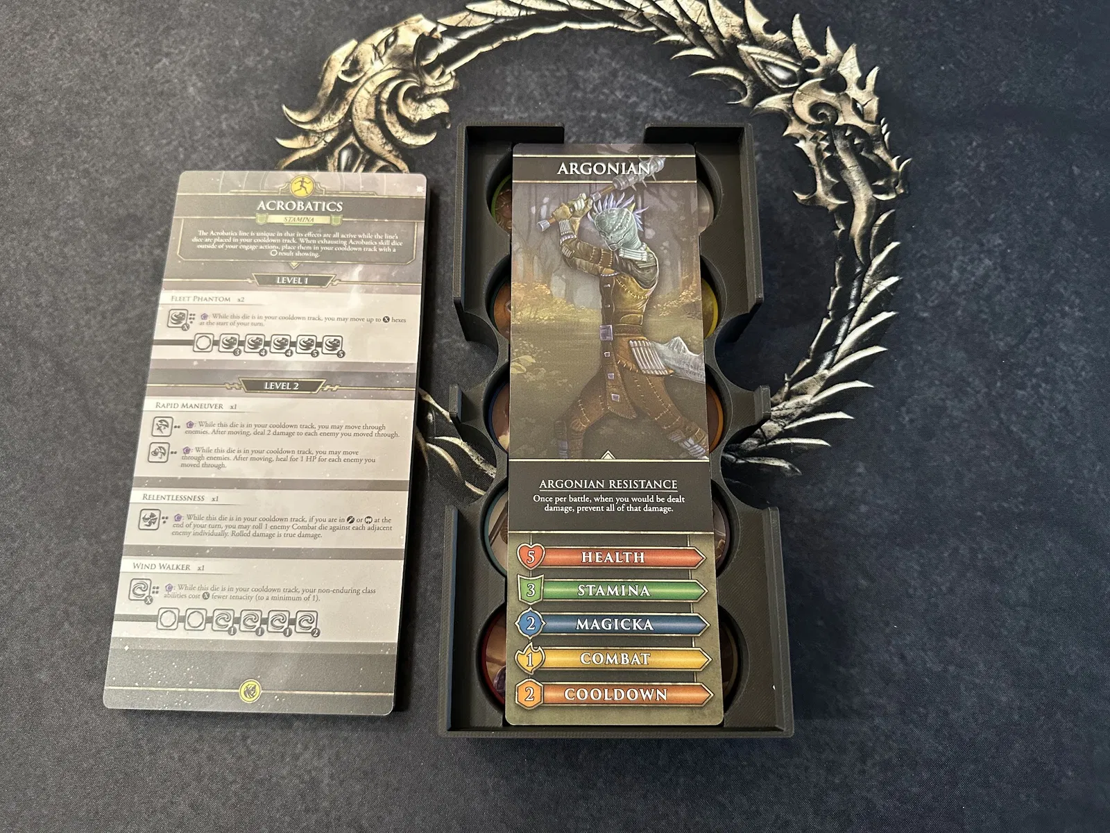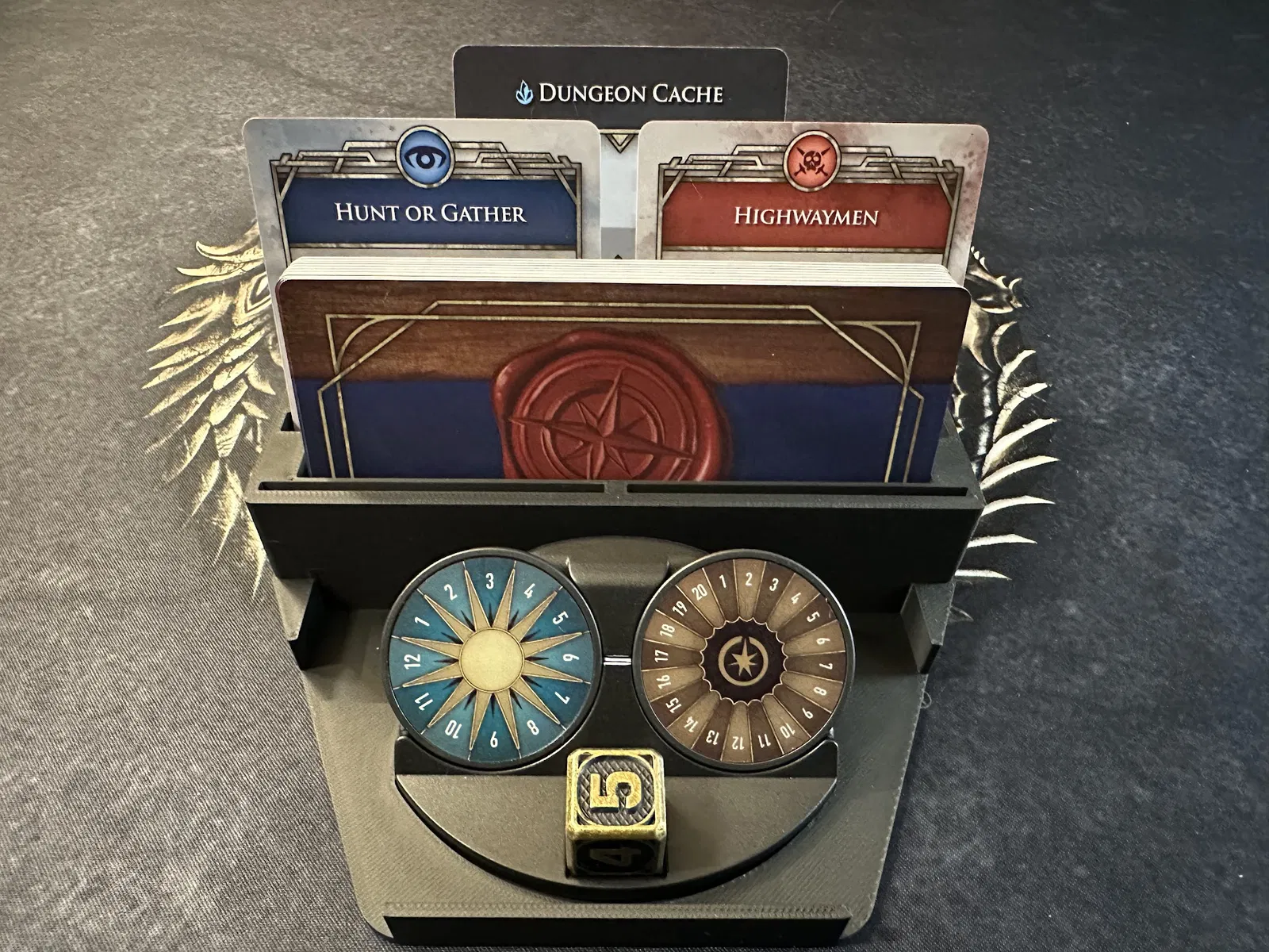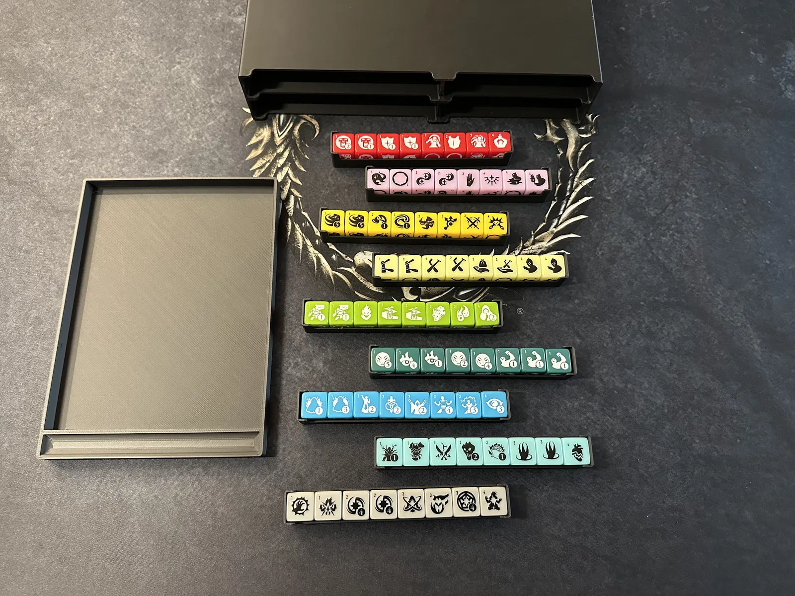 Điểm nhấn chính là tủ chứa xúc xắc (dice cabinet), nơi chứa toàn bộ xúc xắc, stat token, map token và các chốt (pegs) của player mat. Mỗi kỹ năng đều có khay riêng để bạn đưa cho người chơi khi cần nâng cấp. Các loại xúc xắc phổ biến được nhóm lại, bạn có thể lấy cả khay hoặc chỉ lấy số lượng cần dùng.