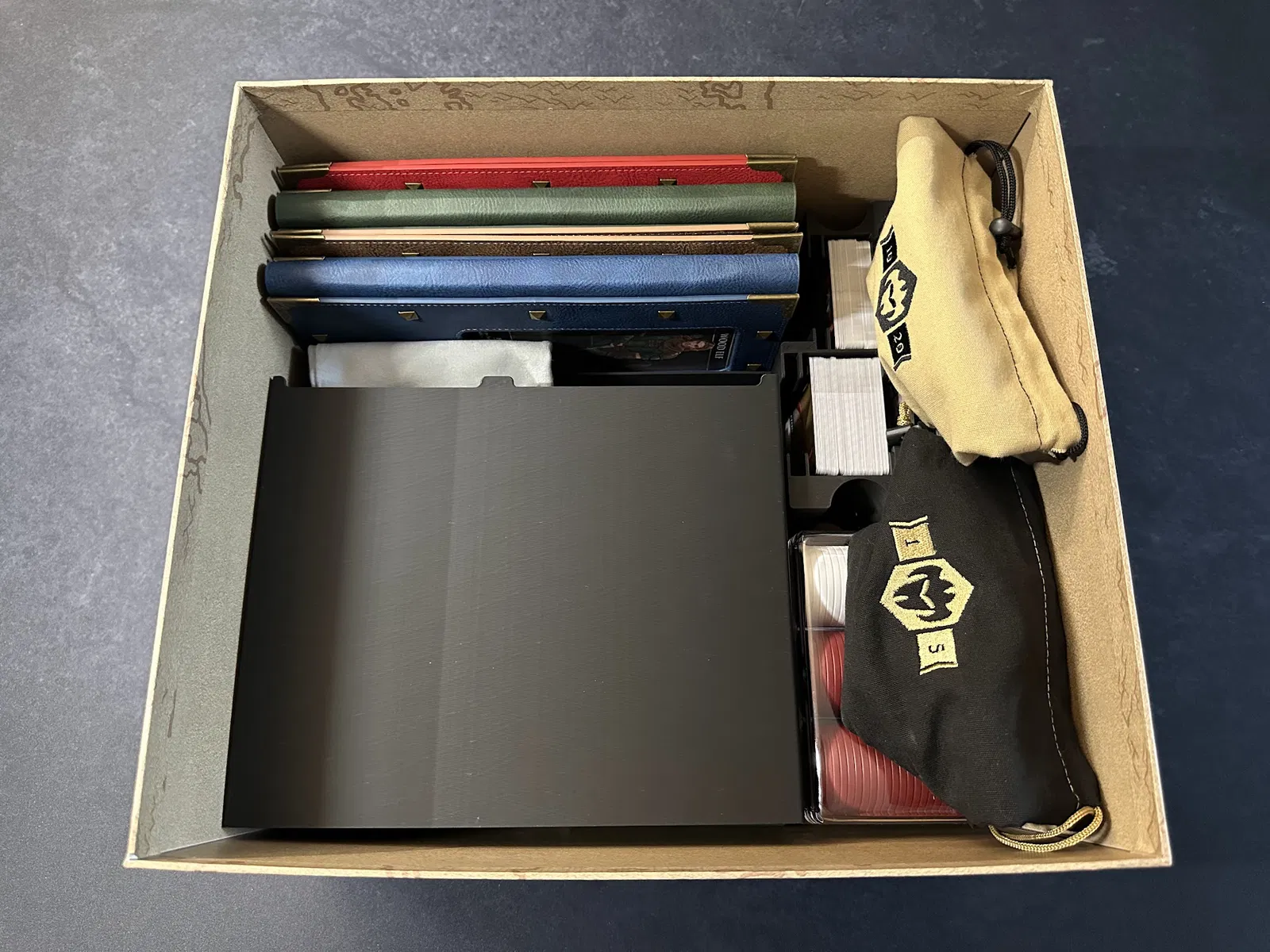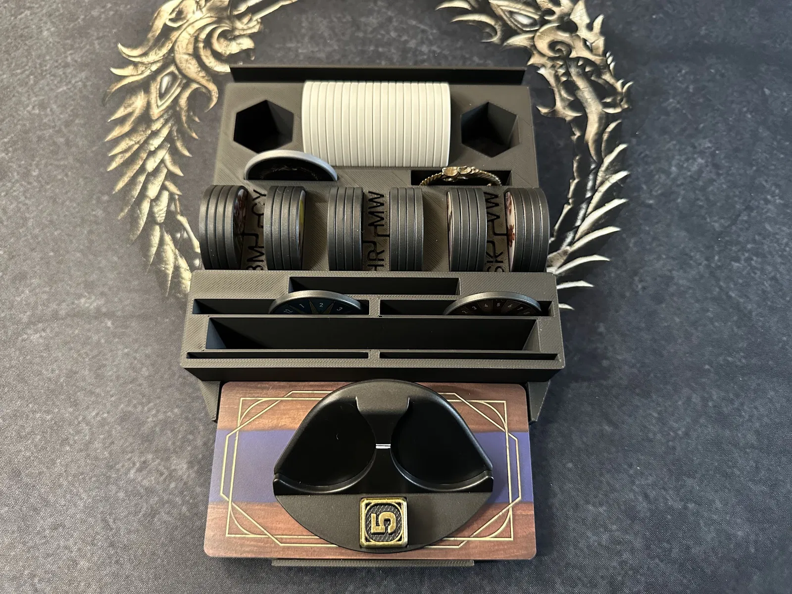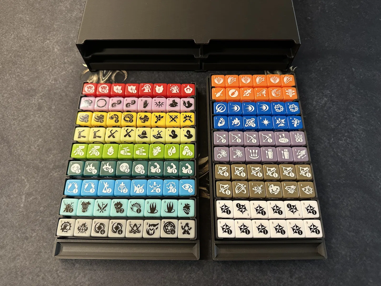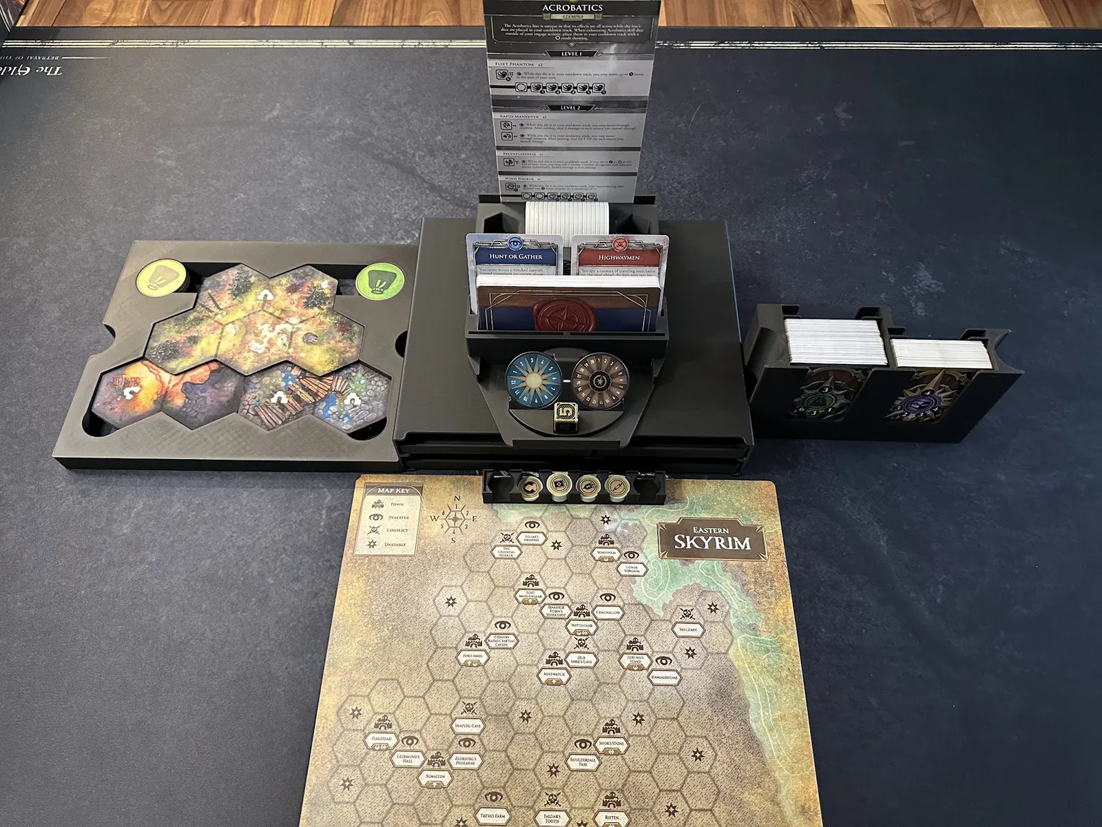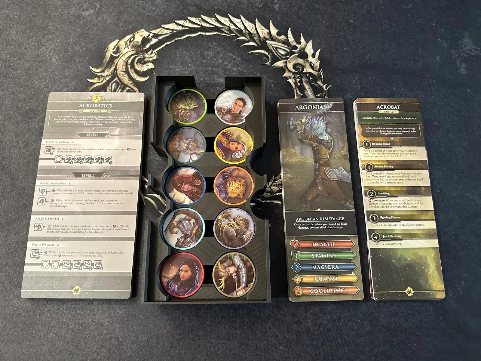 Điểm nhấn chính là tủ chứa xúc xắc (dice cabinet), nơi chứa toàn bộ xúc xắc, stat token, map token và các chốt (pegs) của player mat. Mỗi kỹ năng đều có khay riêng để bạn đưa cho người chơi khi cần nâng cấp. Các loại xúc xắc phổ biến được nhóm lại, bạn có thể lấy cả khay hoặc chỉ lấy số lượng cần dùng.