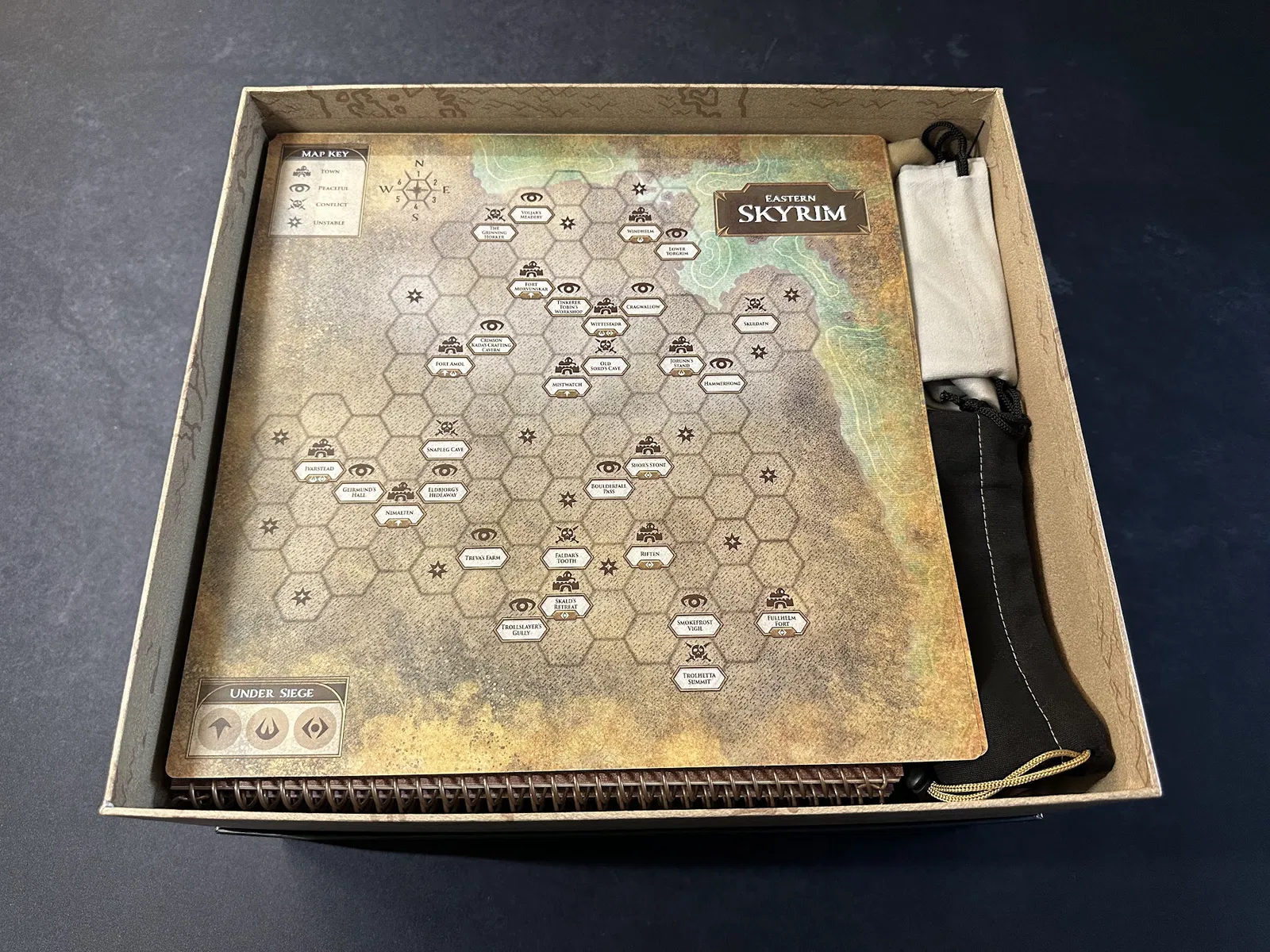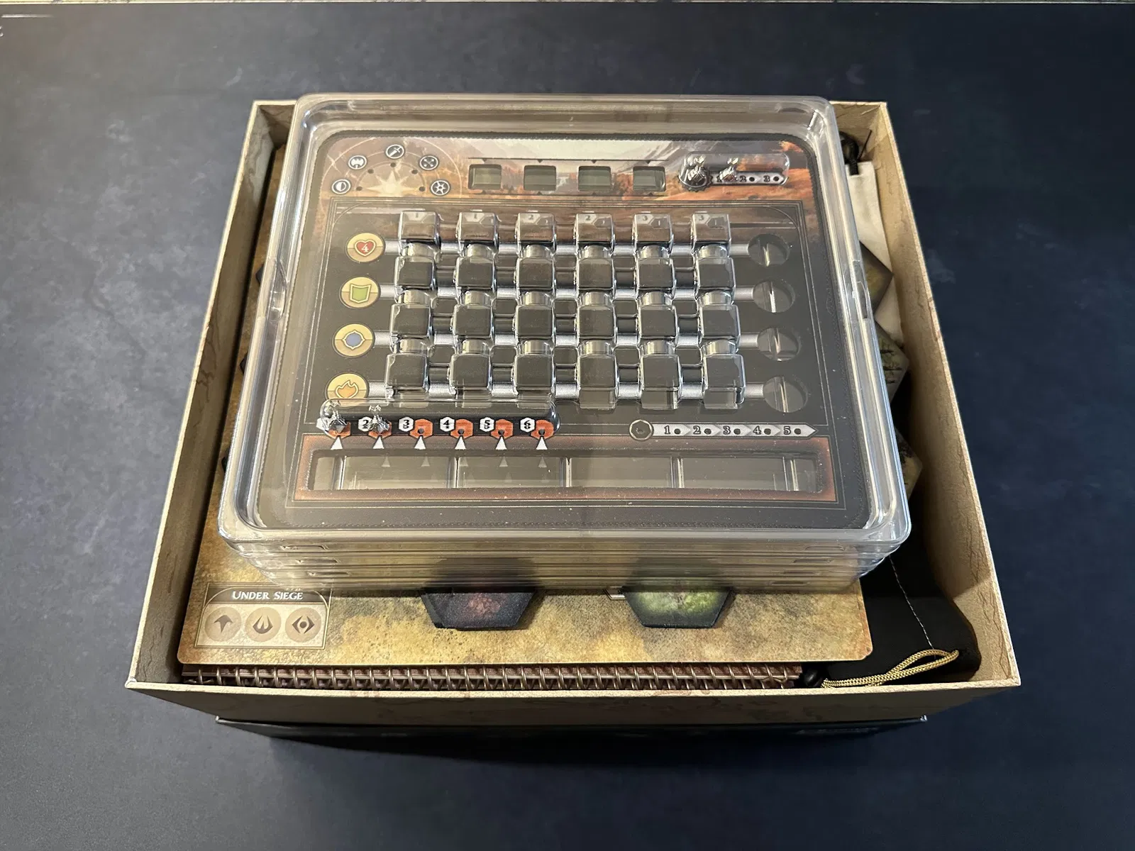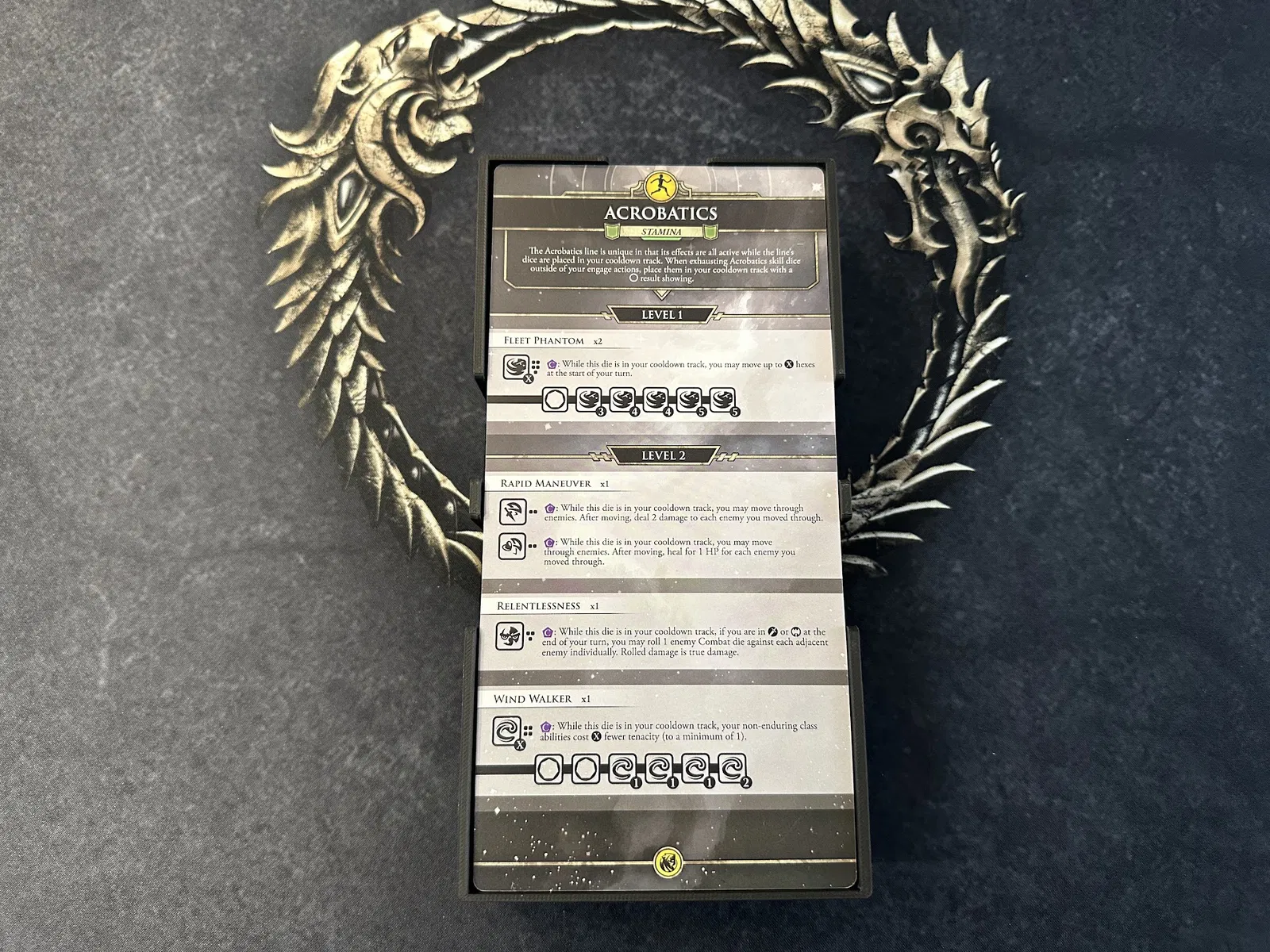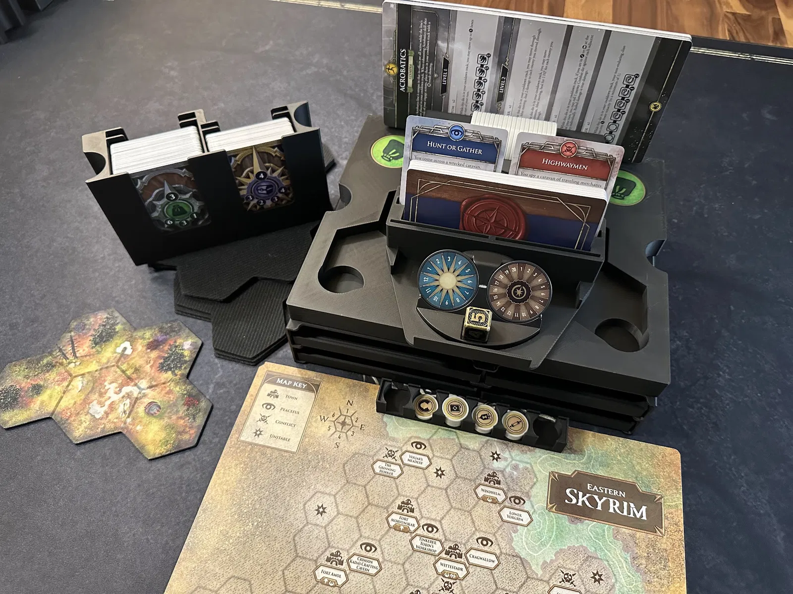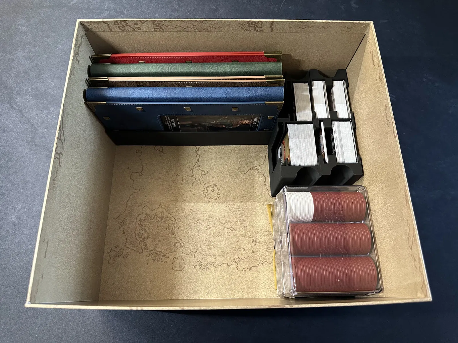 Điểm nhấn chính là tủ chứa xúc xắc (dice cabinet), nơi chứa toàn bộ xúc xắc, stat token, map token và các chốt (pegs) của player mat. Mỗi kỹ năng đều có khay riêng để bạn đưa cho người chơi khi cần nâng cấp. Các loại xúc xắc phổ biến được nhóm lại, bạn có thể lấy cả khay hoặc chỉ lấy số lượng cần dùng.