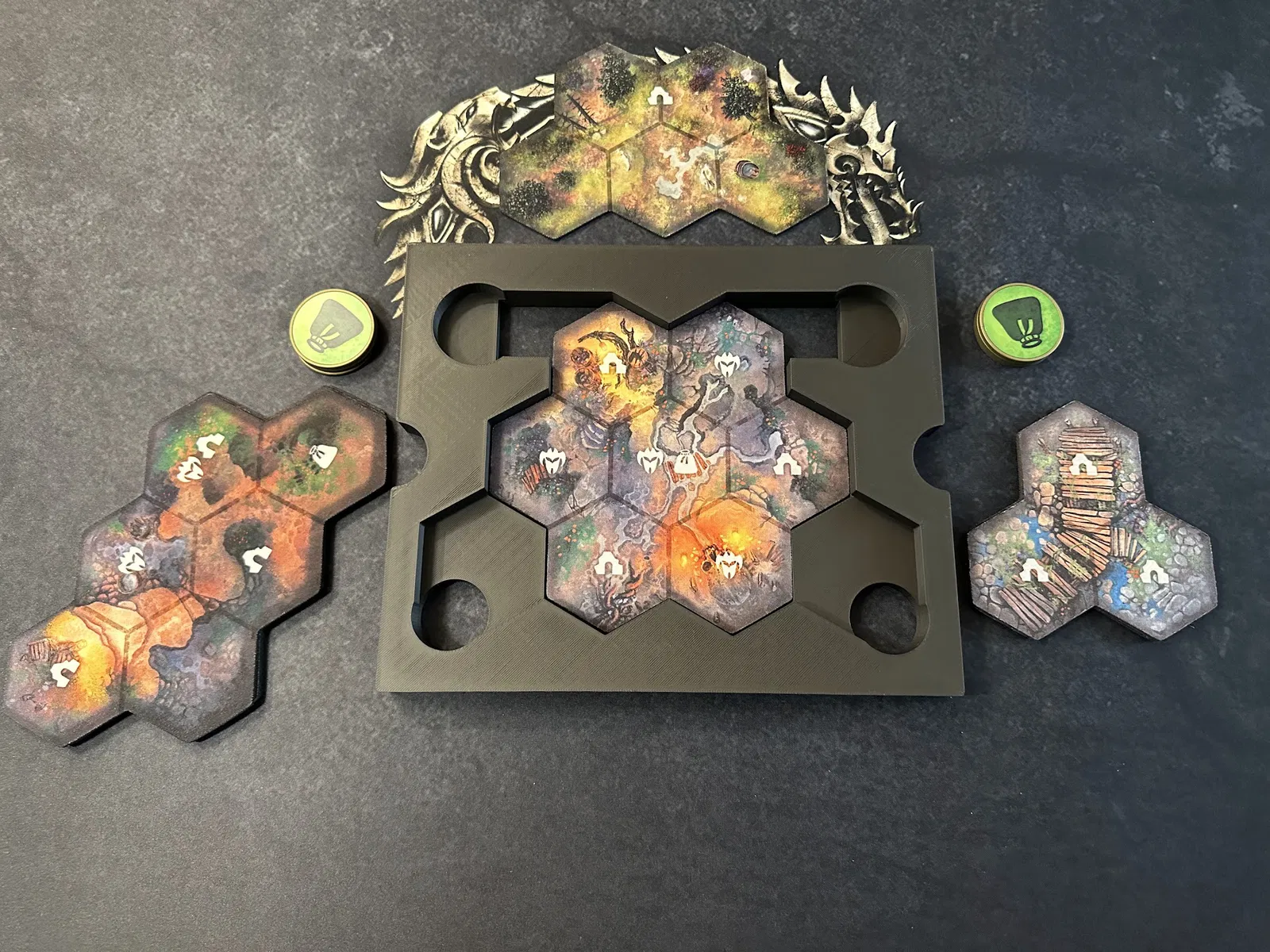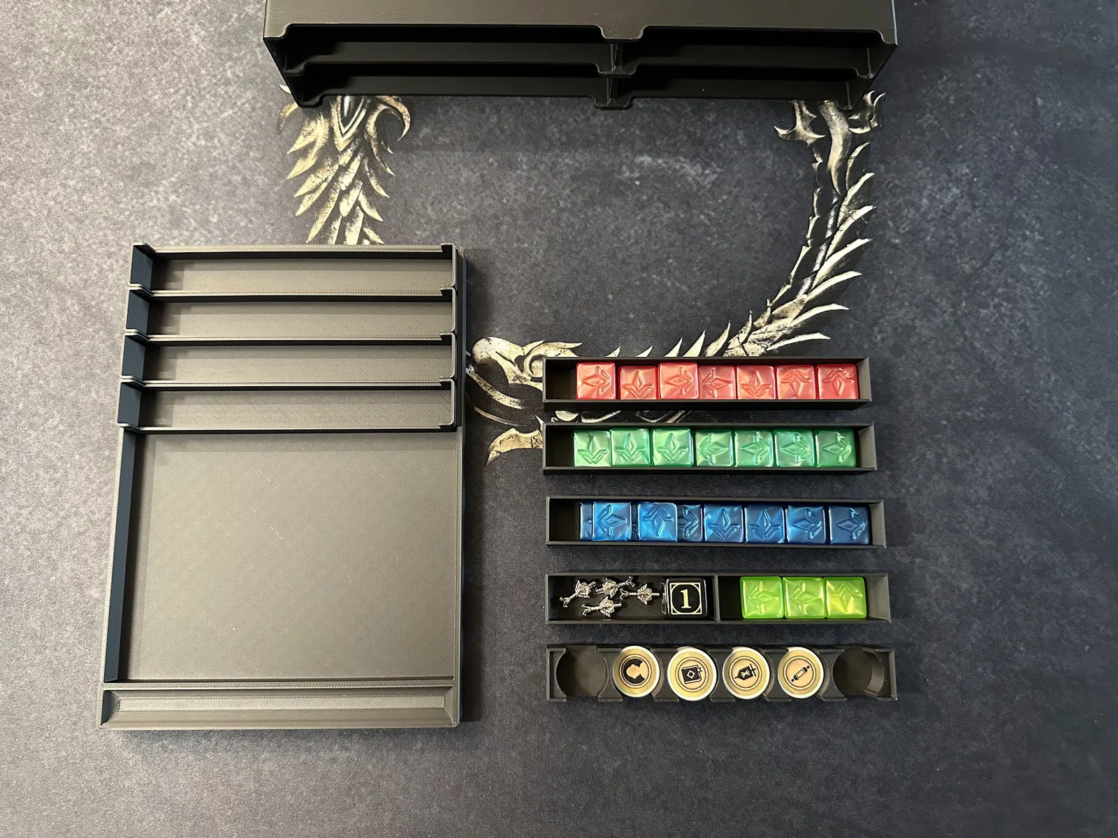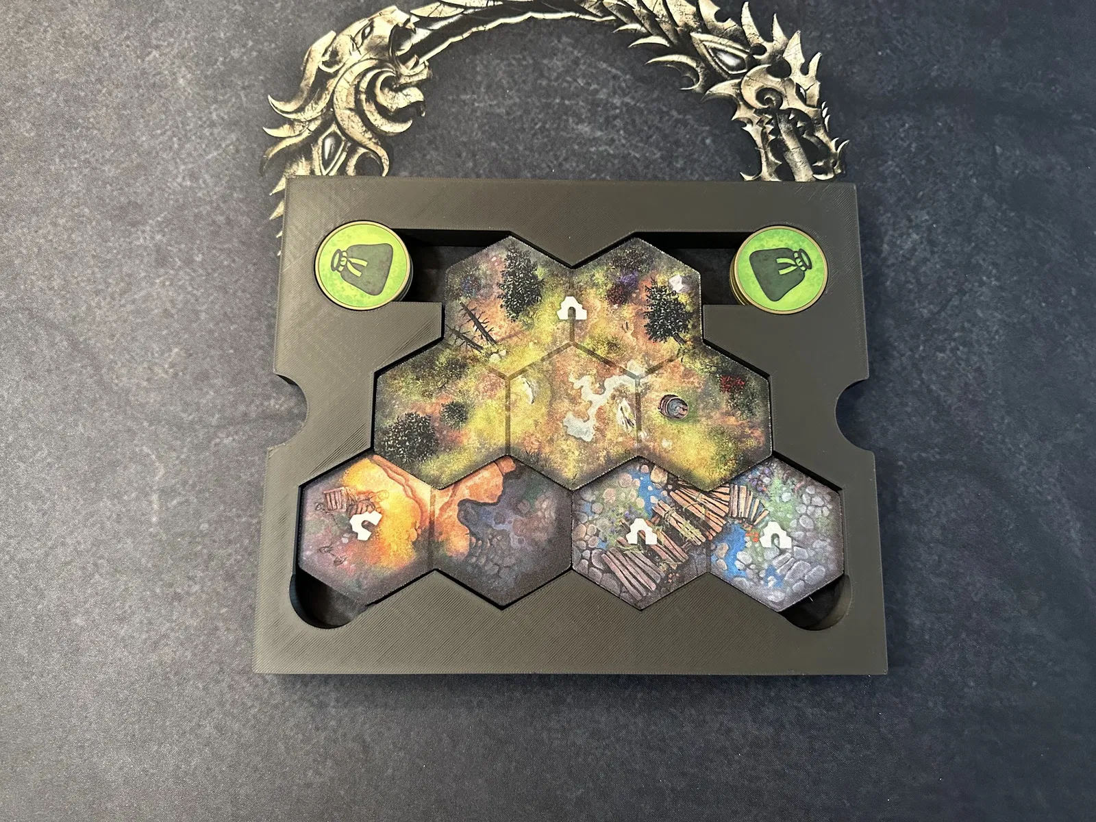 Tiếp theo là khay chứa các mảnh (chips) nhiệm vụ và vùng đất, mảnh người chơi đầu tiên, mảnh ouroboros từ gói Blacksmith và các lá bài nhiệm vụ phụ. Khay này giúp bàn chơi gọn gàng hơn rất nhiều.