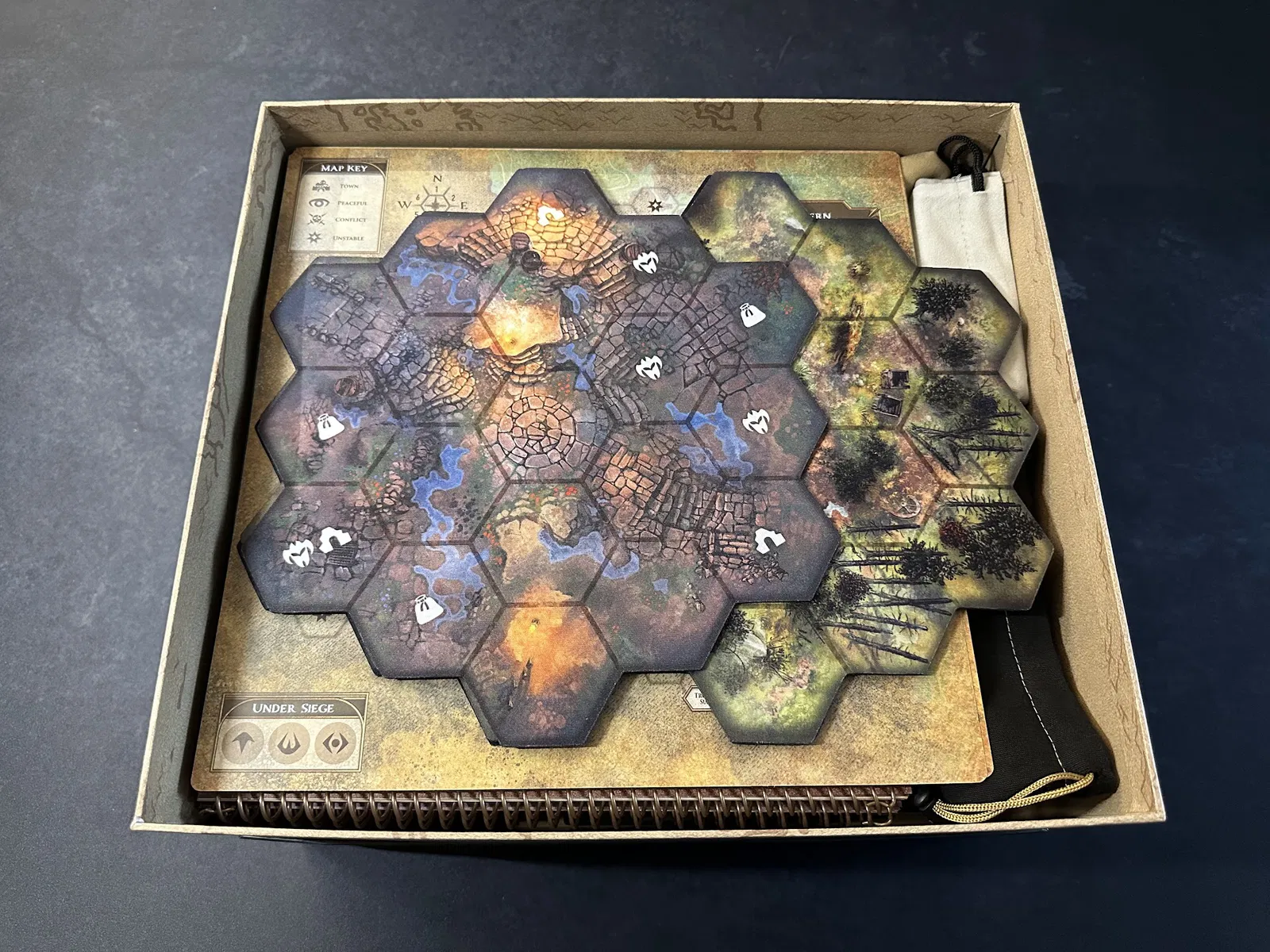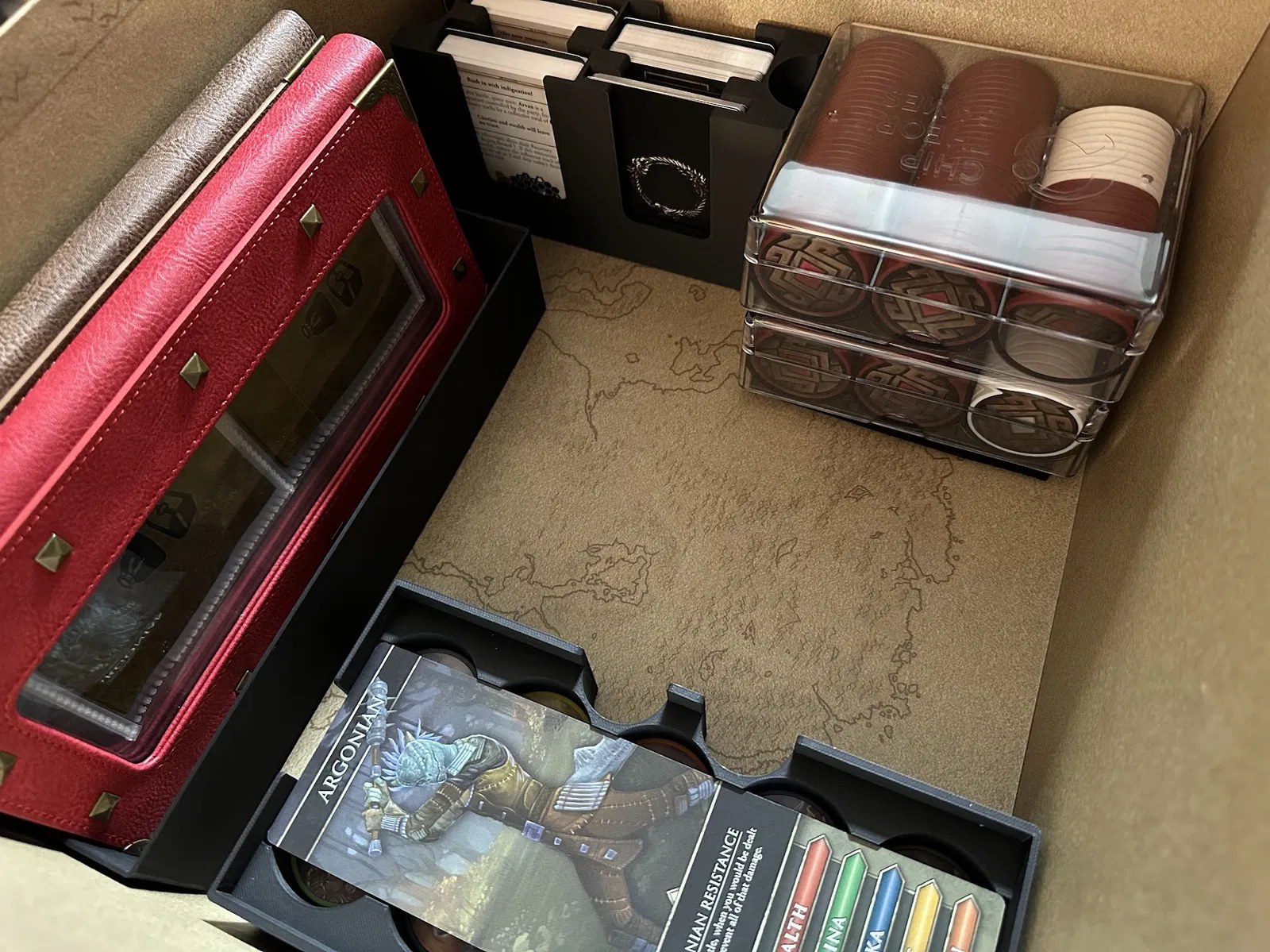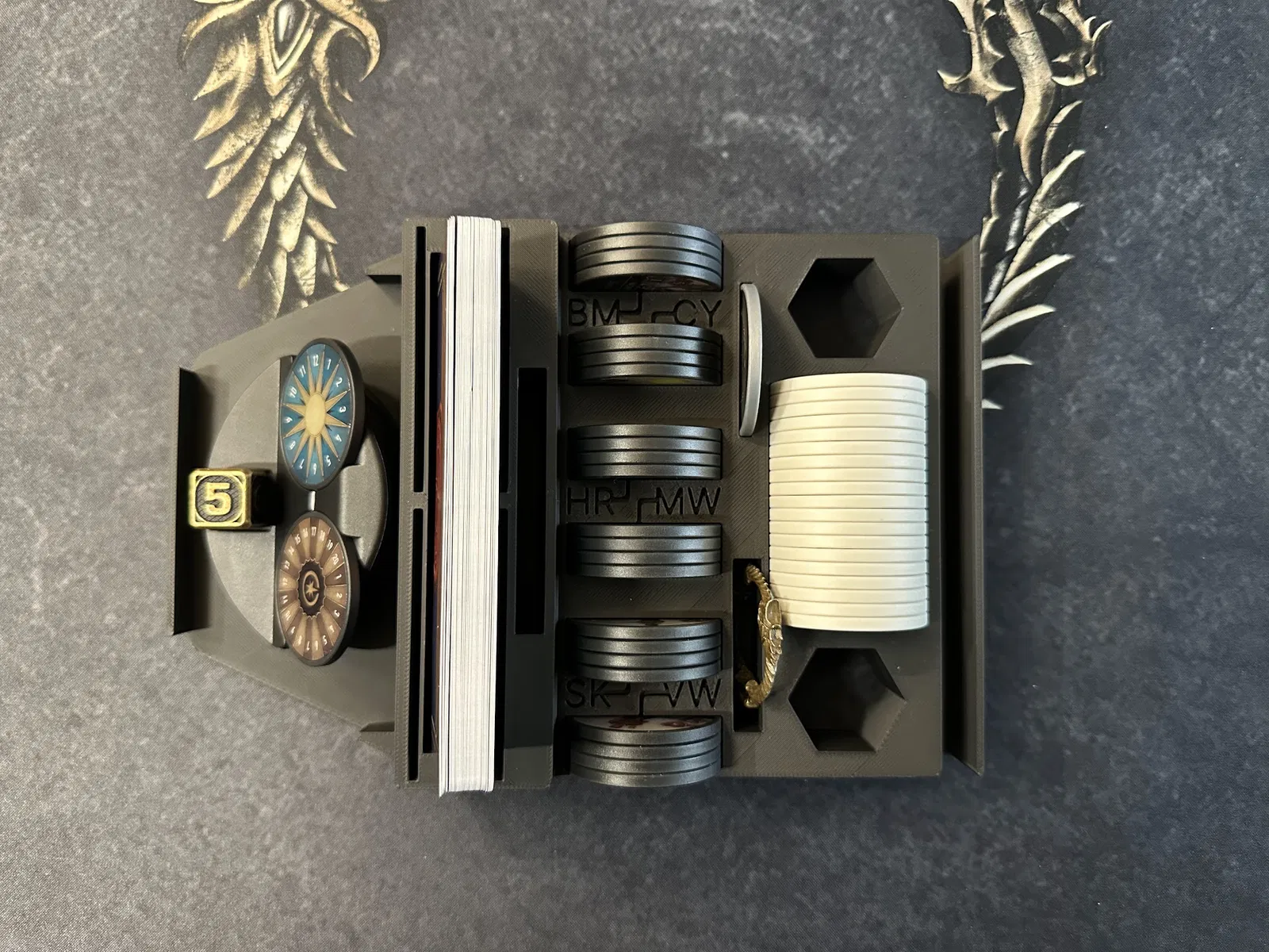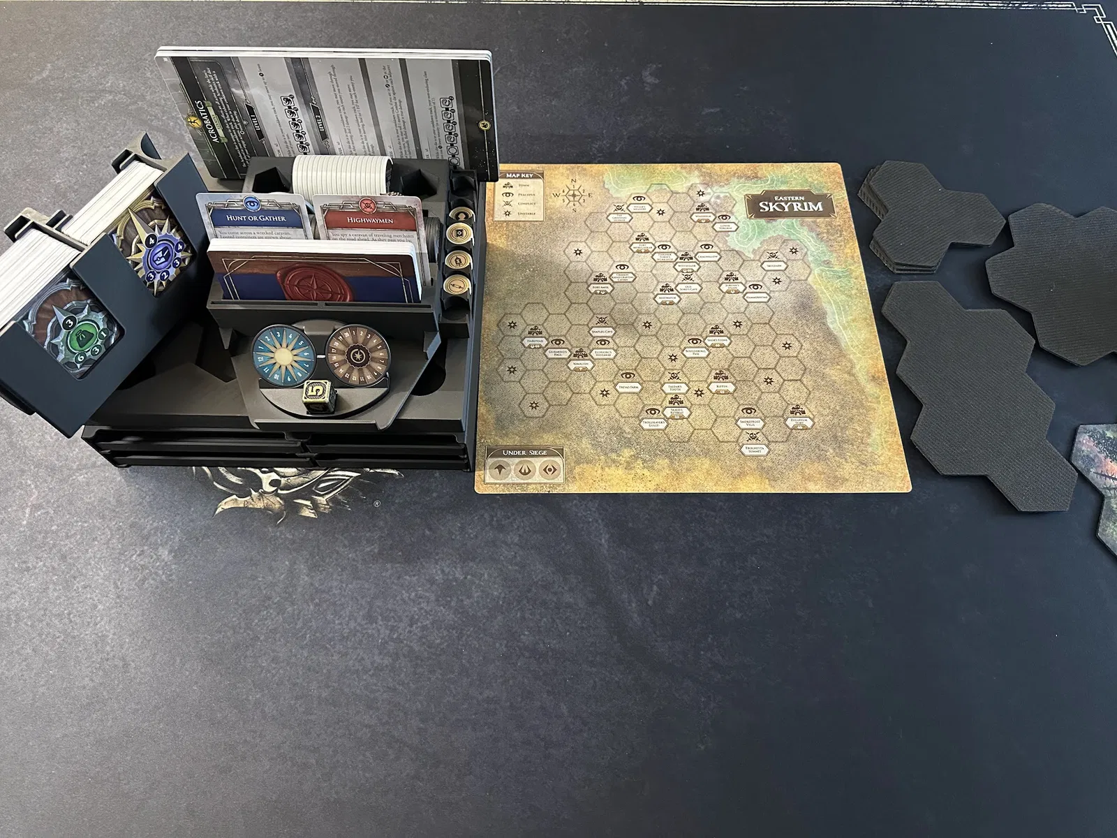 Tiếp theo là khay chứa các mảnh (chips) nhiệm vụ và vùng đất, mảnh người chơi đầu tiên, mảnh ouroboros từ gói Blacksmith và các lá bài nhiệm vụ phụ. Khay này giúp bàn chơi gọn gàng hơn rất nhiều.