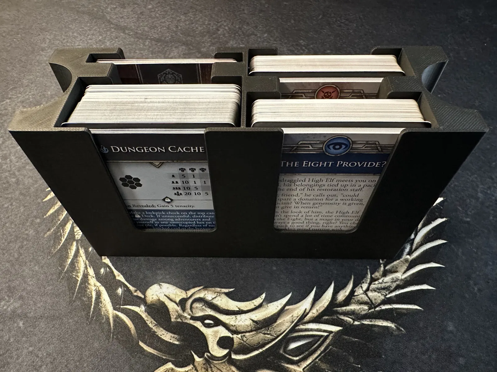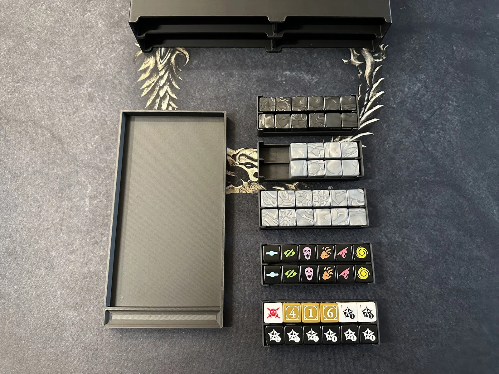 Khay gạch Delve/Dungeon chứa tất cả các gạch size 3, 6, 7 và các mảnh loot. Khay này có thể chồng lên tủ xúc xắc hoặc để riêng.