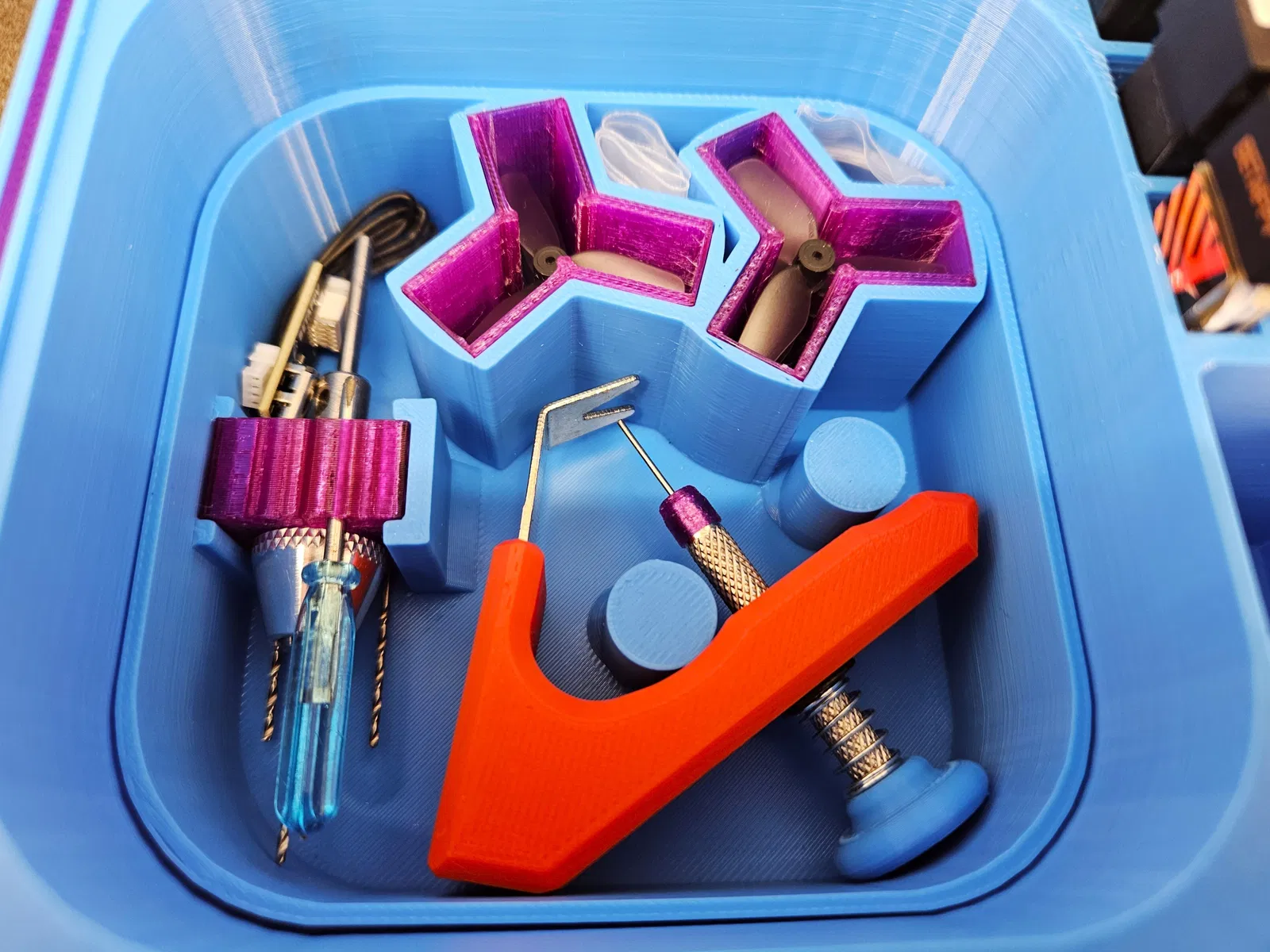 Mình cực kỳ thích phần đế của mẫu WhoopDegen Case do Jron2008 thiết kế/remix trên Thingiverse, nhưng lại không ưng phần hộp ngoài/thiết kế bản lề, các lỗ vít quá to không khớp với kích thước ốc và còn phải dùng thêm đai ốc, chưa kể là khá phí không gian ở các cạnh. Mình đã từng sử dụng thiết kế hộp bền bỉ dạng tham số (parametric rugged box) của Whity cho nhiều dự án trước đây, nên quyết định kết hợp và tối ưu lại phần khay đựng từ WhoopDegen để lồng vào chiếc hộp đó. Mình cũng tạo thêm một khay chứa đồ bên dưới để anh em đựng được kha khá phụ kiện mà không lo bị xóc nảy, kèm theo một phiên bản trống để mọi người tùy ý sử dụng.