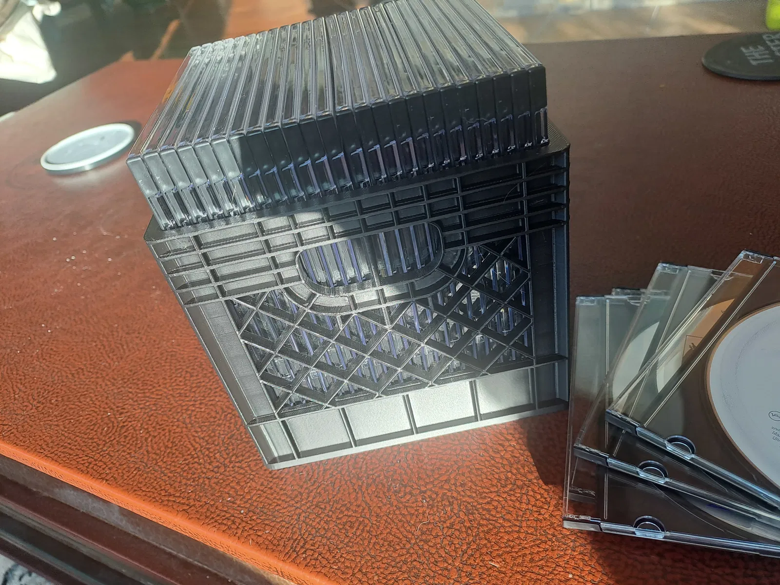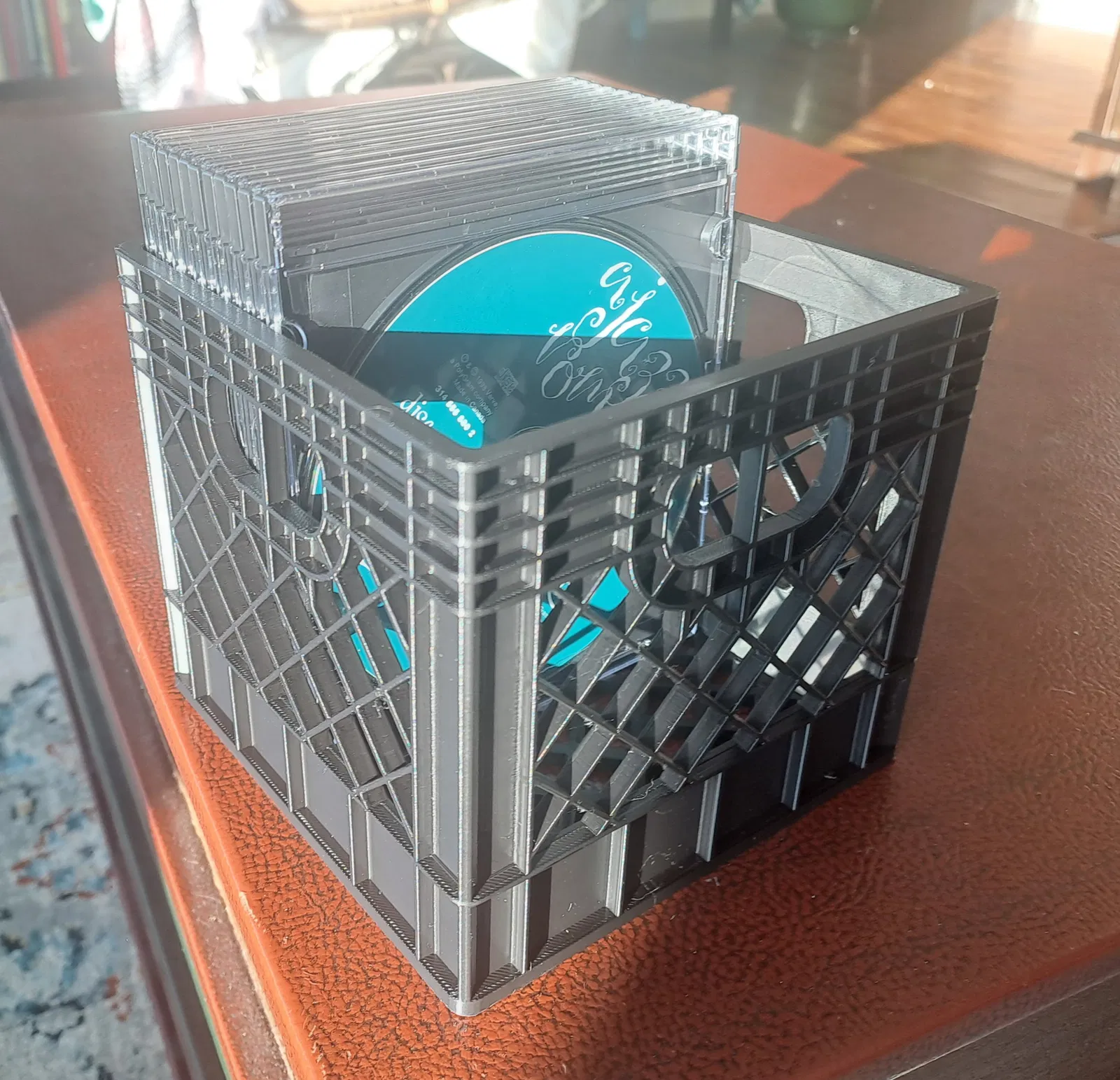 Một chiếc giỏ đựng sữa nhỏ xinh xắn để cất giữ đĩa CD. Nó có thể chứa gọn gàng 24 hộp đĩa loại mỏng (slim jewel cases).