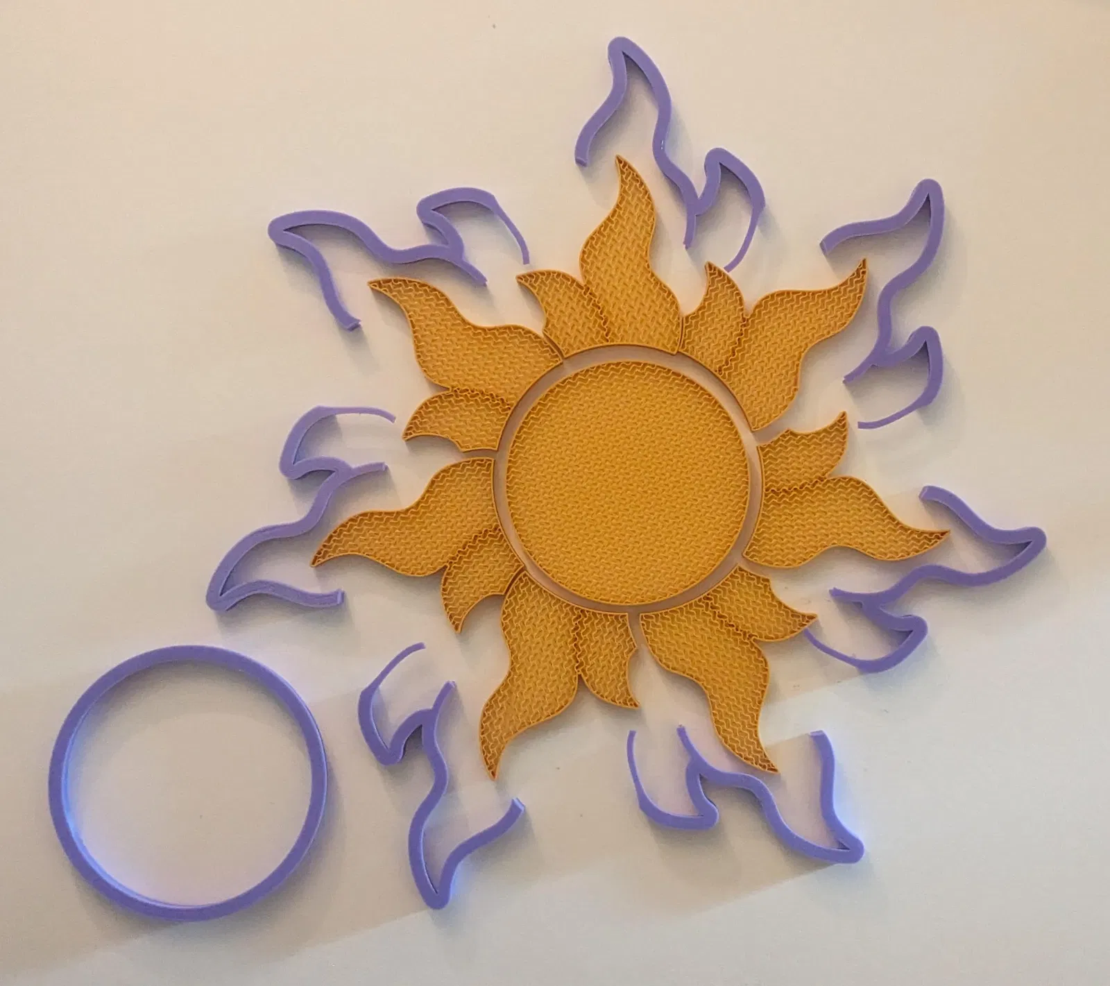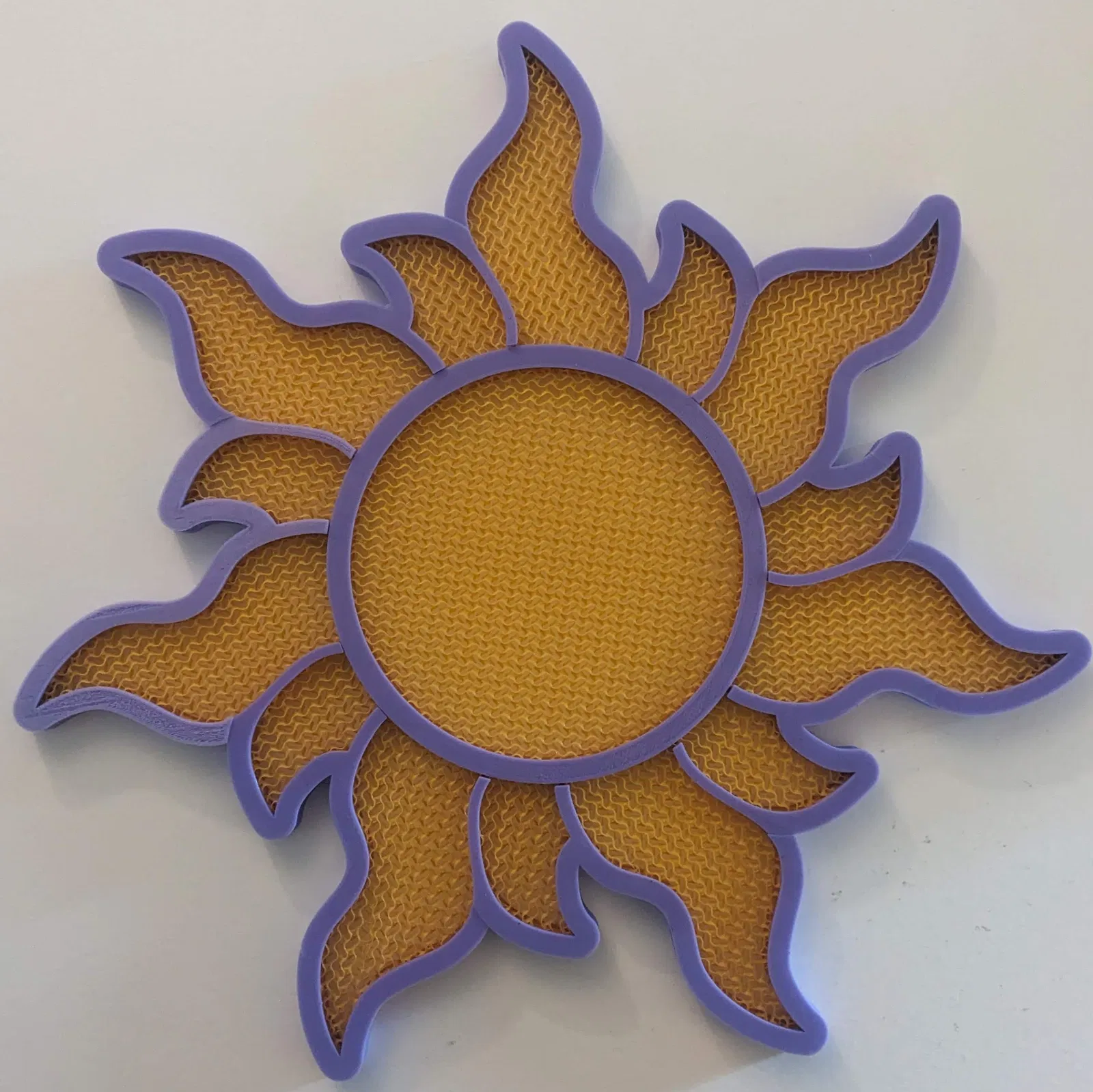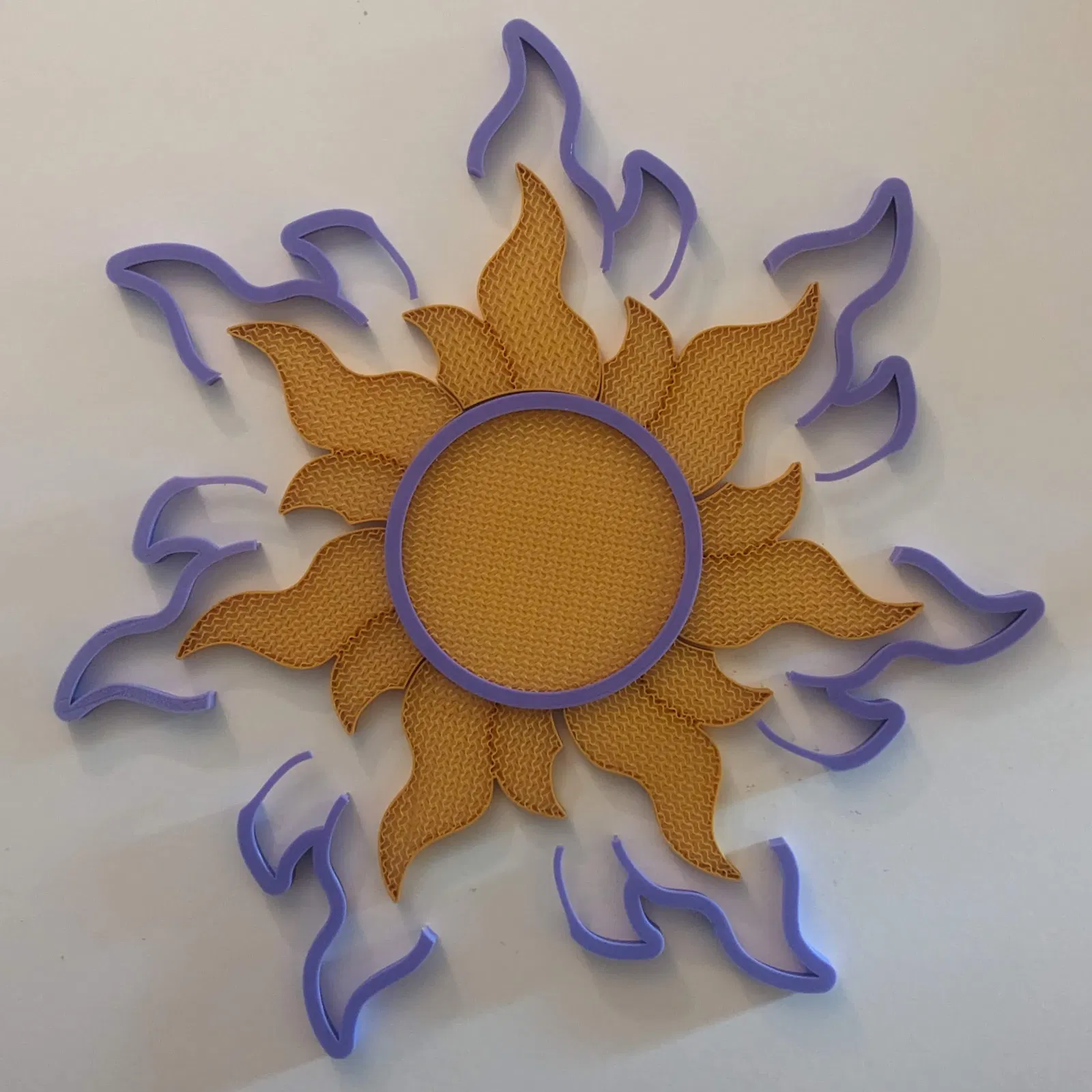 Lấy cảm hứng từ bộ phim "Tangled", đây là huy hiệu của Vương quốc Corona - Mặt dây chuyền hình mặt trời vàng. Tất cả các chi tiết được in ở độ cao lớp 0.2mm. Mình thiết kế khoảng hở 0.18mm giữa các bộ phận lắp ghép dựa trên dung sai của máy in và loại nhựa mình dùng. Kích thước phần khung chính bị giới hạn bởi bàn in của mình.