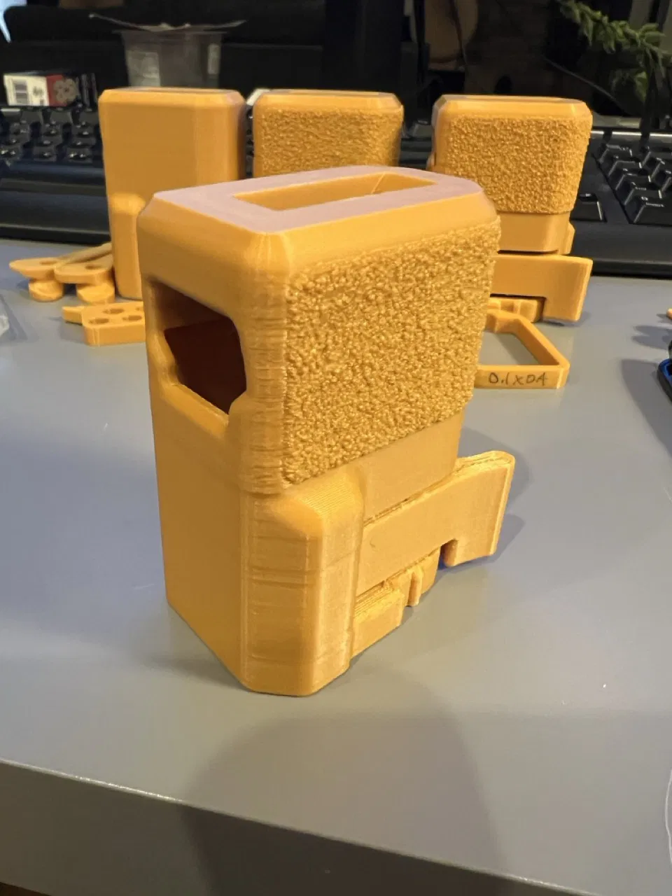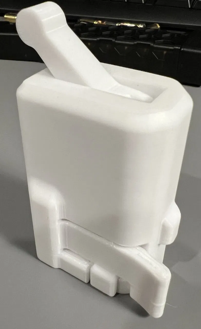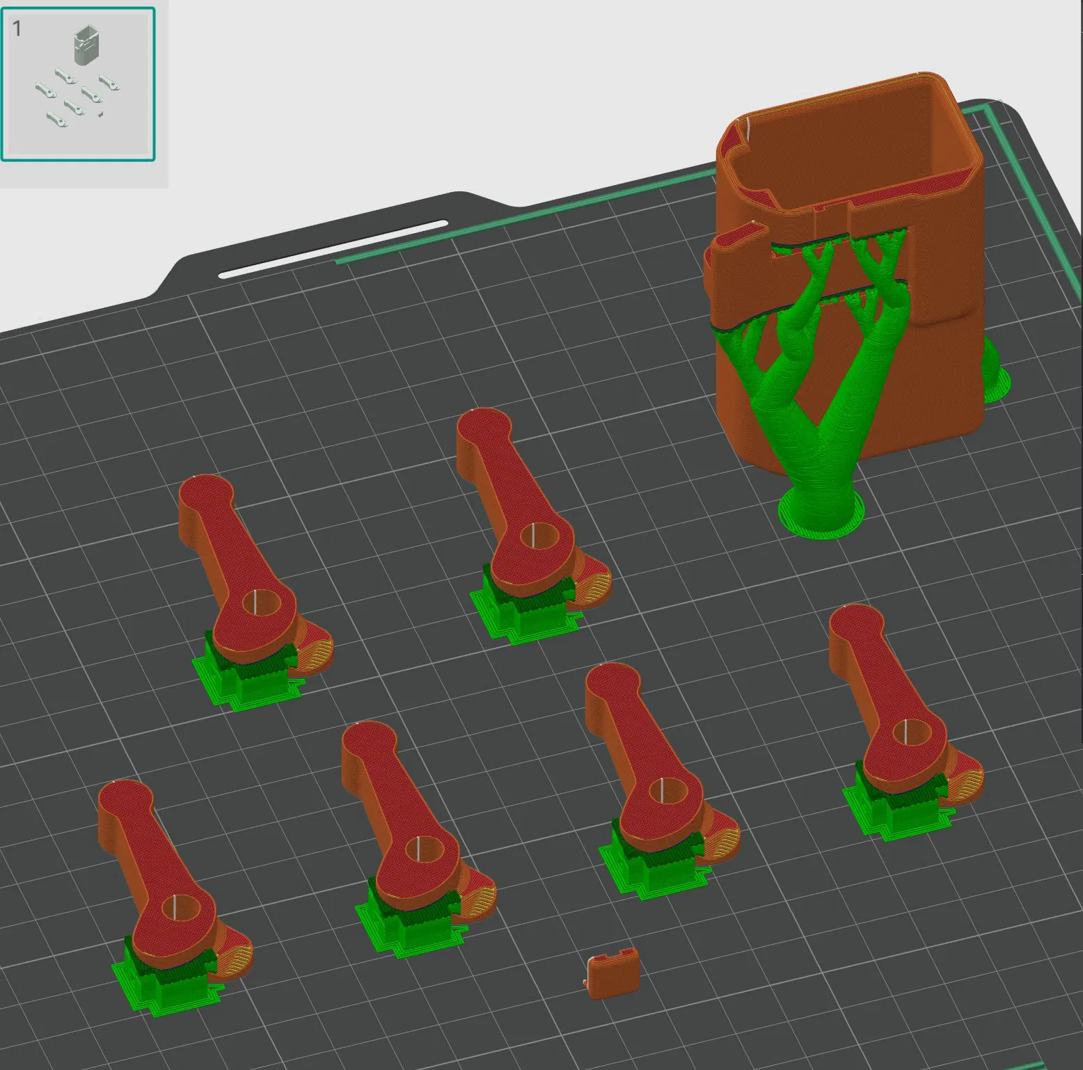 Tôi có đính kèm file step và file 3mf (được tạo bằng Orca slicer v2.3) đã được chia tách và đặt hướng in chuẩn. Tôi dùng nhựa Voxel PLA+ HS. Với phần thân thì ổn, nhưng phần cam trên tay đòn sẽ bị mài mòn theo thời gian nên bạn hãy in sẵn vài cái dự phòng. Tôi dùng 5 lớp tường (wall loops), 5 lớp trên/dưới và 45% infill cubic để thiết bị cứng cáp hơn.