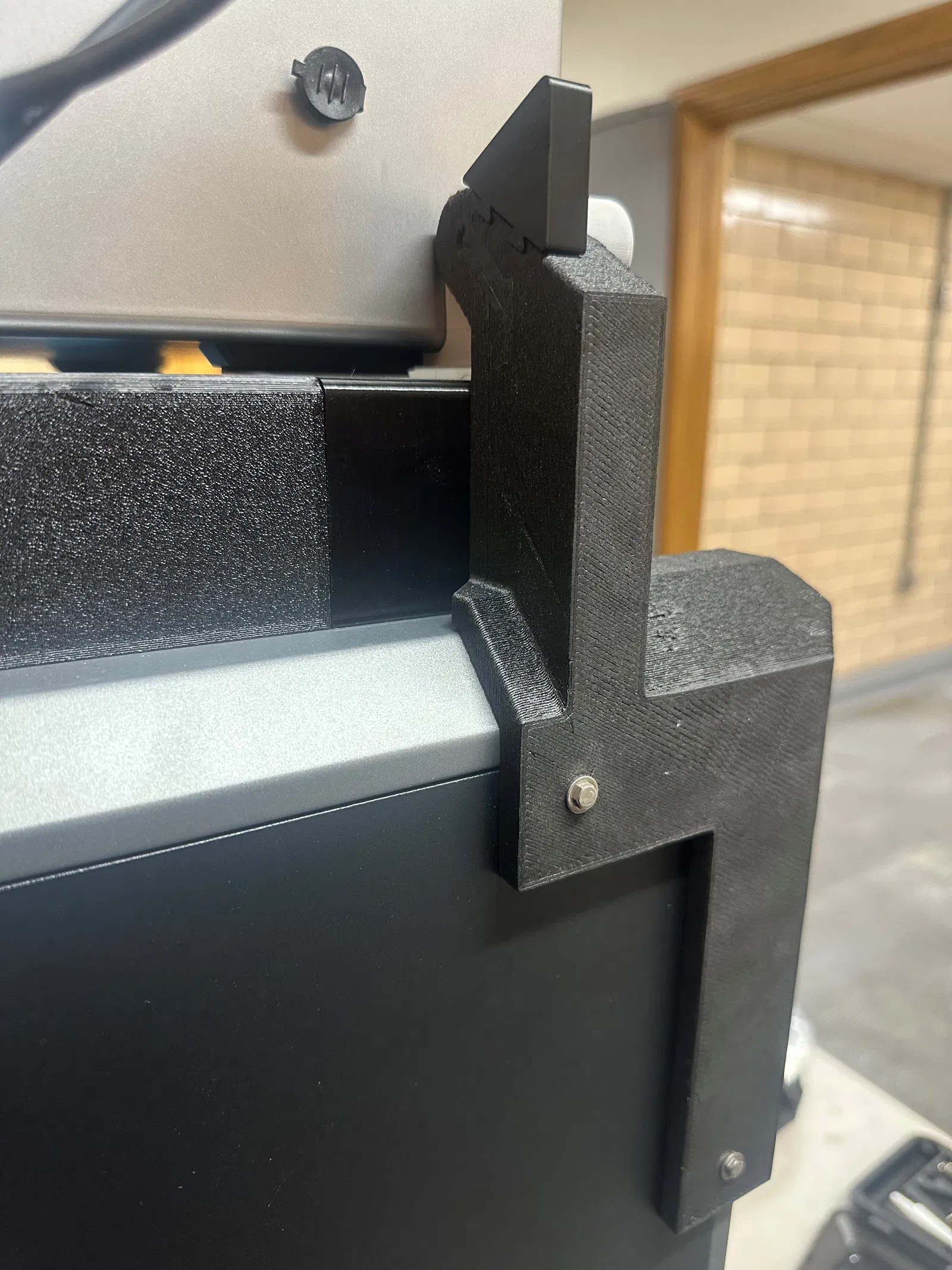 Phần bản lề phía máy in được gắn bằng hai ốc 3mm và một chốt giúp cố định vị trí. Bốn góc phía trên của K2 Plus có các nút cao su che lỗ bắt vít của khung máy. Để lắp bản lề này, bạn cần tháo nhẹ hai nút cao su phía sau để khớp chốt tròn của giá đỡ vào lỗ đó.