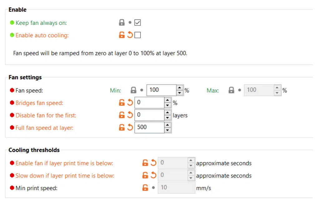 Bạn có thể dùng tháp này để kiểm tra tốc độ quạt tối ưu khi in. Bạn BẮT BUỘC phải dùng PrusaSlicer bản mới nhất và áp dụng cài đặt tốc độ quạt như trong hình, với độ cao lớp in là 0.2mm. Mình khuyên bạn nên dùng thêm một lớp brim lớn bao quanh tháp để đảm bảo độ bám.