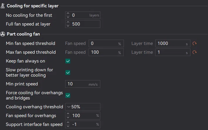 Phần dưới bắt đầu với tốc độ quạt thấp hoặc không quạt, nhưng bạn vẫn nên in được bình thường miễn là nhiệt độ đầu in không quá cao và nhiệt độ phòng không quá nóng. Nếu bị lỗi khi in, có thể bạn đang in quá nóng hoặc cần chuyển máy sang chỗ mát hơn.