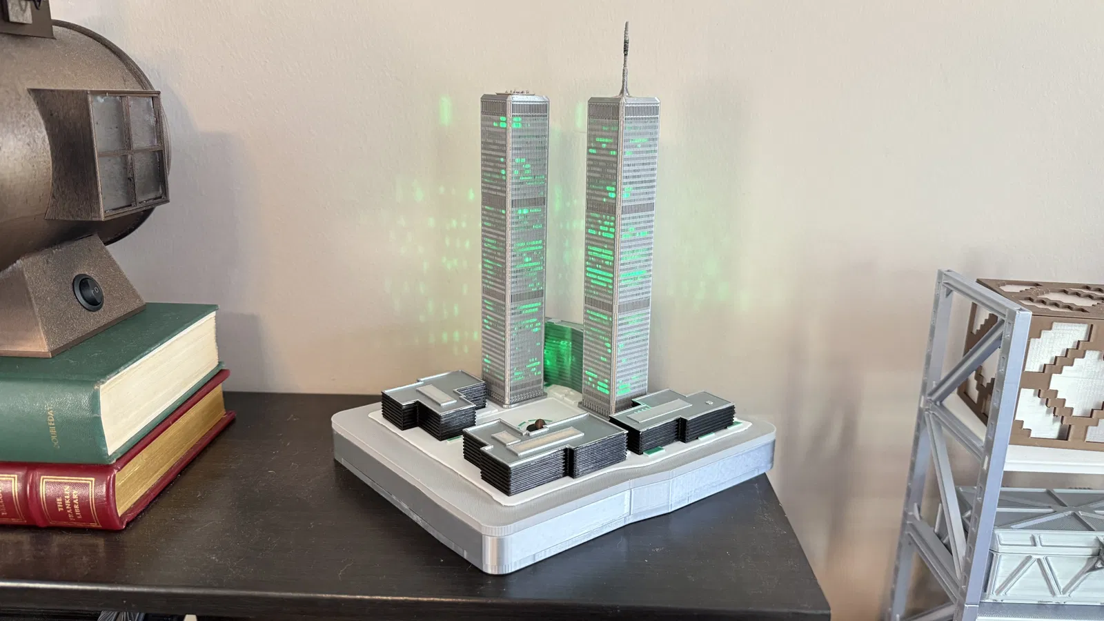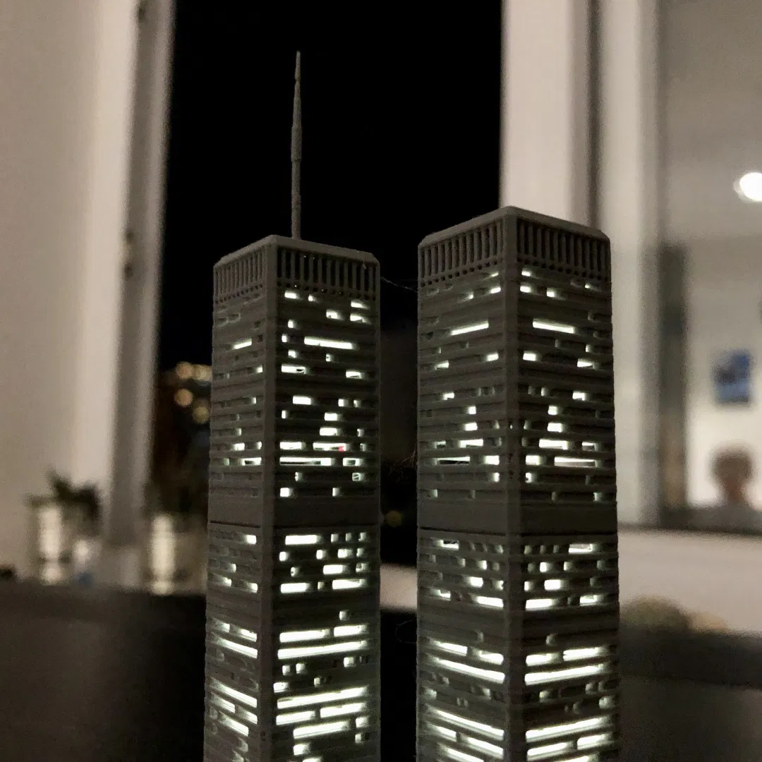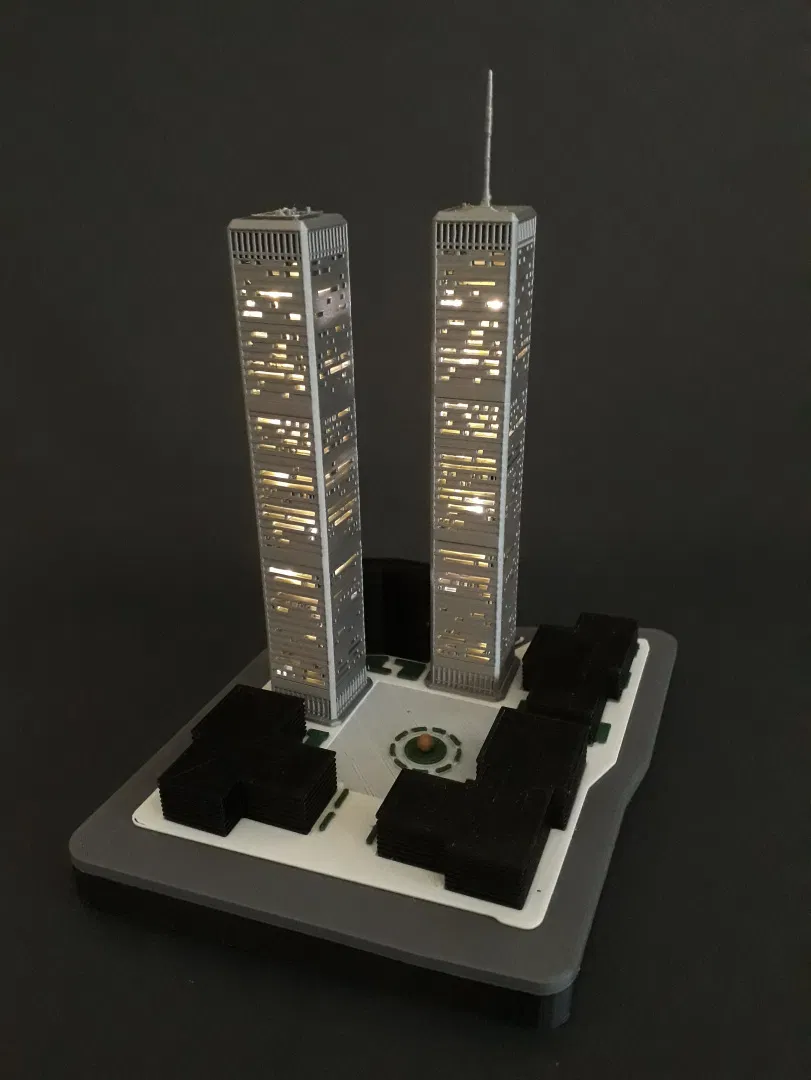 Mô hình này được tạo bởi người sáng lập MiniWorld3D là Dany Sánchez. Sản phẩm còn bao gồm một phần đế có thể che giấu pin và dây cáp, mô tả chi tiết khu phức hợp WTC ban đầu và quảng trường Austin J. Tobin, thực hiện với sự cộng tác của José Luis Ruiz López. File dự án Bambu Studio 3mf do Dean Schulz thực hiện với các đối tượng được chia theo màu sắc và phần đế có khe cắm dây đèn.
