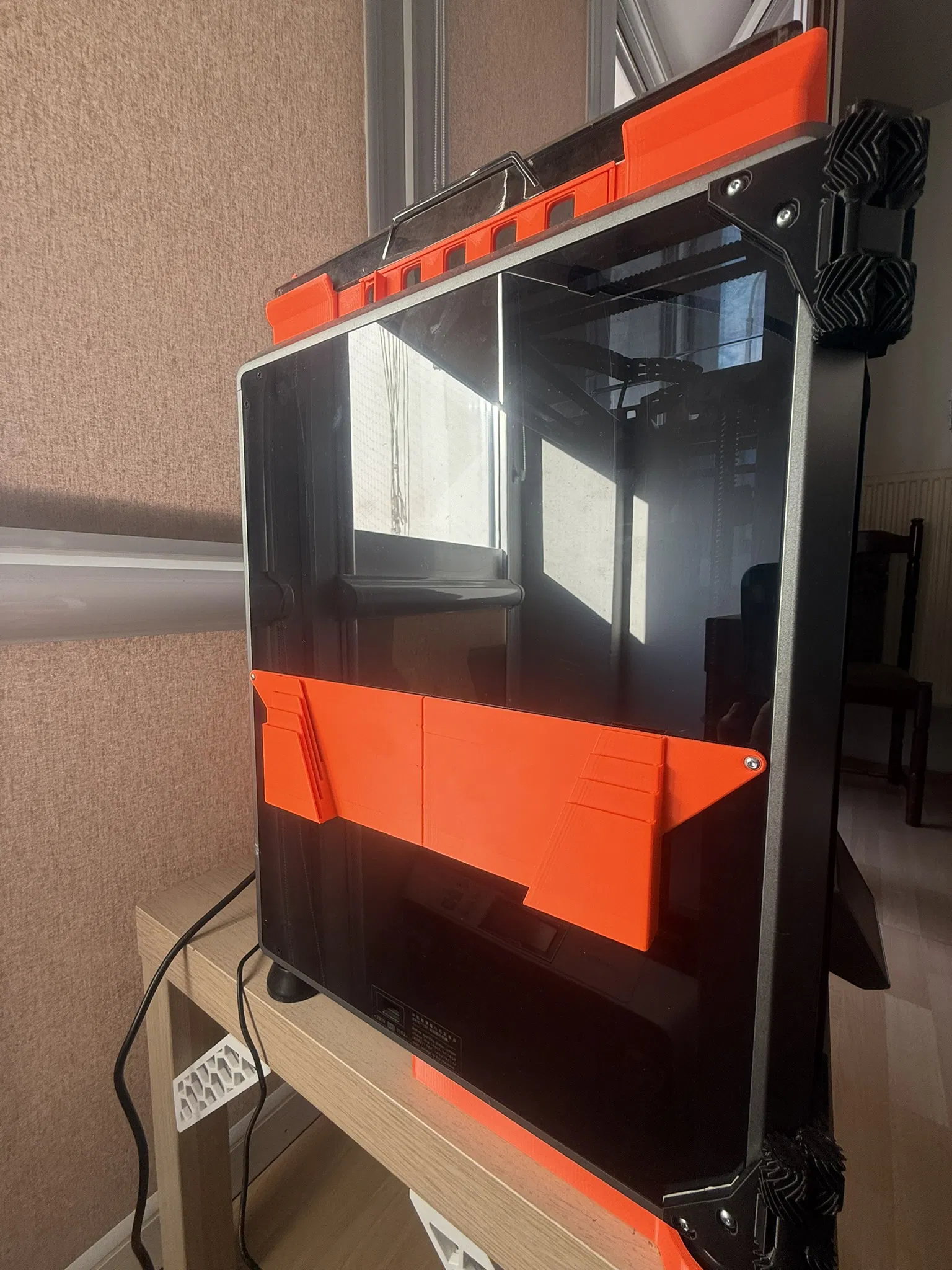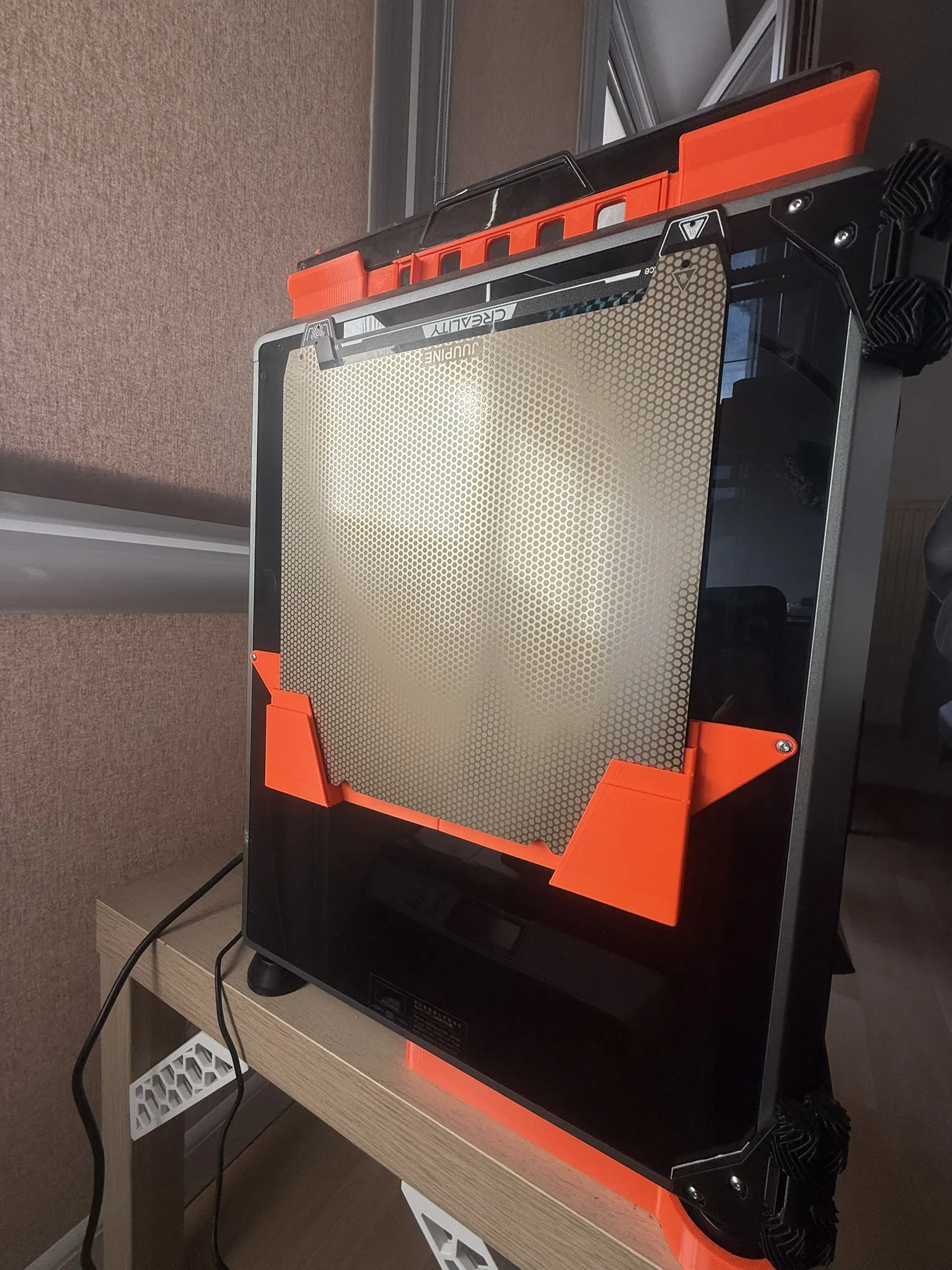 Holder gắn hông bên trái cho Creality K1C, chứa 4 tấm build plate để lấy nhanh. Bắt bằng 2 vít M3x7mm. Có file 3MF nguyên khối, bản đã cắt đôi kèm plugs (OrcaSlicer) và file STEP để remix.