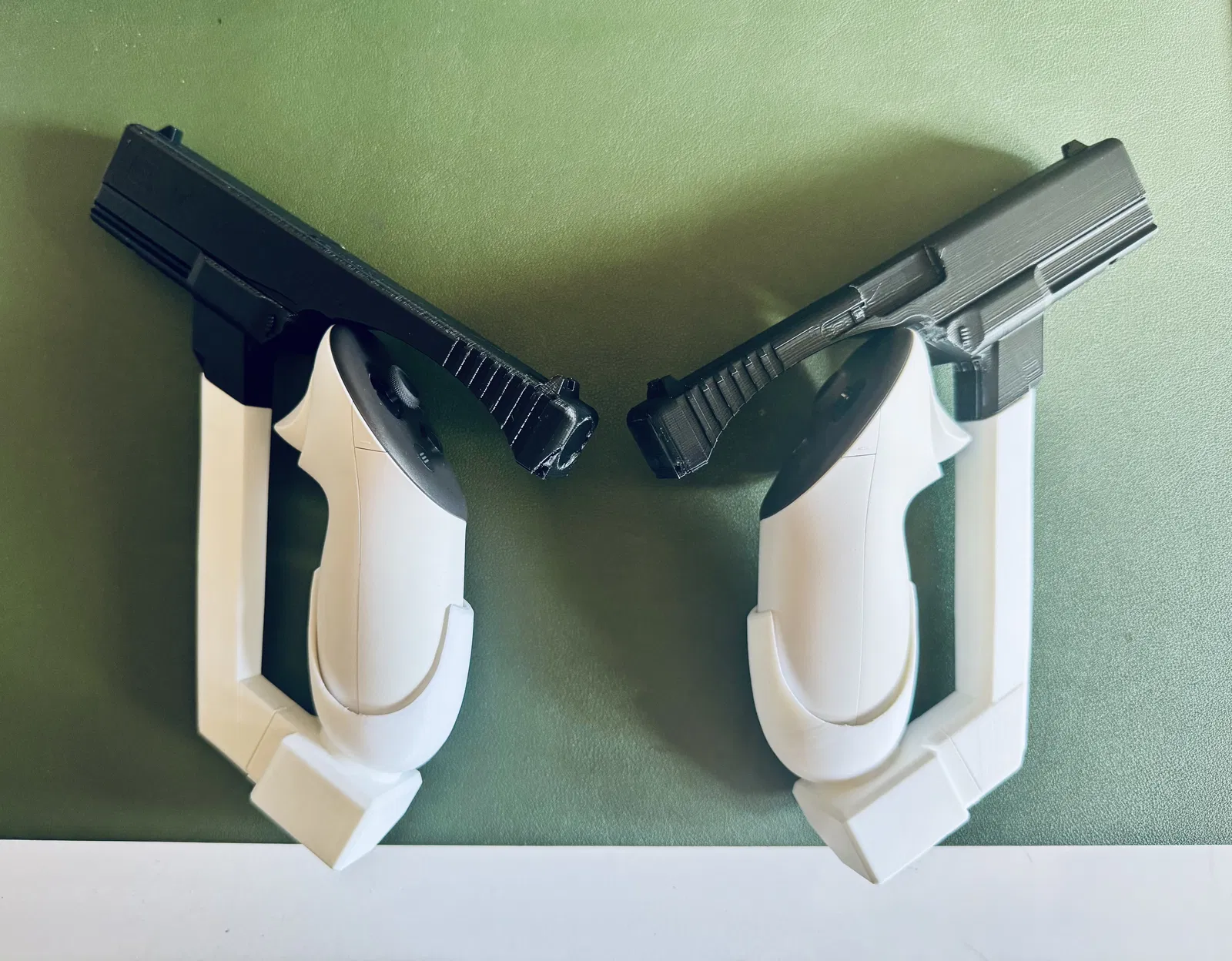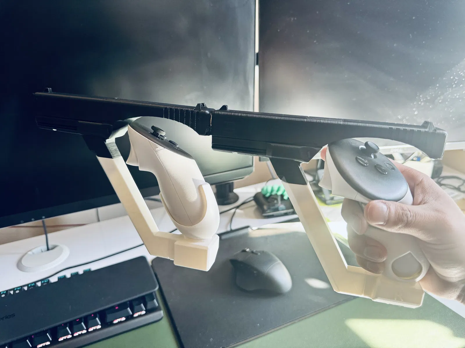 Mình đã kết hợp mô hình súng Glock với bản thiết kế lại của báng súng (gunstock) Quest 3 để tạo ra một bản VR mod cực chất (link bên dưới). Trong hầu hết các tựa game bắn súng VR, độ chính xác và linh hoạt là quan trọng nhất. Thiết kế của mình cho phép chuyển đổi nhanh giữa việc di chuyển tự do và cầm nắm ổn định, chắc chắn—nhờ vào nam châm và miếng dán kim loại đơn giản giúp bạn gắn kết hai tay cầm lại với nhau ngay tức thì khi cần.