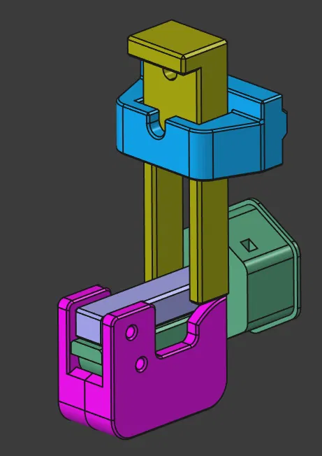 Sau khi lắp skirt insert, gắn cam vào bằng cách đẩy một đoạn nhựa ngắn qua lỗ dưới cùng của cam và lỗ tương ứng trên skirt insert. Tiếp theo, gắn thanh đẩy bằng một đoạn nhựa khác. Mình khuyên bạn không nên cắt tỉa sợi nhựa quá sát để sau này dễ tháo lắp hơn. Cuối cùng, lắp phần ngàm gắn thanh nhôm (extrusion mount) một cách lỏng lẻo bằng vít M3x8 và đai ốc roll-in. Chèn thanh nâng (lift bar) vào, canh chỉnh ngàm sao cho càng gạt nằm ngay chính giữa thanh đẩy rồi siết chặt vít lại. Bộ phận hoàn thiện sẽ trông giống như hình bên dưới.