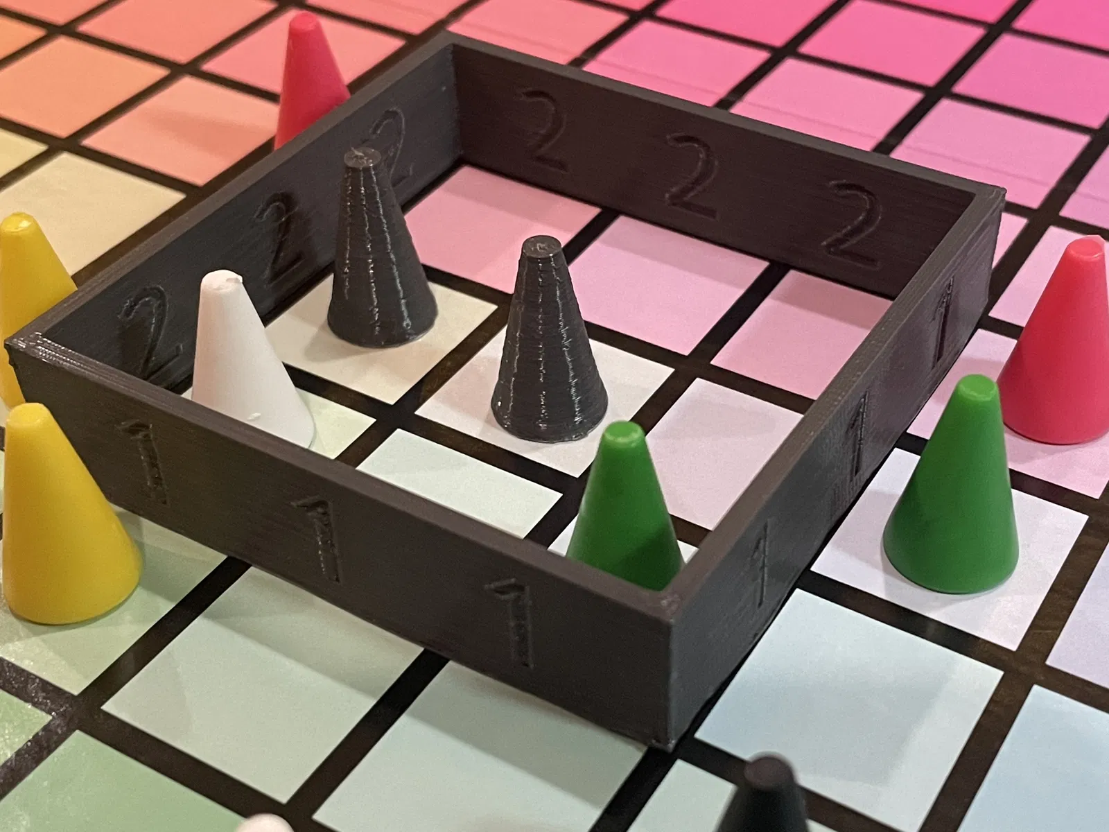 Phần hàng rào (fence) gốc của trò Hues and Cues làm bằng bìa cứng nên rất dễ bị dập nát. Hàng rào đi kèm ở đây là sự thay thế cực kỳ bền chắc.