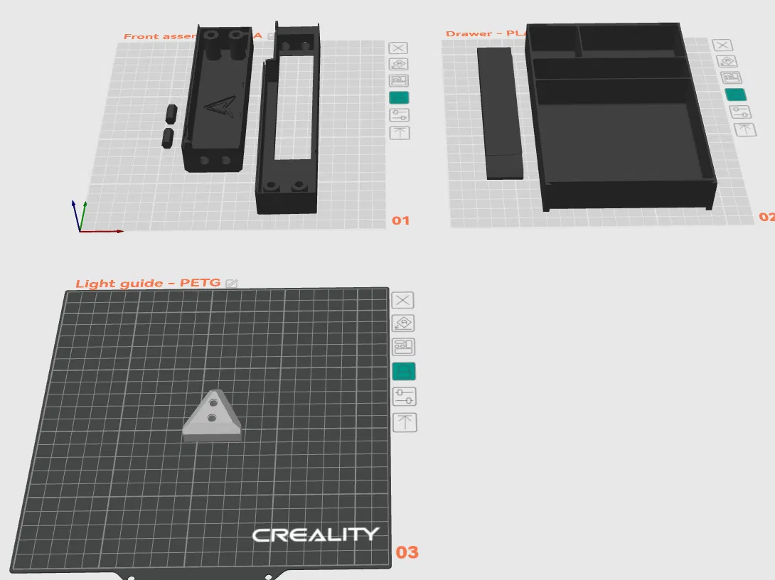 Mình dùng OrcaSlicer với layer height 0.2mm (trừ phần left - xem lưu ý trên), infill 10% kiểu cubic, nhiệt độ 230/60 cho đầu in/bàn in. Dùng nhựa Black eSUN PLA-Matte cho thân máy và Creality CR-PETG cho thanh dẫn sáng.