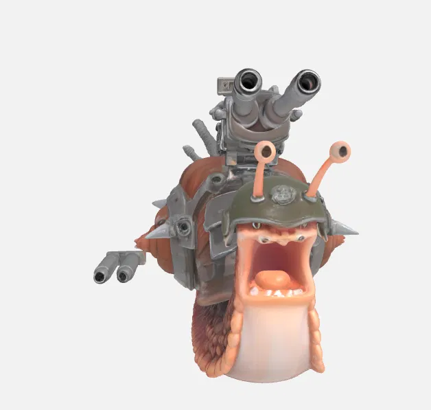 Thiết kế của chú ốc sên này không chỉ dừng lại ở phần thân mà còn được trang bị "vũ khí hạng nặng" trên vỏ. Những chi tiết như khẩu đại bác đặt trên lưng, các đai ốp kim loại gia cố và những chiếc gai nhọn phía sau vỏ tạo nên một phong cách chiến đấu đầy kịch tính. Bạn có thể sử dụng mô hình này để trang trí kệ sách, bàn máy tính hoặc làm món quà tặng độc đáo cho bạn bè có cùng sở thích về mô hình giả tưởng. Sự tỉ mỉ trong từng nếp nhăn trên da ốc sên cùng với các chi tiết cơ khí cứng cáp mang lại cảm giác chân thực và rất có chiều sâu cho sản phẩm sau khi in xong.