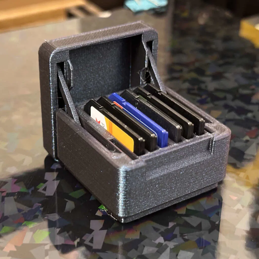 Hộp đựng thẻ SD cỡ lớn có bản lề, chứa được 6 thẻ SD. Thiết kế được tối ưu để đặt vừa vặn trên đế Gridfinity, thay thế các khe micro SD bằng không gian cho thẻ SD tiêu chuẩn.