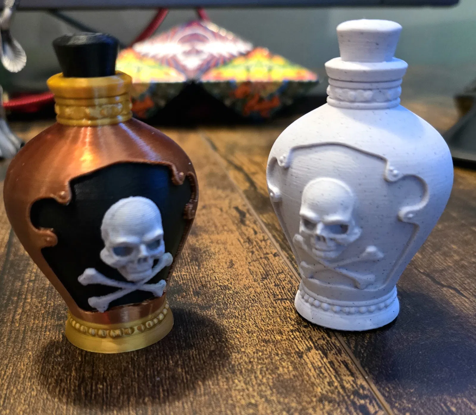 Sản phẩm này được thiết kế với độ chi tiết cao, đặc biệt là phần phù hiệu đầu lâu nổi bật ở chính giữa thân lọ. Bạn có thể tận dụng các máy in 3D đa màu như MMU3 để tạo ra những bản in phối màu cực kỳ bắt mắt như hình mẫu, giúp làm nổi bật các chi tiết từ cổ chai cho đến phần thân. Nếu bạn chỉ sở hữu máy in đơn màu, chúng ta hoàn toàn có thể in từng phần riêng lẻ rồi lắp ghép lại, hoặc đơn giản là sơn thủ công để tạo nên phong cách độc đáo của riêng mình.