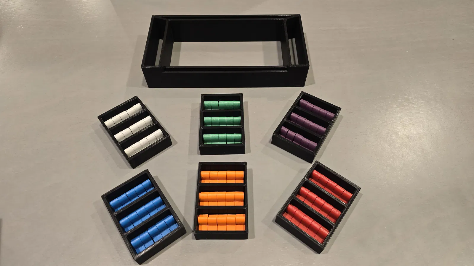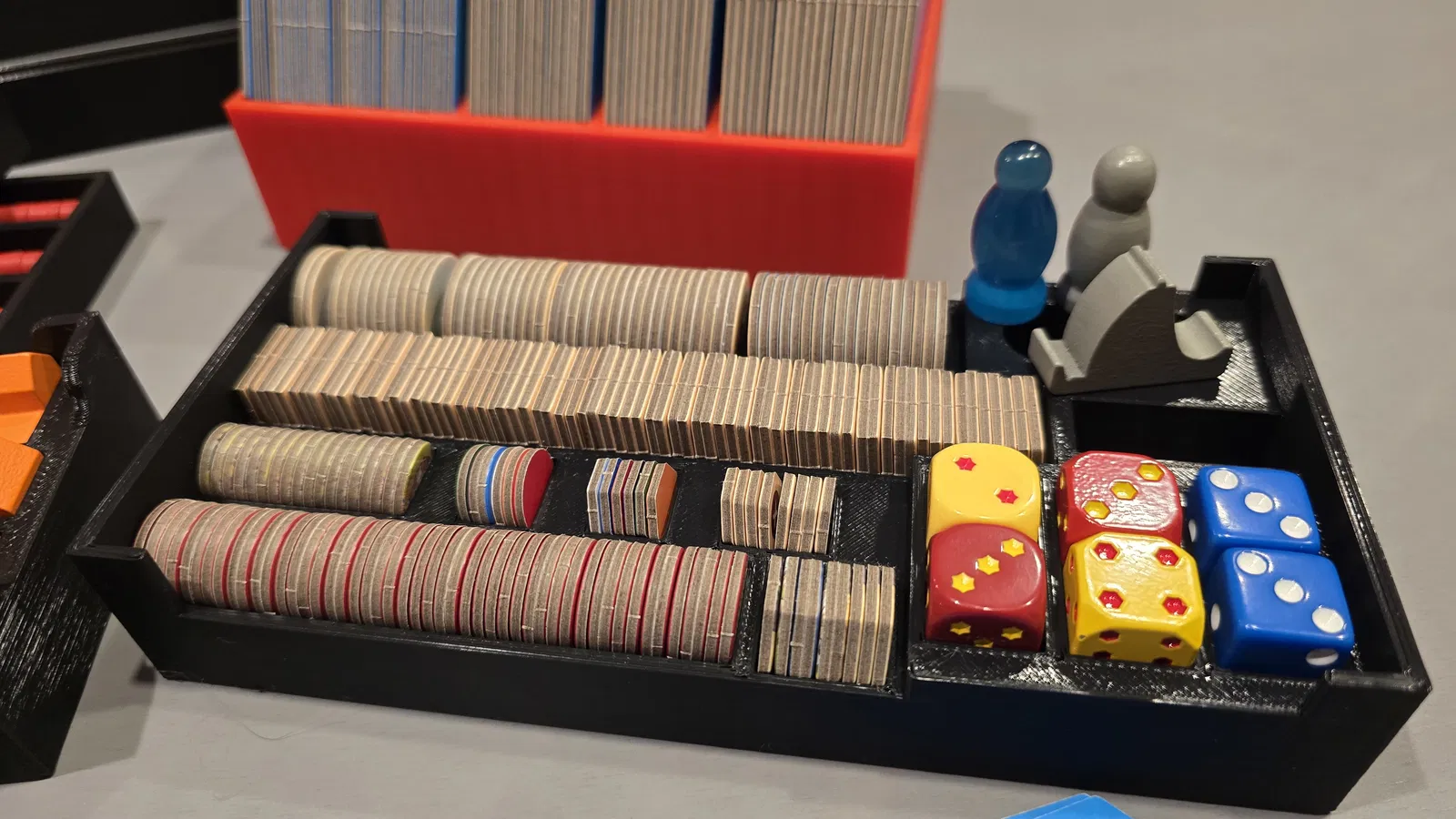 Giải pháp lưu trữ in 3D này giúp gom tất cả thành phần vào trong chiếc hộp đỏ Catan 6th Edition, vừa tiết kiệm diện tích lại vừa giúp việc thiết lập và dọn dẹp sau khi chơi trở nên nhanh chóng hơn. Mình tự tay thiết kế món này bằng Tinkercad, nó giúp sắp xếp các ô bản đồ, thẻ bài, tàu và quân cờ của bạn cực kỳ gọn gàng, giúp những buổi chơi game của mọi người mượt mà và thú vị hơn nhiều! Thậm chí còn có chỗ để đựng cả con cướp FanRoll Gemstone và xúc xắc kim loại nữa đó!