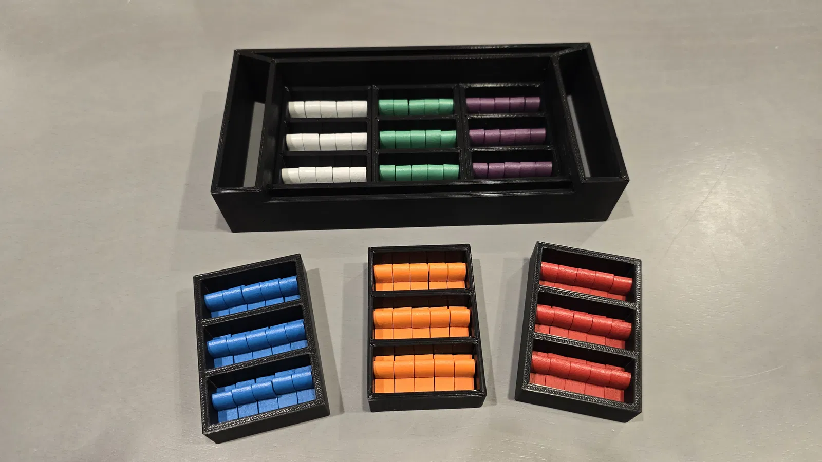 Mình có đính kèm 2 file cho khay đựng thẻ. Gia đình mình thì thích dùng 4 khay, mỗi bên bàn 2 khay nên mình dùng file “Card Tray x4”, nhưng mình biết có một số người chơi thích có “ngân hàng” riêng nên có thể dùng “Card Tray x2” và in 2 cái thay vì 4. Cả hai cách này đều đảm bảo khay nằm phẳng bằng với các khay khác.