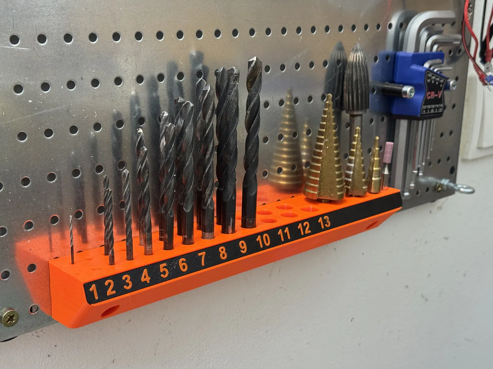 Giá đỡ mũi khoan tùy chỉnh được dành cho các loại mũi có đường kính từ 1 đến 13 mm. Thiết kế thông minh với các khe cắm chuyên dụng, hỗ trợ gắn lên bảng pegboard Küpper hoặc bắt vít trực tiếp lên tường. File STEP được cung cấp để bạn dễ dàng tùy biến.