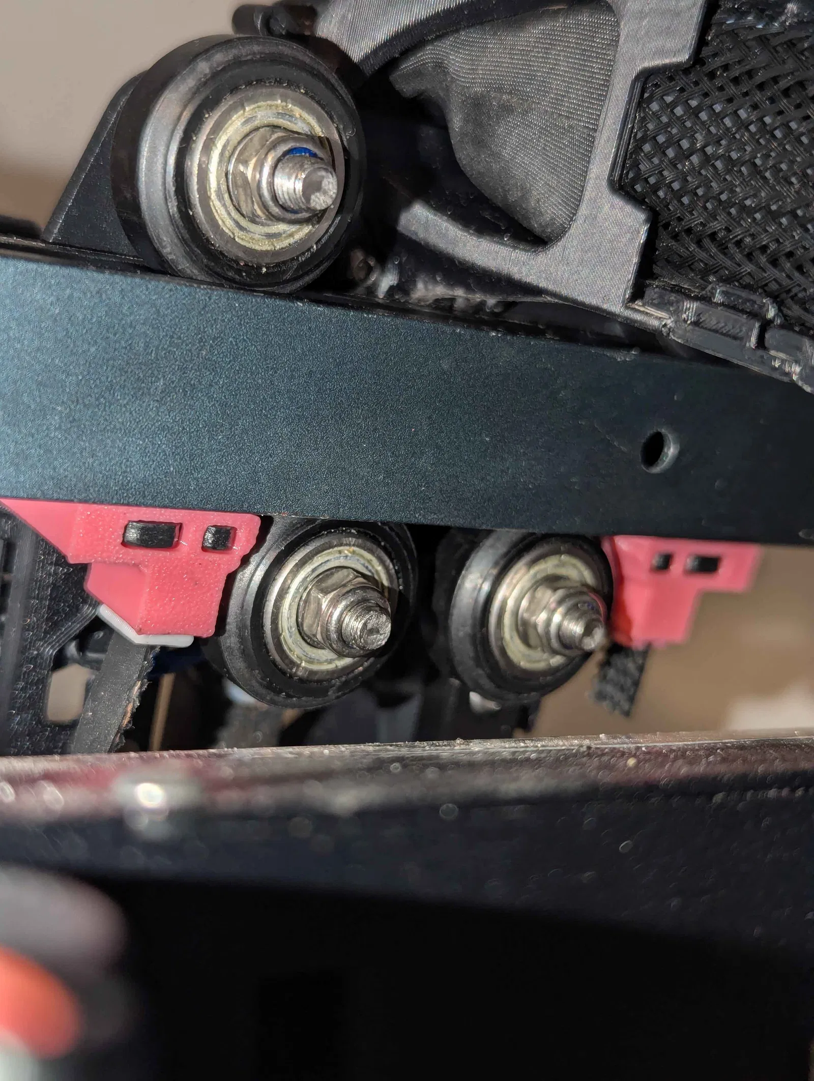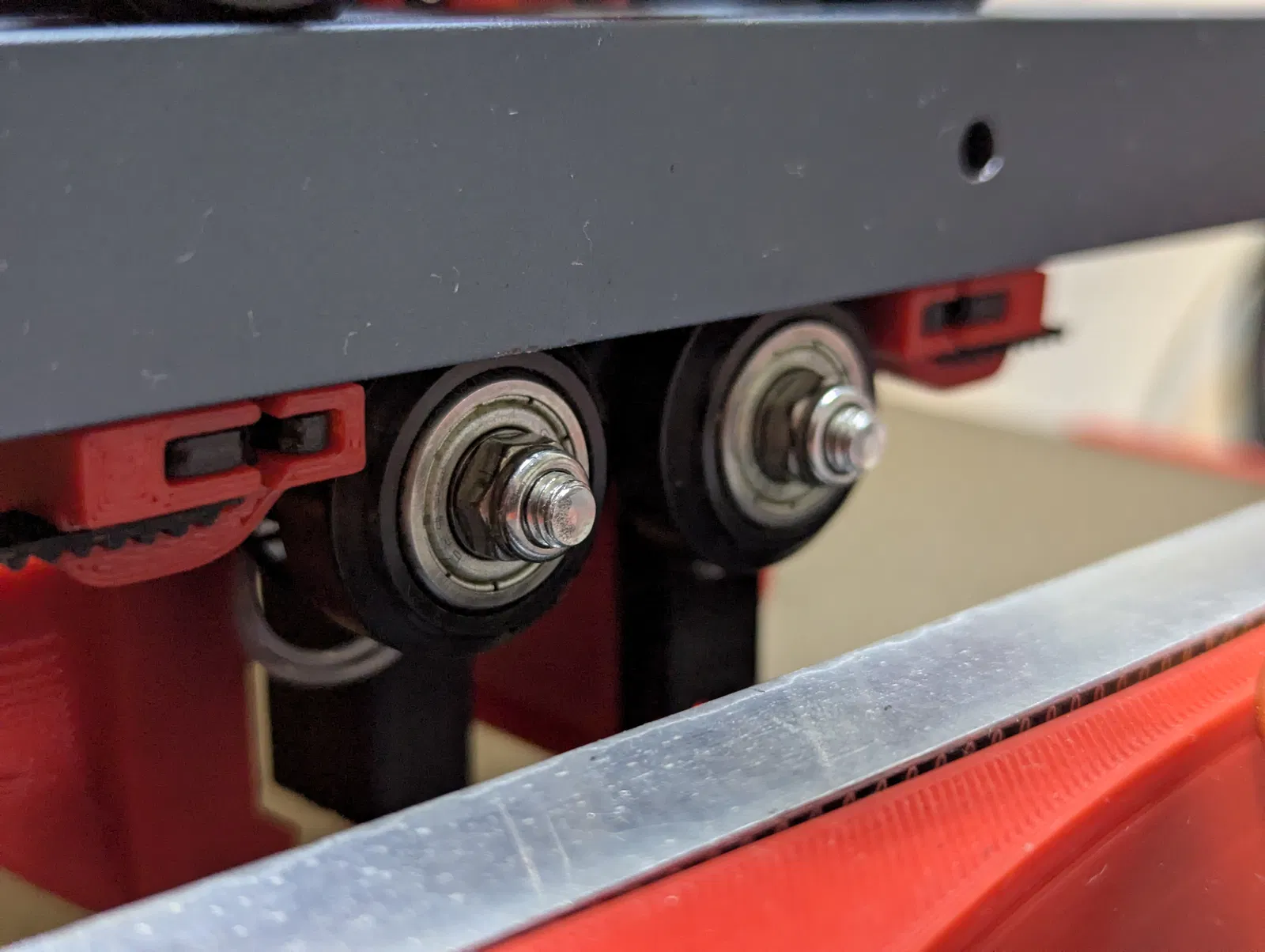 Tách rời linh kiện và bỏ phần cầu nối. Tháo dây đai zin, sau đó tháo các bánh lăn Sg15 phía dưới bằng đai ốc lệch tâm. Sau đó, bạn có thể tháo phần dưới của carriage và lắp các ngàm như trong hình. Luồn dây đai mới qua các puly và lắp vào; nếu dây hơi dài, bạn không nhất thiết phải cắt vì vẫn còn chỗ trống. Khi dây đai đã nằm đúng vị trí với độ chùng vừa phải, hãy bắt vít lại carriage.