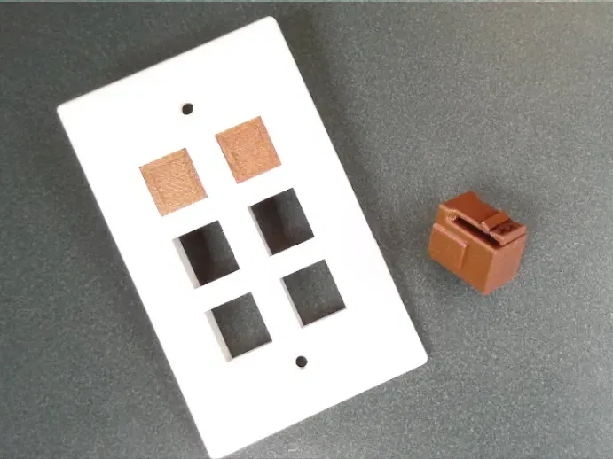 Đây là một miếng chèn trống keystone cho một jack keystone trong một tấm tường hoặc bảng keystone. Có nhiều loại khác có sẵn; cái này in ra một cách độc đáo và tôi sử dụng nó như một mô hình cơ sở cho các bộ chuyển đổi chuyên biệt. Máy in của tôi có đầu phun 0. 6mm, vì vậy tôi in những cái này với chiều cao lớp 0. 4mm và độ đặc 100%. Đối với các đầu phun nhỏ hơn, chiều cao lớp 0. 3mm hoặc 0. 2mm có thể hoạt động tốt hơn. Có một số phần nhô ra trong mô hình, nhưng chúng dường như in ra rất tốt mà không cần vật liệu hỗ trợ khi sử dụng các cài đặt cầu tiêu chuẩn. Tôi thường sử dụng filament PETG vì nó có thể chịu đựng được sự linh hoạt trên thành phần chốt tốt hơn so với các vật liệu khác như PLA. Mô hình bao gồm một “tab hỗ trợ” giữa chốt keystone và bề mặt in; sau khi in, bạn có thể cắt hoặc bẻ bỏ tab này để lộ ra chốt. Các đường lớp không lý tưởng cho chốt – nó có thể gãy nếu bị căng quá mức, nhưng sau khi in và thử nghiệm hàng chục cái như vậy, tôi chỉ gặp một chốt gãy (khi tôi cố gắng lắp đặt nó sai cách). Các bộ chuyển đổi keystone khác: