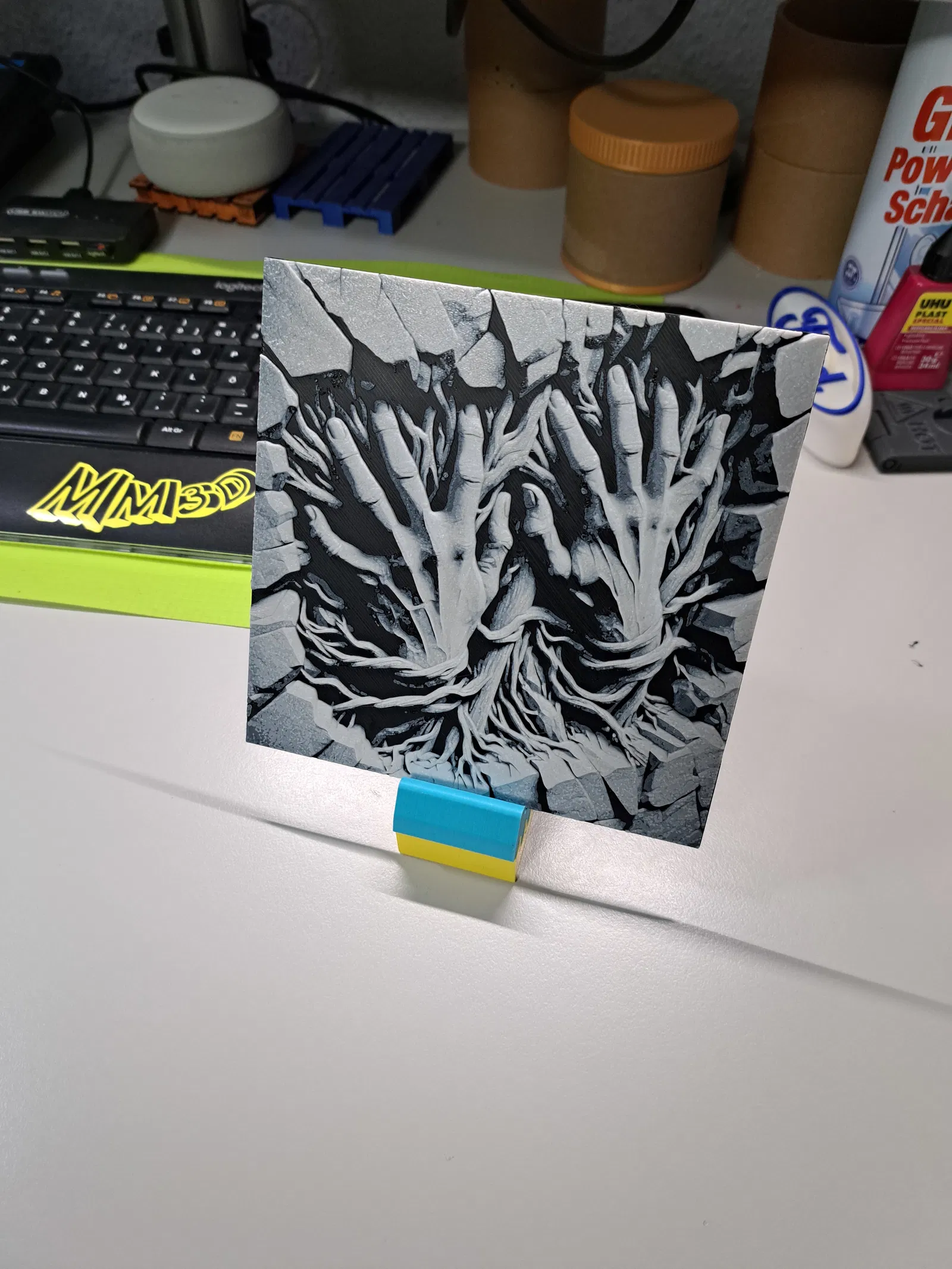 Tác phẩm nghệ thuật HueForge độc đáo với hình ảnh đôi bàn tay xé toạc bức tường nứt, tạo hiệu ứng 3D sống động. Phù hợp trang trí không gian theo phong cách ma mị, đầy ấn tượng cho người đam mê in 3D.