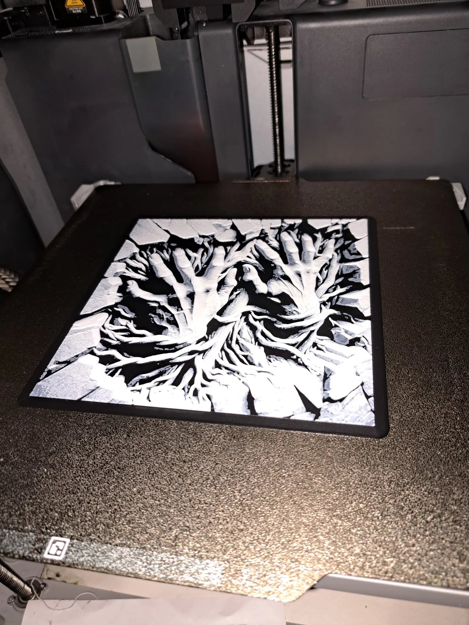 Tác phẩm HueForge này mô tả đôi bàn tay đang xé toạc bức tường nứt, tạo nên hiệu ứng 3D đầy kịch tính và có chiều sâu. Mô hình tận dụng sự tương phản mạnh mẽ giữa các lớp màu tối và sáng để làm nổi bật bề mặt bị rạn nứt cùng các hình khối hữu cơ đang trồi ra. Sau khi in xong, thiết kế này sẽ tạo thành một bức tranh phù điêu ấn tượng, rất phù hợp để trang trí trên bàn làm việc, kệ sách hoặc treo tường. Đây là một ví dụ tuyệt vời cho thấy cách các bản in phong cách HueForge có thể biến những lớp nhựa đơn giản thành những tác phẩm nghệ thuật đầy chi tiết. Rất lý tưởng cho những ai yêu thích các bản in mang phong cách đen tối, nghệ thuật trang trí hoặc các dự án in 3D thử nghiệm. Mô hình có kích thước 150x150mm. Hướng dẫn đổi màu: Bắt đầu với màu Đen (Black). Tại lớp thứ 7 (0.72mm) đổi sang màu Be (Beige). Tại lớp thứ 14 (1.28mm) đổi sang màu Trắng ngọc (Jade White) cho đến hết.