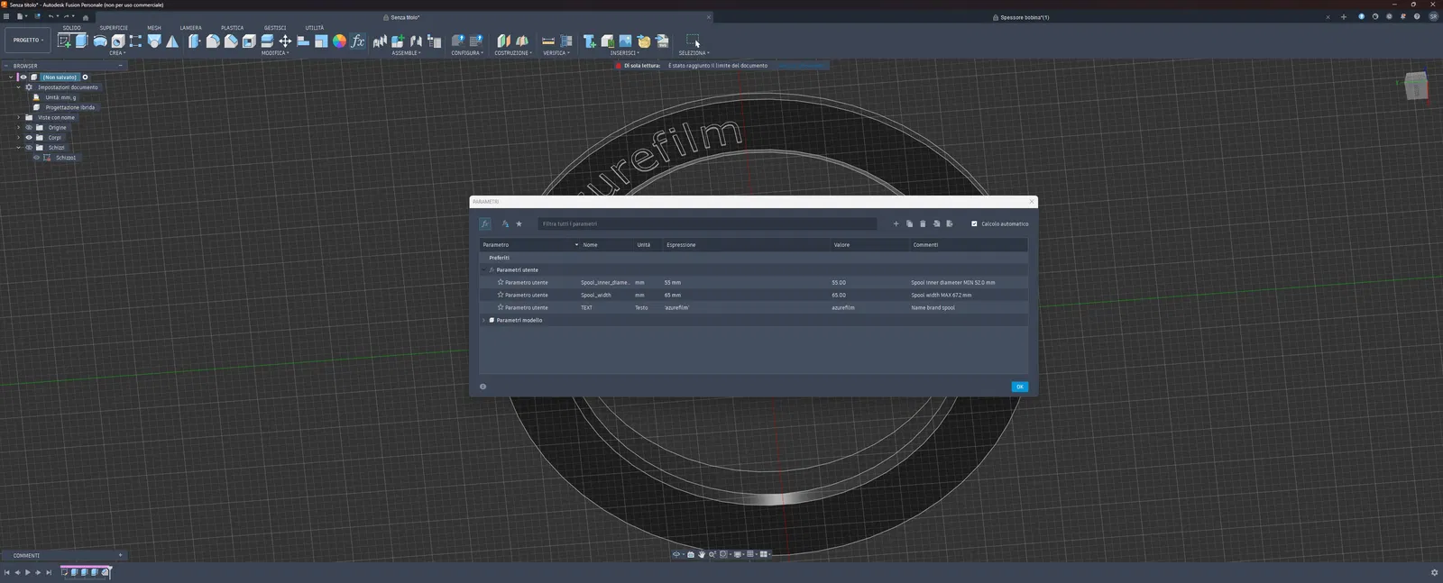 Thiết kế tham số trên Autodesk Fusion dành cho bộ chuyển đổi cuộn nhựa Filament Storage 2026 của GunplaMark, cho phép tùy chỉnh linh hoạt kích thước để phù hợp với nhiều loại cuộn in khác nhau, giúp quá trình in ấn ổn định và chuẩn xác hơn.
