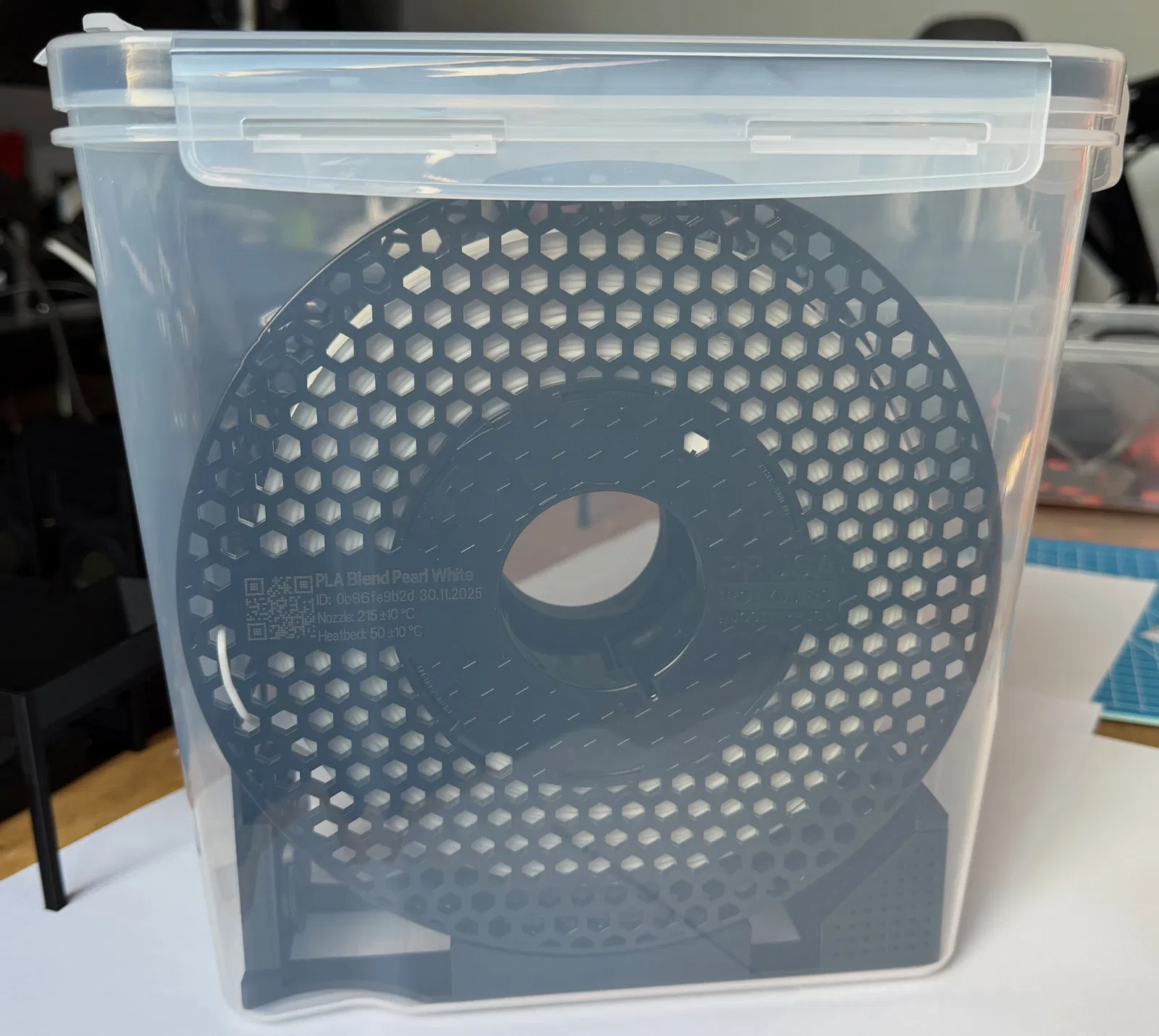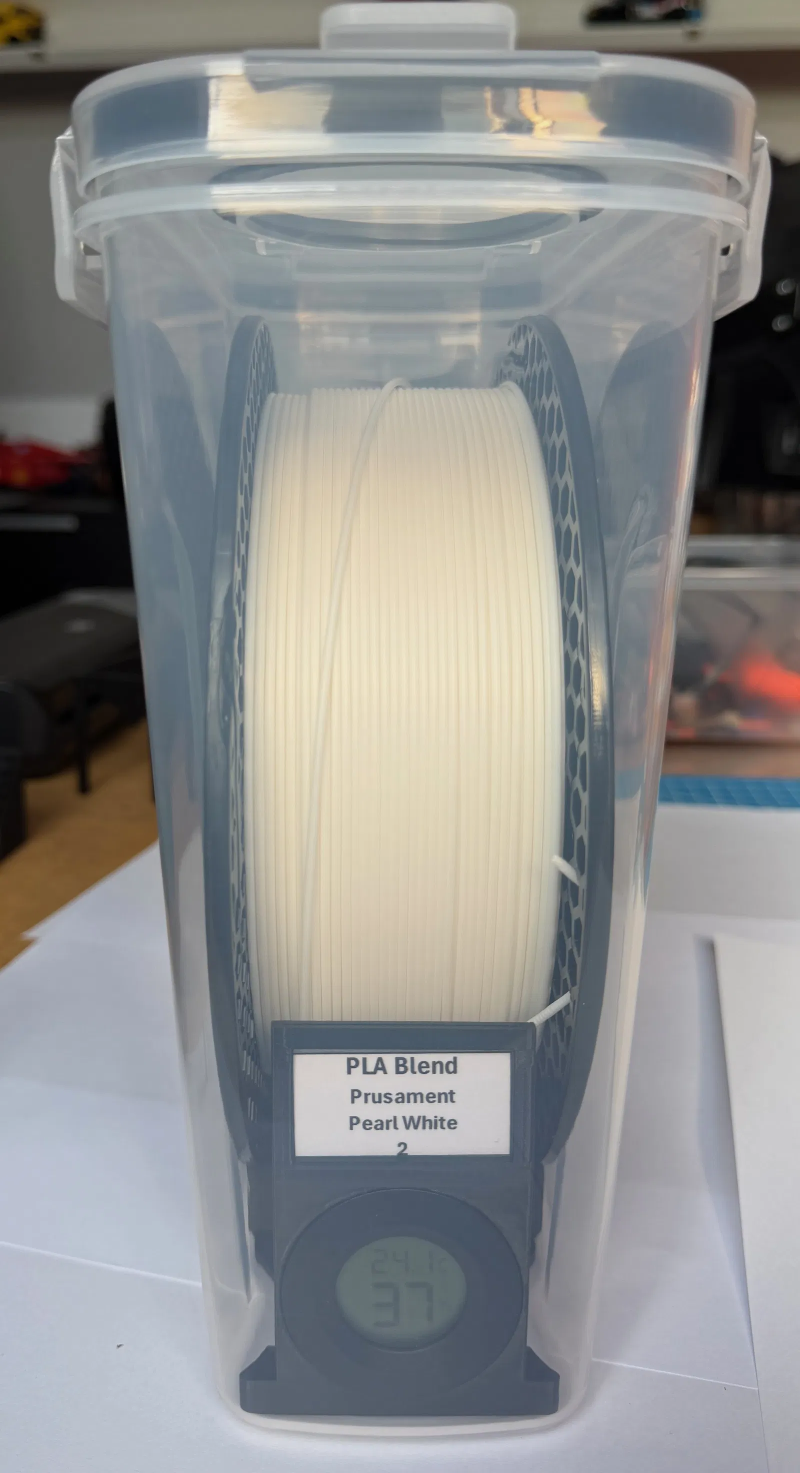 Hộp đựng nhựa in filament tích hợp khay hút ẩm và đồng hồ đo độ ẩm.