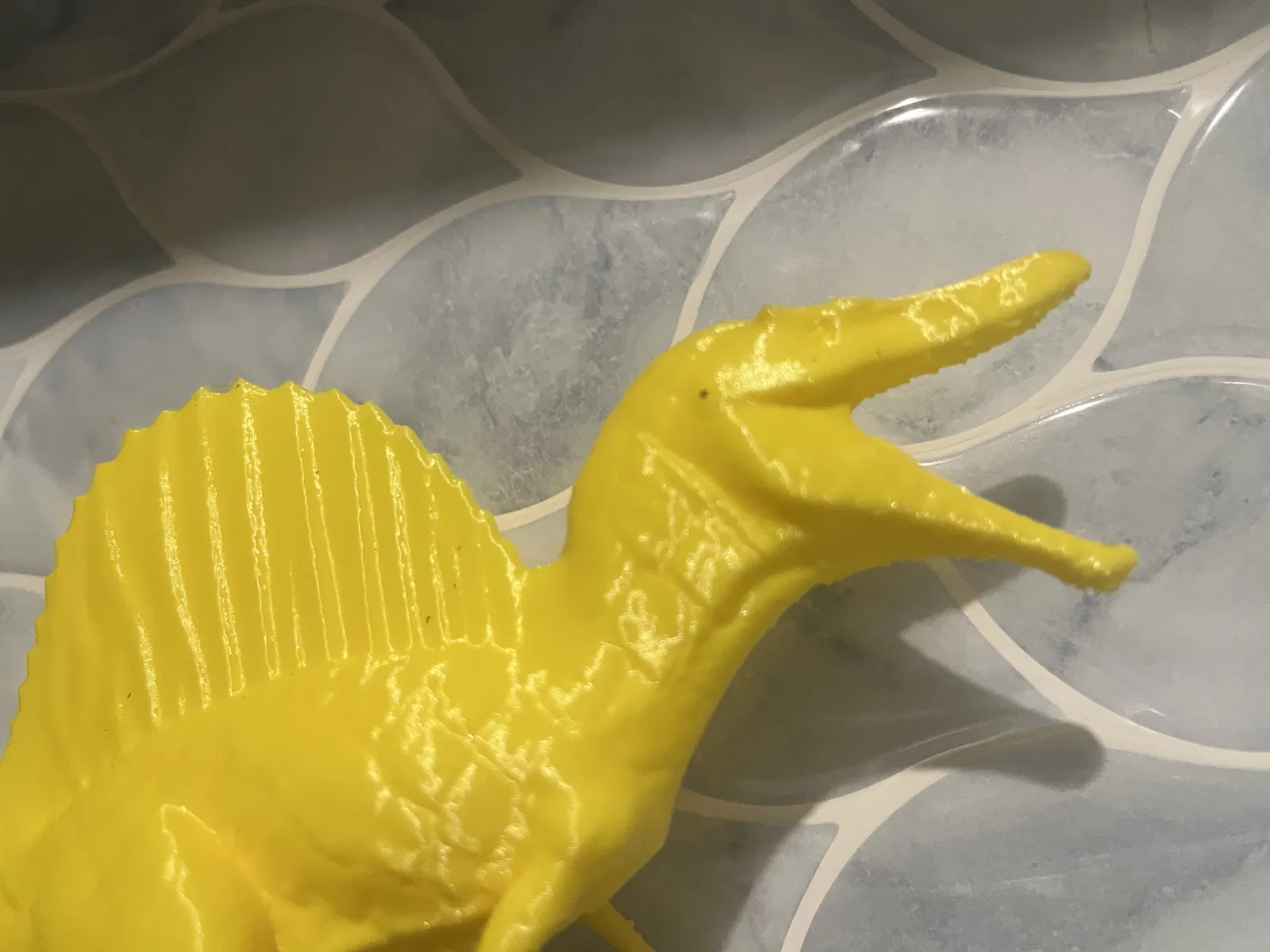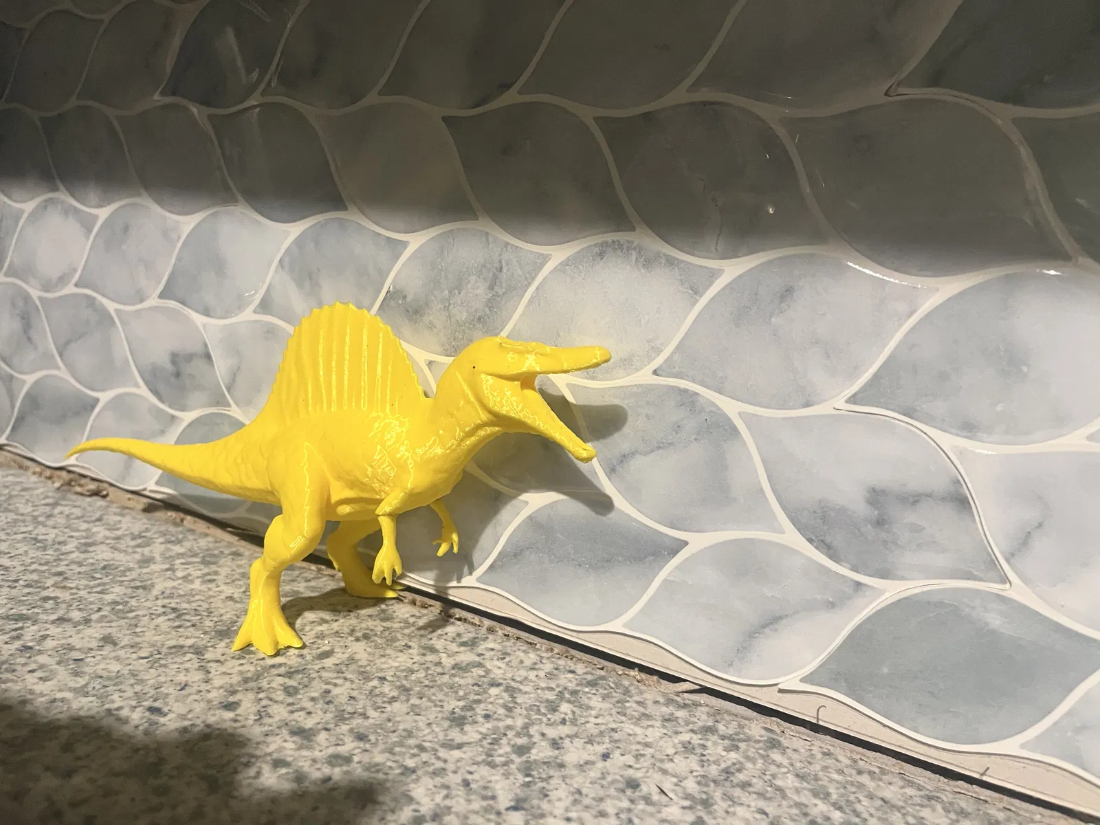 In ấn với support. Mình đã tăng tỉ lệ mô hình lên để phần tay trông dày dặn hơn một chút. Quy trình thực hiện: Dùng Chatgpt tạo ảnh với câu lệnh: "Create a standing Spinosaurus with a white background". Sau đó, mình lấy ảnh này đưa vào công cụ Rodin AI miễn phí để tạo file in từ hình ảnh. Tiếp theo, mình đưa file STL đó vào Blender, thêm các lớp vảy bằng cọ stamp tùy chỉnh, thêm mắt và làm sạch các vùng bị low poly. Đây là một bài thử nghiệm thú vị. Mình đang học cách làm quen với các công cụ AI, tuy nhiên mình nhận thấy bản thân không có sự gắn kết cảm xúc với sản phẩm tạo ra. Cảm giác cũng giống như việc dùng một mô hình đã có sẵn trên mạng vậy. Mình cảm thấy công cụ AI sẽ phát huy tác dụng tốt nhất khi dùng để thêm chi tiết cho các mô hình có sẵn hoặc giảm bớt khối lượng công việc thủ công. Với cách làm này, nó không mang lại nhiều lợi ích hơn so với việc tải một mẫu có sẵn về, nhưng đây vẫn là một trải nghiệm khá vui.