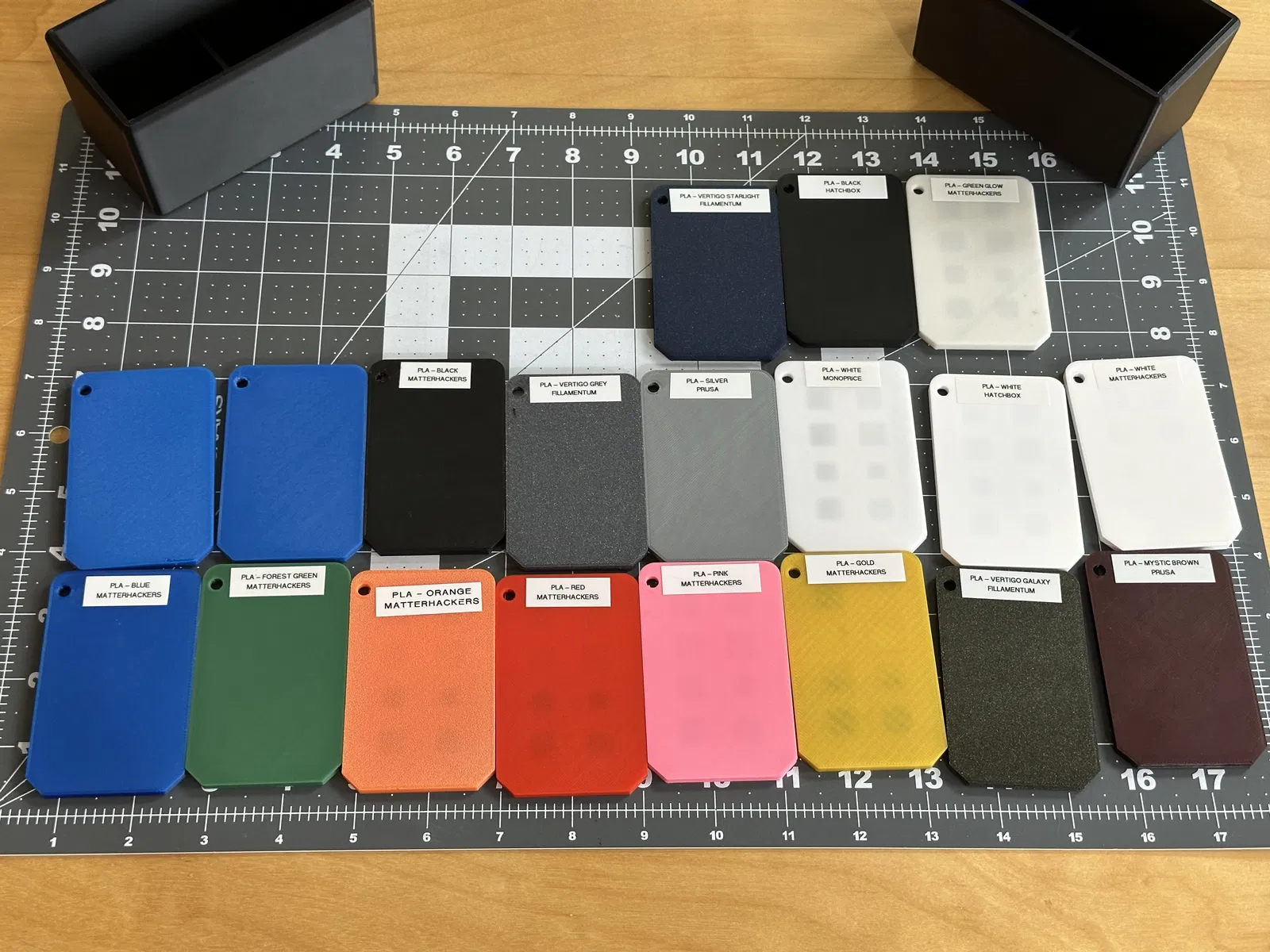 Các thẻ mẫu tùy chỉnh mà mình thường dùng để kiểm tra tính chất của các loại nhựa in mới. Bộ này bao gồm một chiếc hộp có thể chứa được khoảng 24 thẻ.