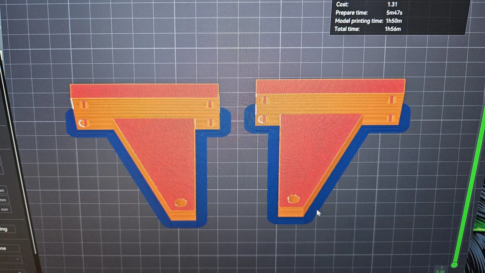 In bằng PLA với 10 lớp vỏ, và 50% độ đầy gyroid, và một vòi phun 0.4mm, hai giá đỡ, tổng cộng là 55g PLA.