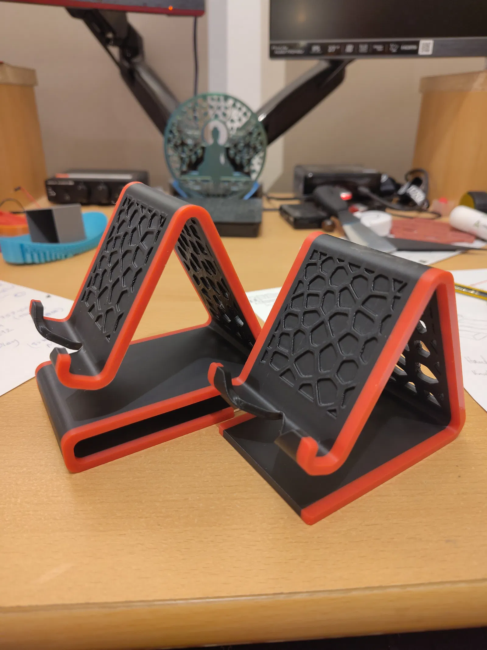 Mình đã tinh chỉnh mẫu Voronoi Mobile Phone Stand V3 của @Epiales bằng cách tăng thêm 16mm chiều cao, giúp bạn cắm cáp USB-C dễ dàng hơn mà không bị cấn. Mẫu này in không cần support, rất thích hợp để làm phụ kiện trang trí bàn làm việc.